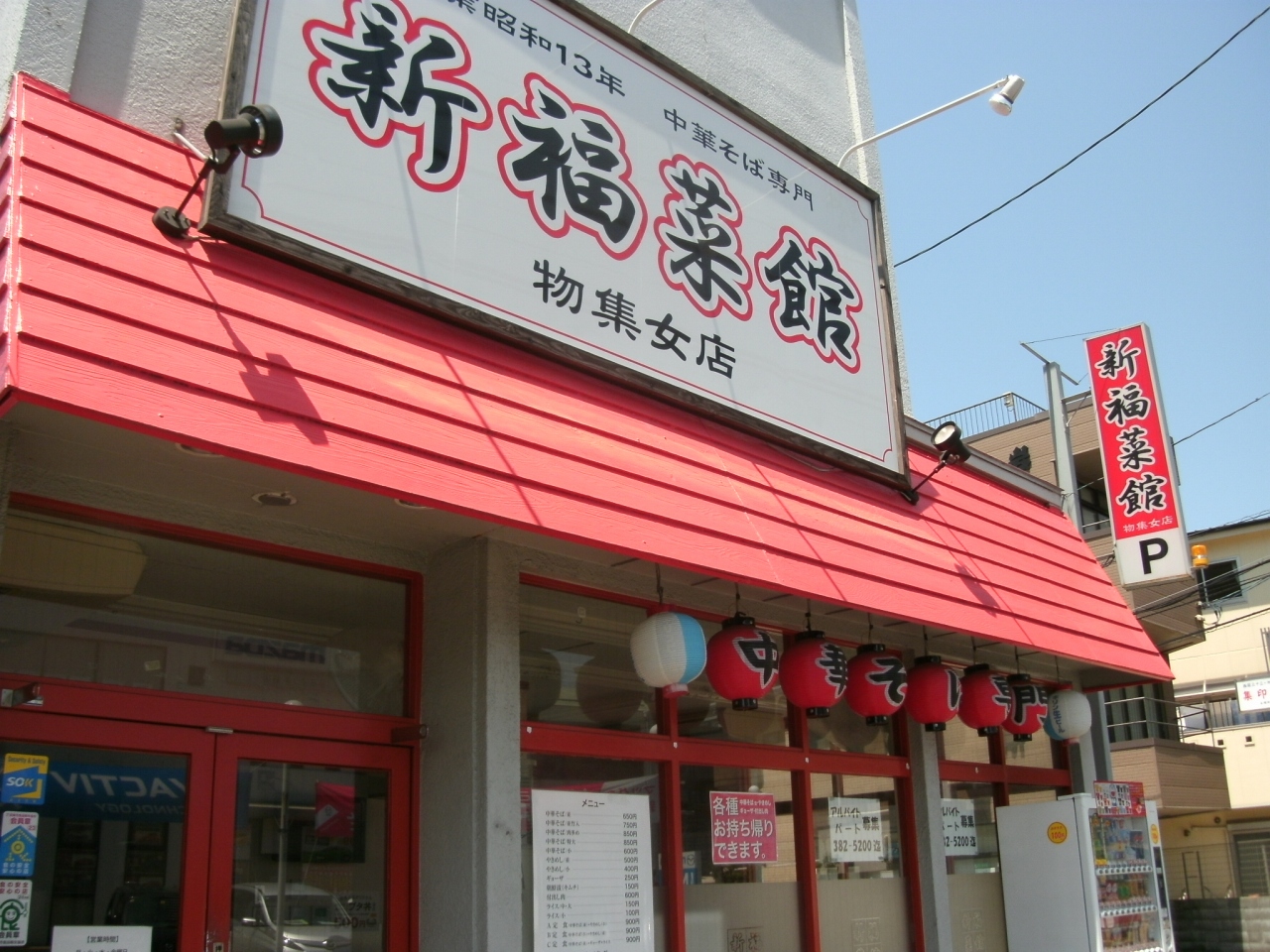 「新福菜館 (物集女店)」さんは、国道9号線と府道67号線(物集女街道)の交差点“千代原口”を北側に行った物集女街道沿いにある中華料理店です。店の北側に数台駐車できるスペースがありました。比較的新しいお店のようで、店内はカウンター席が数席と、テーブル席が3卓ほどあり、綺麗です。店内で食券を買うシステムで、メニューはラーメンとチャーハン、餃子とその組み合わせの定食と、いたつてシンプル。“中華そば並650円”をオーダー。待つ事しばし、届いたラーメンは、少しビックリするぐらいの真っ黒な豚骨ベースで醤油味のスープ、麺は中太ストレートでコシはやや弱め、チャーシューは薄くて脂身が多め。見た目よりも意外とあっさり、それでいてコクと深みのあるスープは麺との相性もよく、美味しかった。