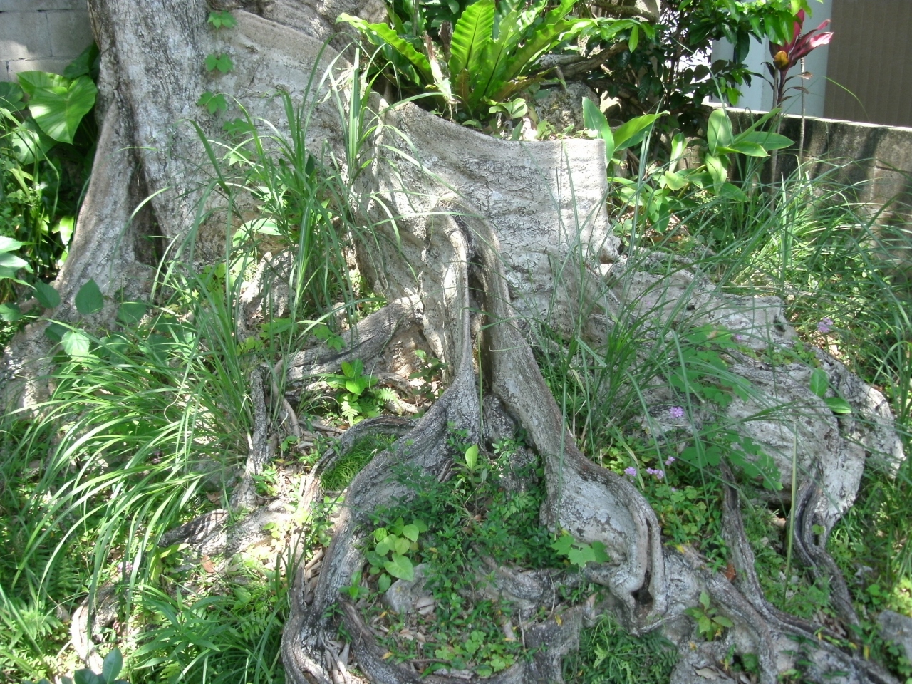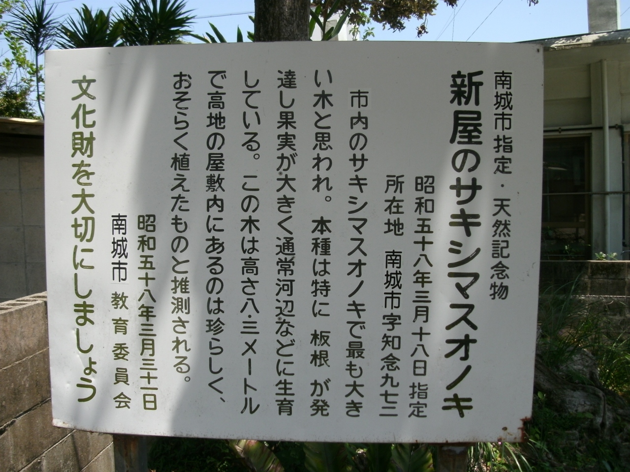 「新屋のサキシマスオウノキ」は、国道331号線の知念のバス停から、北方向に路地を数10mほど入った民家の敷地内にあります。南城市で一番大きなサキシマスオウノキで、高さは約8.3mもあります。大きな板根を持つ、サキシマスオウノキは通常、河辺などに育つものですが、ここの木は高地の敷地内という珍しい場所にあり、恐らく植えられたものと考えられています。南城市の天然記念物に指定されています。民家の敷地内にあるので、みだりに入り込まず、静かに少しはなれたところから見るようにしましょう。