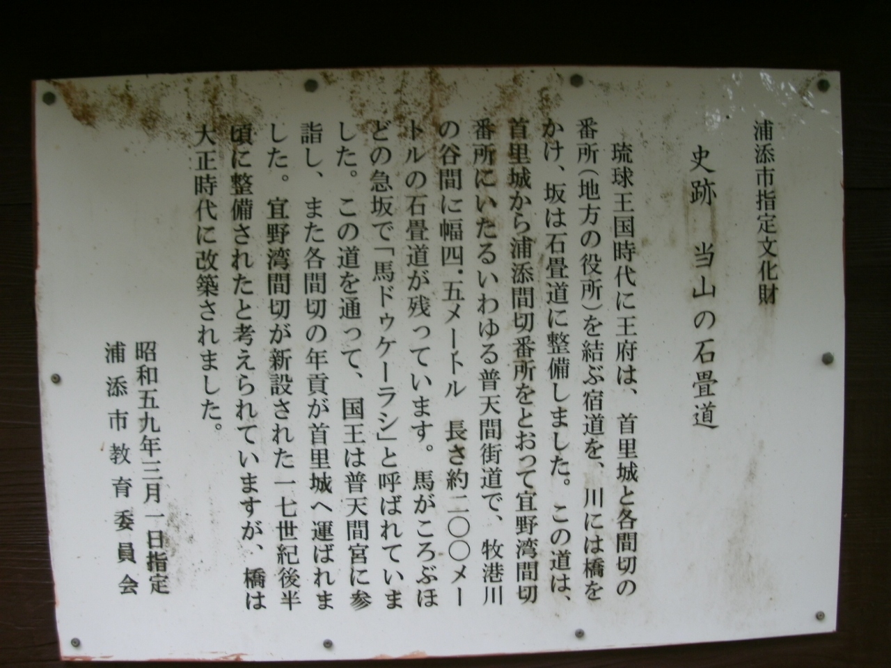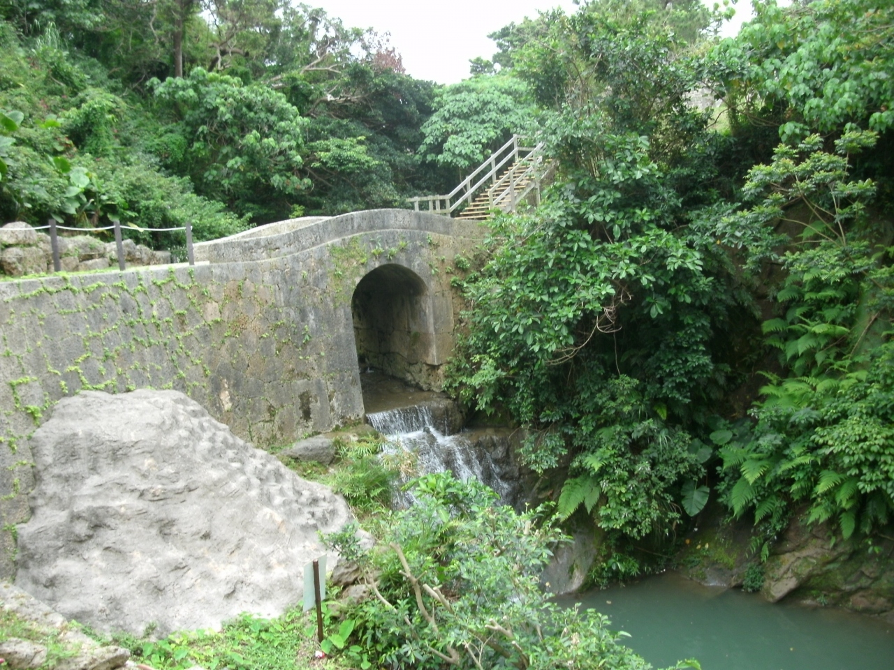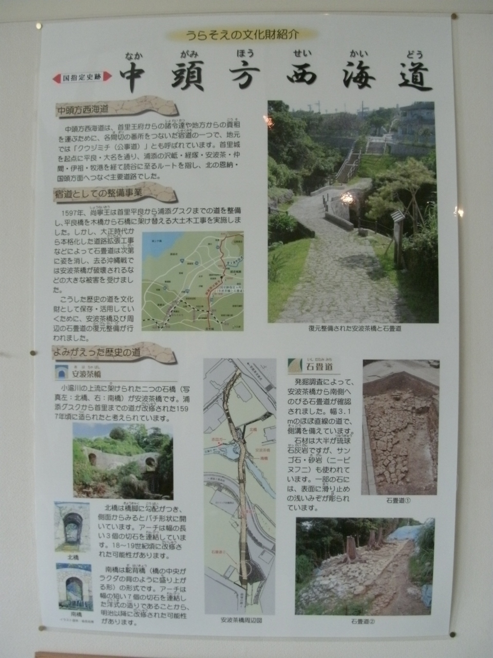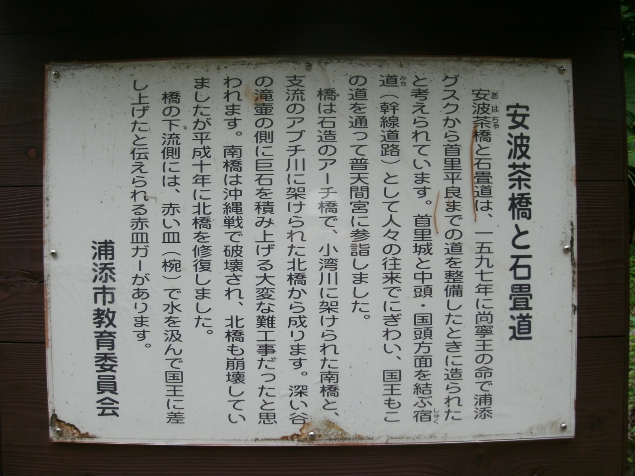 「安波茶橋」は、国道153号線、浦添市の浦添郵便局の近くにあります。案内板には、『安波茶橋と石畳道は、1597年に尚寧王の命で浦添グスクから首里平良までの道を整備したときに造られたと考えられています。首里城と中頭・国頭方面を結ぶ宿道(幹線道路)として人々の往来でにぎわい、国王もこの道を通って普天間に参詣しました。』と説明がありました。橋は石造りのアーチ橋で、小湾川に架けられて南橋と、支流のアブチ川に架けられた北橋から成ります。静かで雰囲気の良いところでした。
