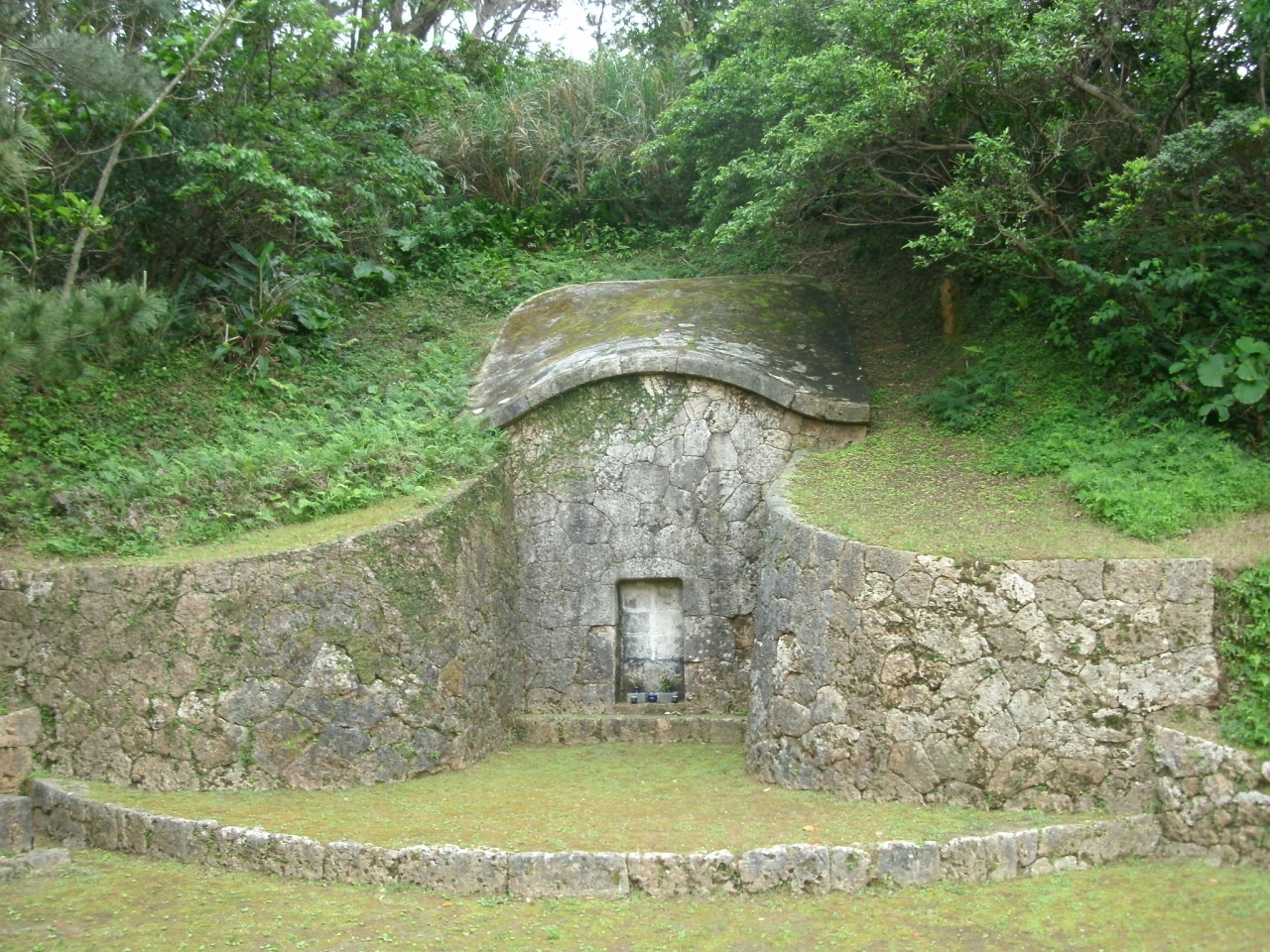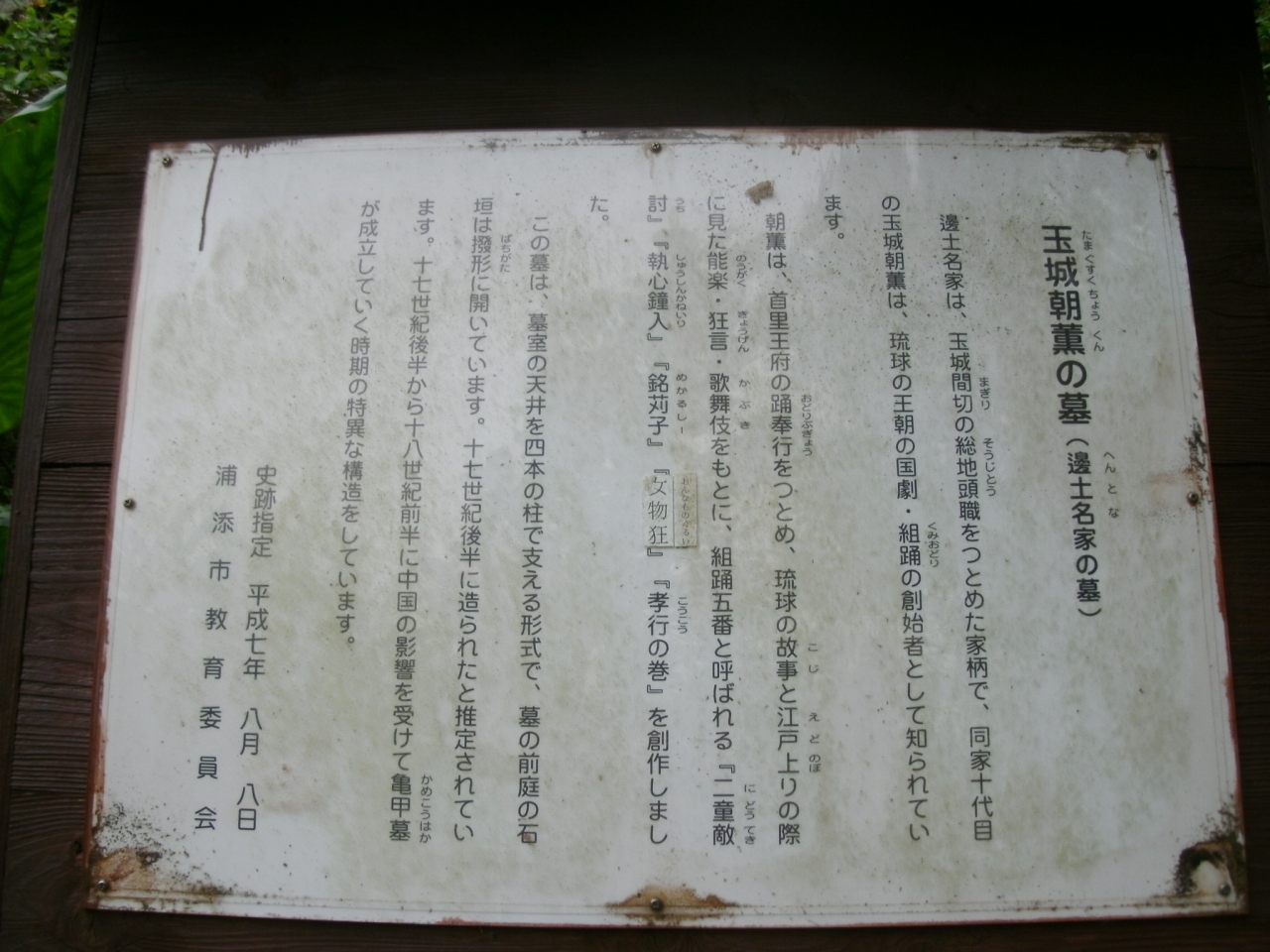 「玉城朝薫の墓」は、浦添市、国道153号線の前田トンネルの上にあります。玉城朝薫(1684年~1734年)は組踊の創始者として知られ、“劇聖”とも呼ばれています。トンネル横の階段を上ると、すぐにお墓が見えました。山の斜面を利用した石造りの墓でした。亀甲墓が流行りだす前(十七世紀前半)に造られた墓で、曲線が美しい簡素な形をしたお墓でした。玉城朝薫の墓は、説明版には“辺土名家の墓”とも書かれていました。朝薫は、玉城間切(現在の町村にあたる)の総地頭職を務めた家柄の辺土名家の10代目に当たると言うことで、この表記があるようです。
