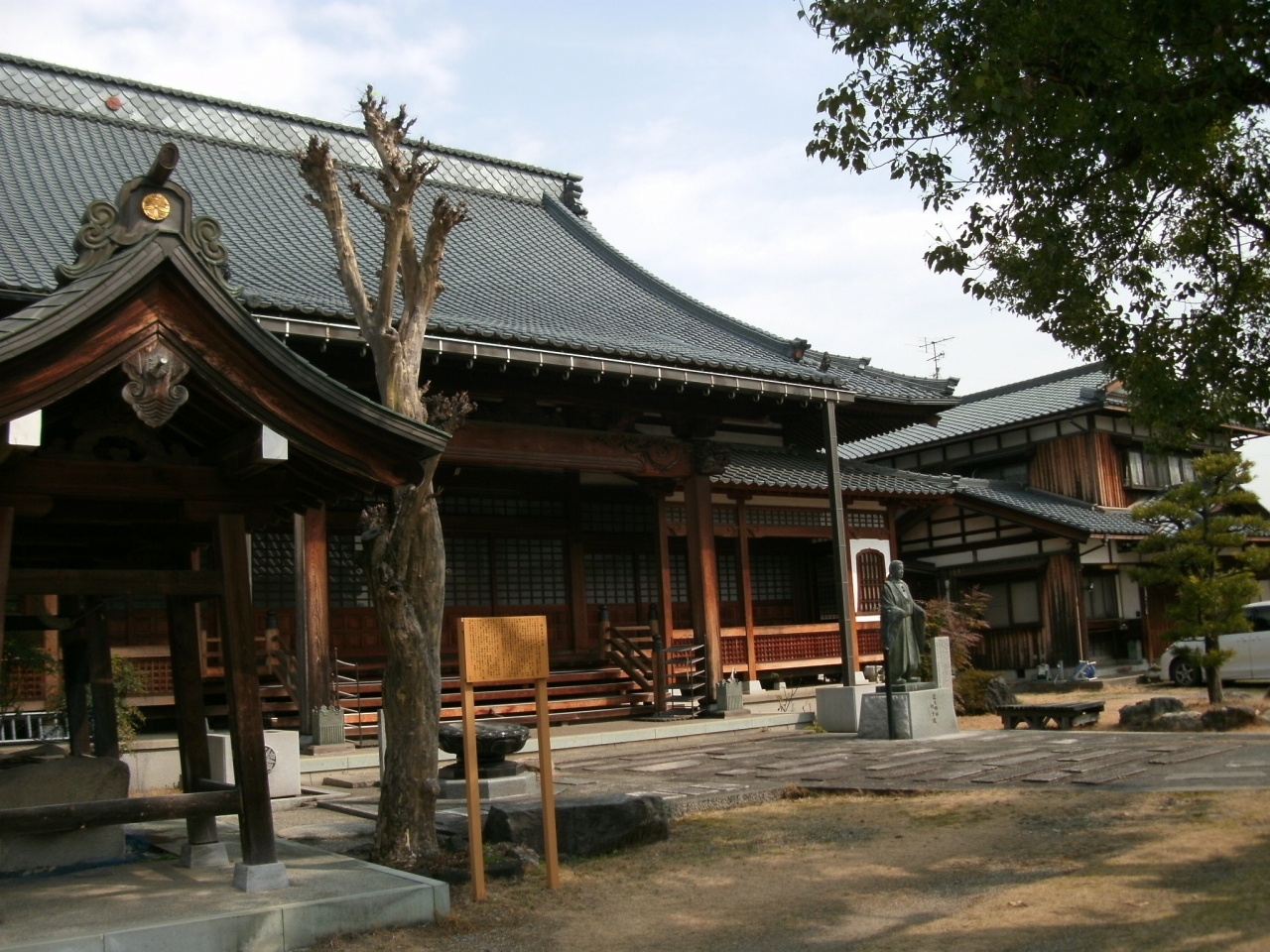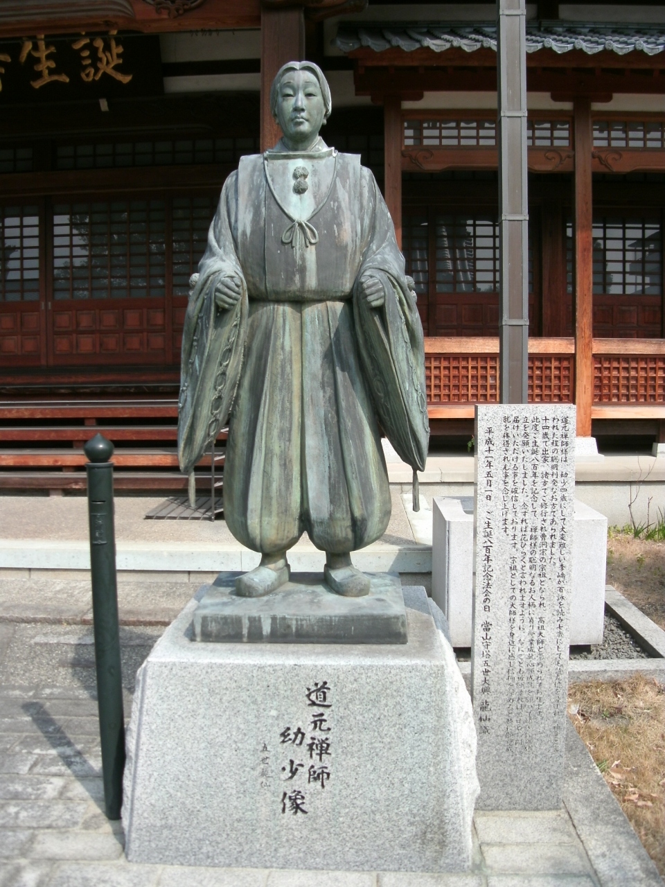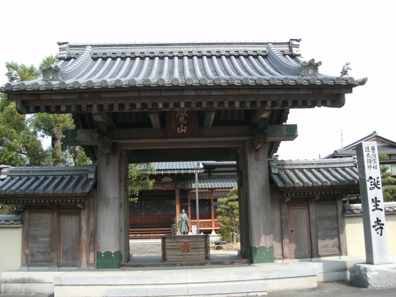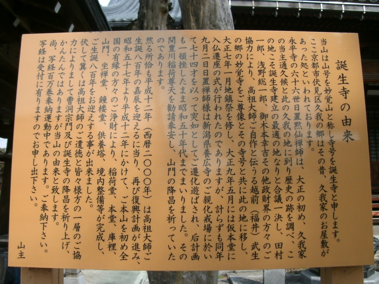 「誕生寺 」は、桂川に架かる久我橋の西のたもとにあります。山号を妙覚山と称し、曹洞宗の宗祖 道元禅師のご生誕800年(平成12年=2000年)を記念して宗祖生誕の地、京都市伏見区久我に建てられたものです。本堂には道元禅師御自作の道元禅師像の前に可愛らしいご誕生仏像が置かれています。境内はそれほど広くないですが、綺麗で、本堂の前には道元禅師の幼少像、その他、ブツタガヤの仏石跡、道元禅師産湯の井戸、道元禅師両親の墓、豊川稲荷神社などがありました。