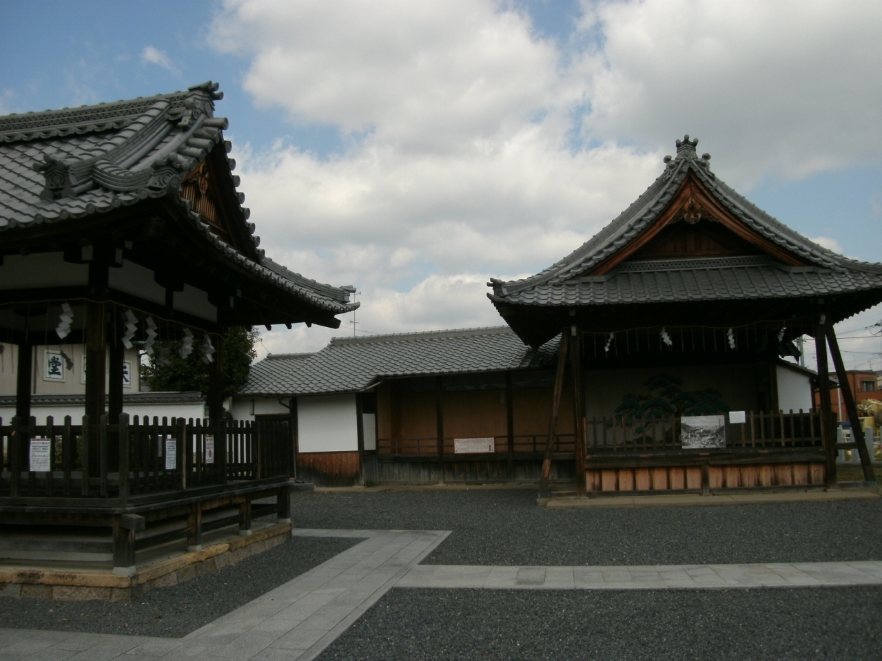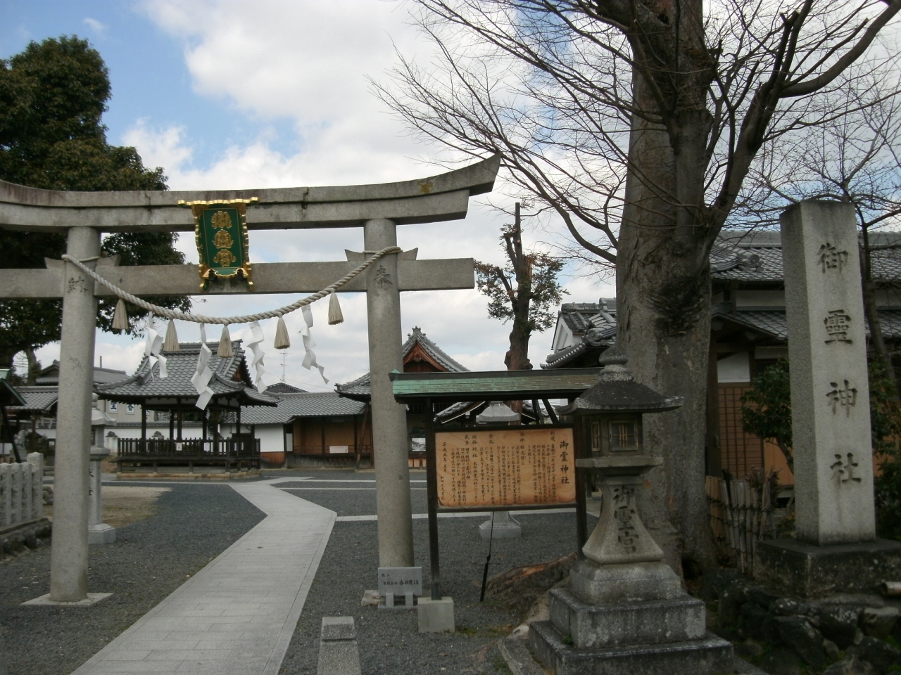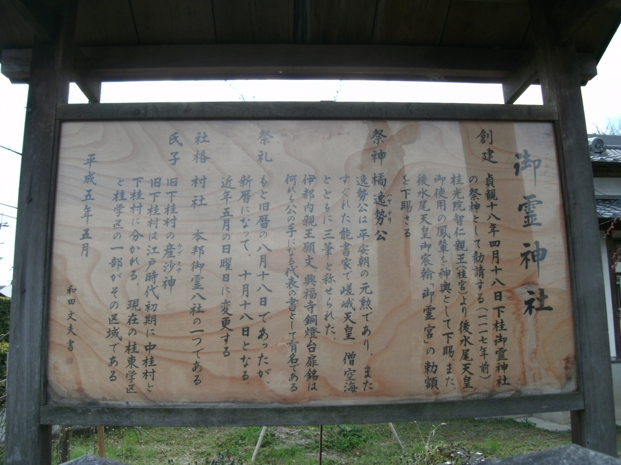 「下桂御霊神社」は、阪急桂駅の北東、500mあまり、桂離宮の北側にあります。創建は貞観十八年(876年)、御霊神として、橘逸勢の霊を祀っています。橘逸勢公は橘諸兄より二代後の右大臣であった平安朝の政治家であり、また能筆家で、嵯峨天皇、弘法大師とともに三筆と称されており、書道の神様を祀る神社としては全国的にも非常に珍しいものです。周囲は住宅街で、境内はそれほど広くはありませんが、ご本殿のほかに神楽殿拝殿、能舞台などがあり綺麗で静かです。そのほか、西京区“区民の誇りの木”に指定された木として、ムクロジ、ナギ、イチョウ」の3本の木が境内にあります。特にムクロジは樹齢四百年の古木で、歴史を感じさせる貫禄がありました。