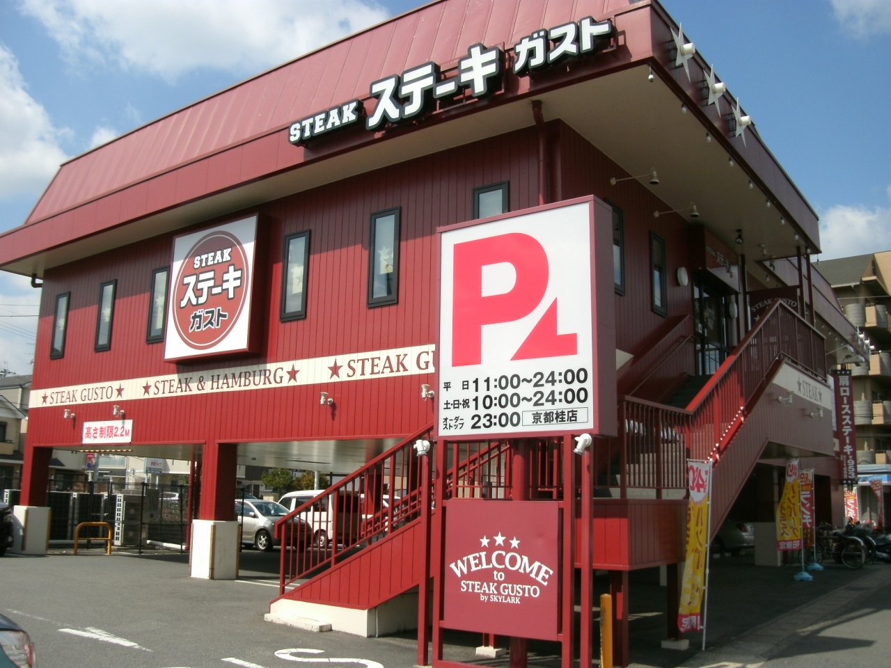 「ステーキガスト (京都桂店)」さんは、桂川街道が阪急京都線を潜った北側200mぐらいのところにあります。建物の下に広い駐車場があり入りやすいお店です。以前、“おはしカフェガスト”だったところが、“ステーキガスト”になり、安価なステーキとサラダバイキング、ドリンクバイキング等を楽し婿とが出来ます。ランチに“ロースステーキ、サラダバイキング付き1000円”をオーダー。バイキングにはサラダのほかカレー、パン、ライス、スープ、デザートなどが付いていました。ステーキは値段相当の肉でしたが、バイキングを含めたらコストパフォーマンスは十分でした。