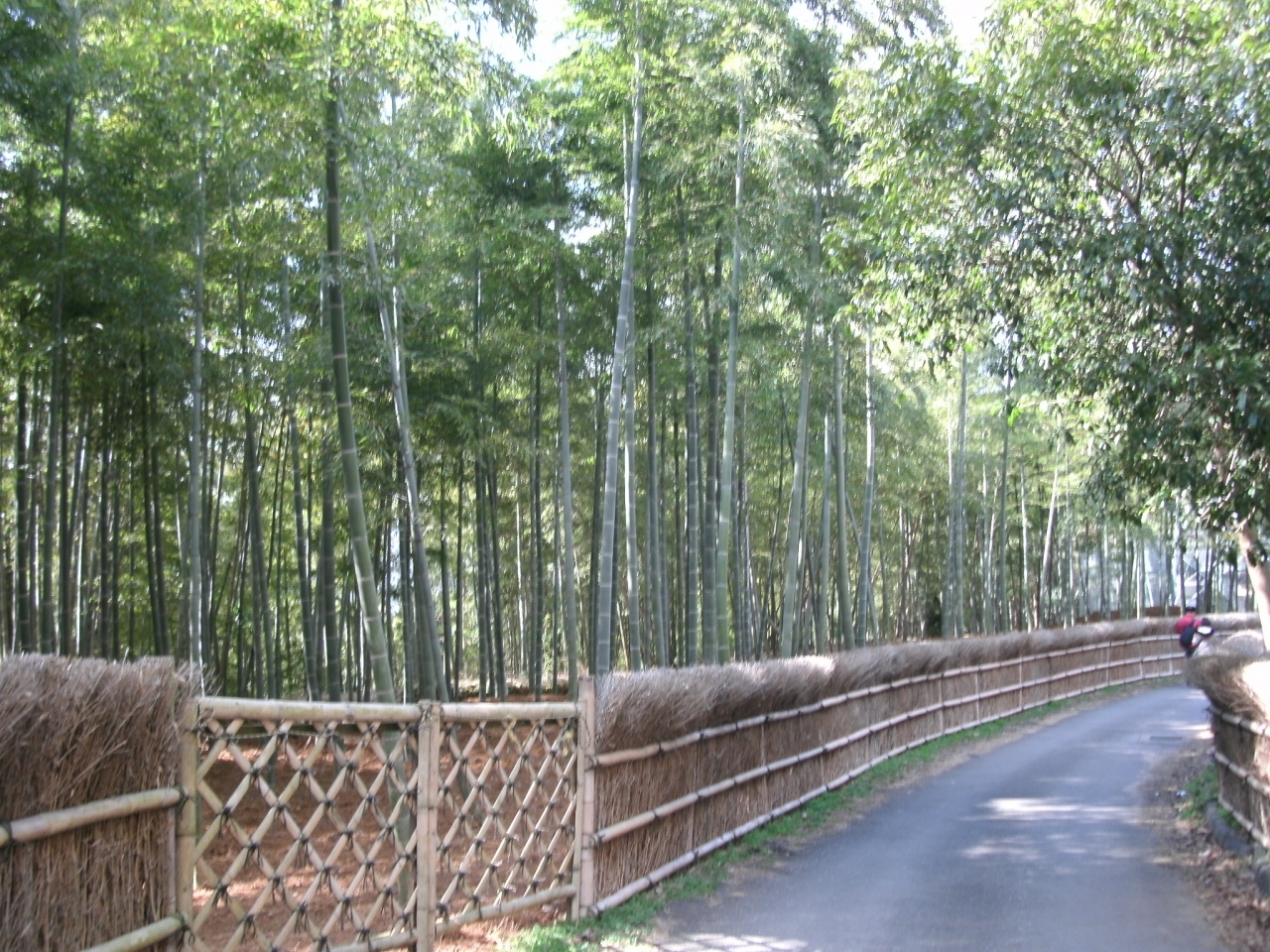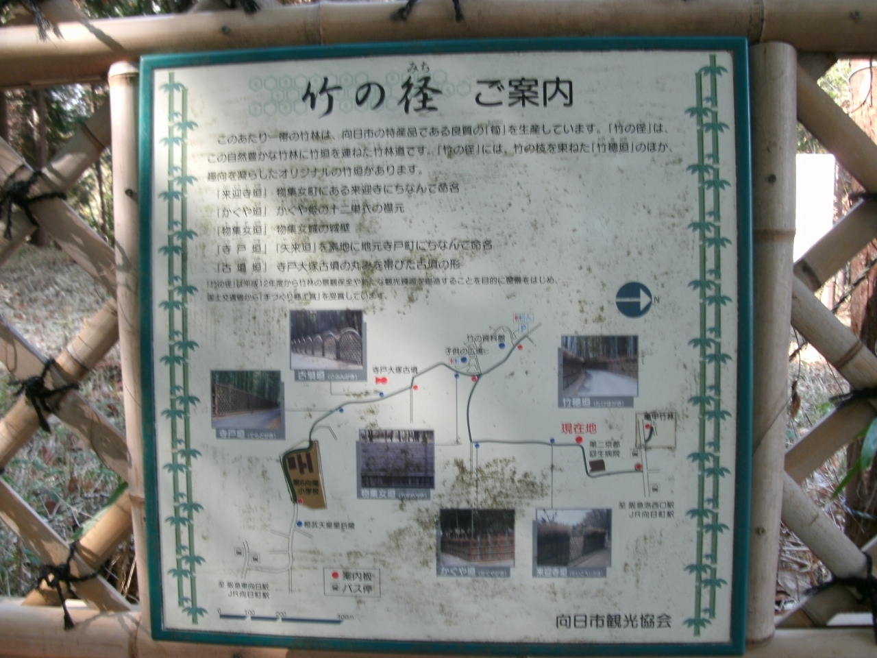 「竹の径」は、向日市西部の西ノ丘丘陵の竹林の景観を保全するため、環境整備を行って、孟宗竹を使って平成12年度から整備されてきたものです。「竹の径」は、竹の枝を束ねた“竹穂垣”をはじめ、丸みを帯びた古墳の形を表現した“古墳垣”、かぐや姫の十二単衣の襟元をイメージした“かぐや垣”など7種類の竹垣が整然と連なる全長約1.8kmにおよぶ竹林道です。“全国遊歩百選”“歩きたくなるみち500選”等に選ばれており、市内外を問わず竹林浴の地として親しまれています。