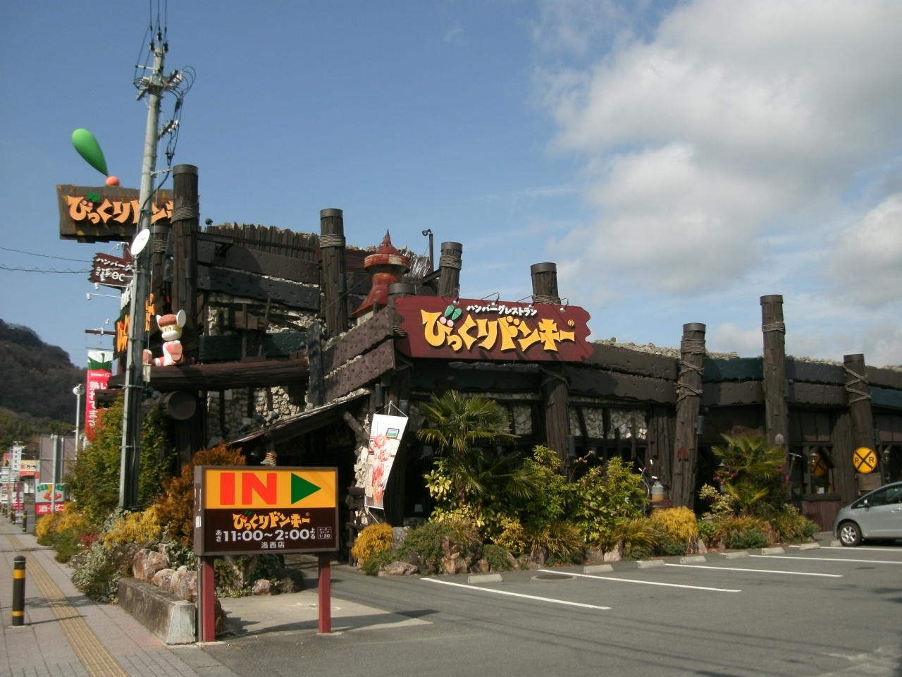 「びっくりドンキー」さんは、国道9号線の沓掛の信号の東(京都市内より)にあります。広い駐車場があり、入りやすいお店です。ランチに“おろしそバーグステーキセット”を頂きました。大根おろしと青じその、さっぱりした味わいとハンバーグの絡みが絶妙にマッチしており美味しく頂きました。味噌汁がついて732円ですからコスパは十分です。