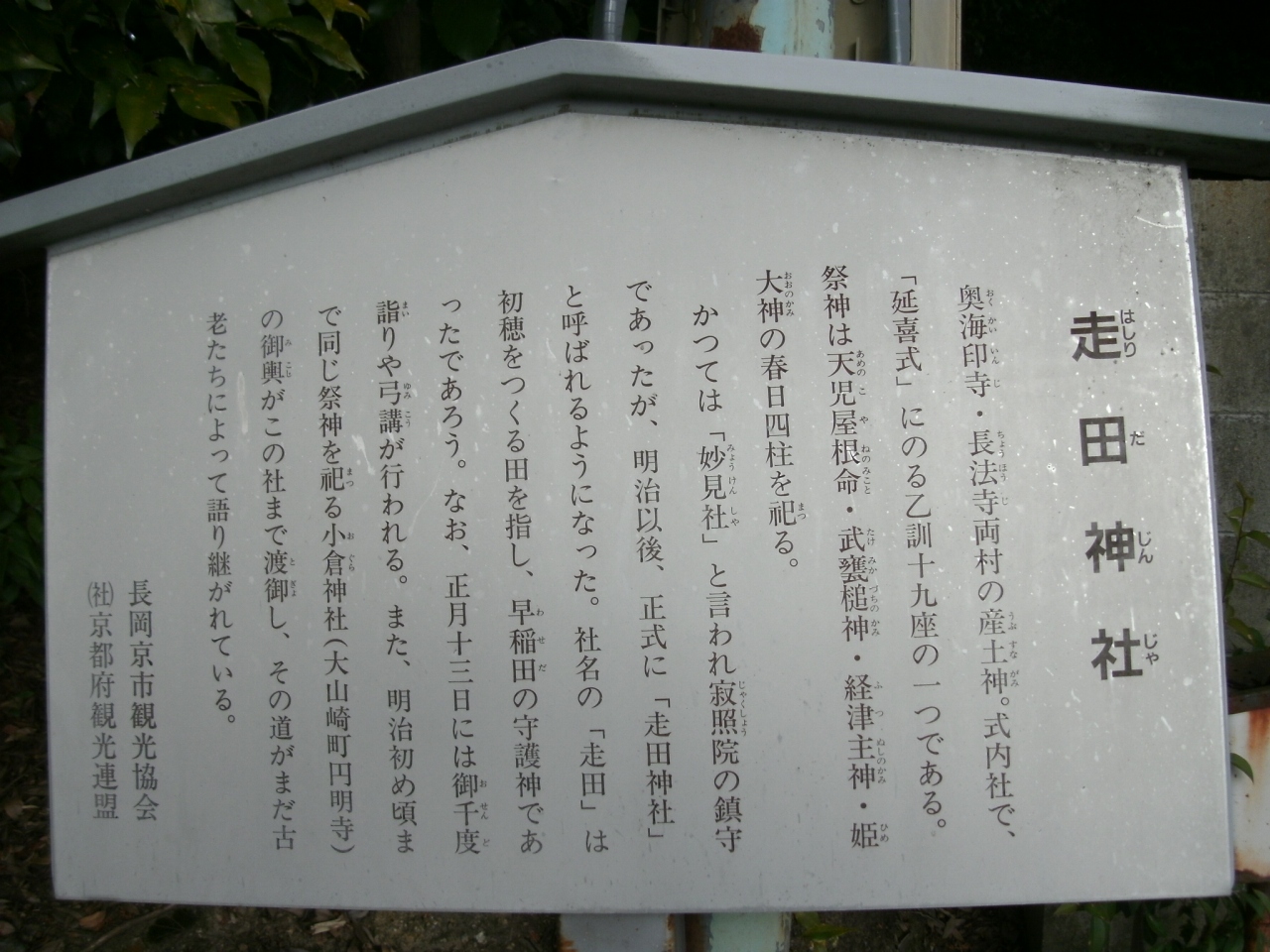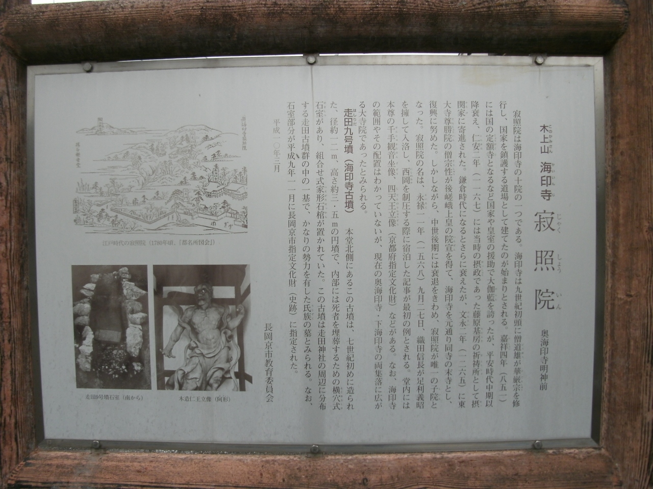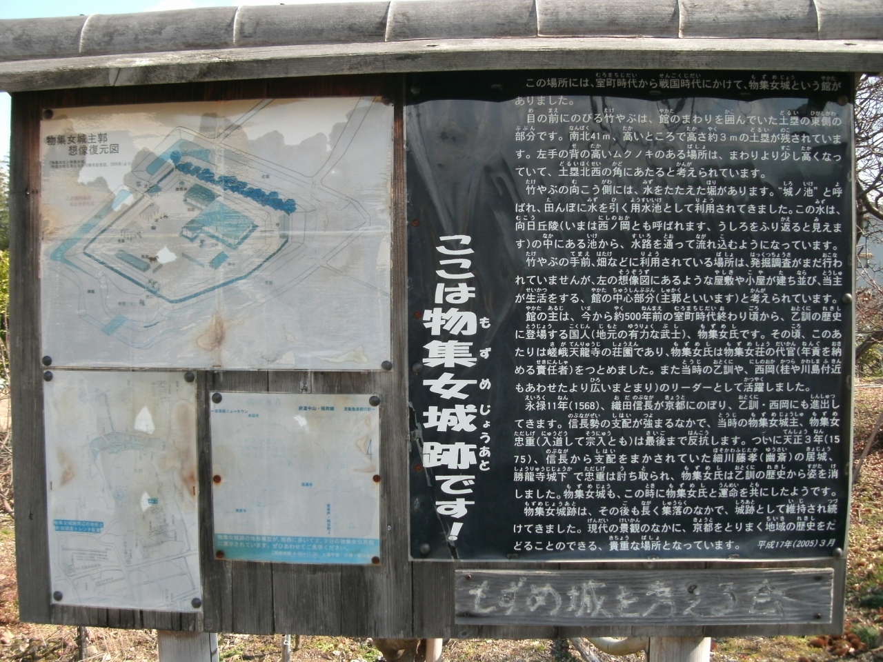 「物集女城跡」は、阪急洛西口駅の西、約600m、“御所海道”の交差点の南西方面に広がる中条地区にあります。ここは、中世にこの地域一帯を本拠としていた土豪、物集女氏の居城跡と考えられています。城跡は一見、畑のようになっており、フェンスでしっかり防護されており、中にはいることは出来ません。当時は大きな城だったようですが、現在では周りに民家やアパートが建ち、道路から見ただけでは見落としてしまうほどで、案内説明板を見て初めて、ここが城跡と判るような状態でした。