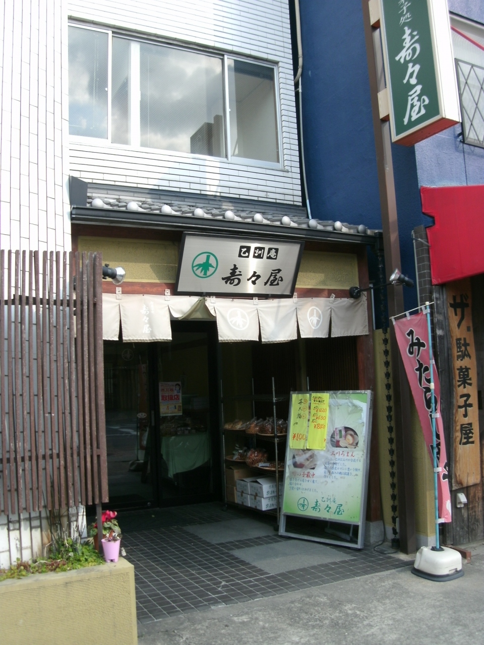 「寿々屋」さんは、長岡京市の一文橋交差点を西に進み、阪急電車の高架をくぐってしばらくすると右手にあります。地元で人気の和菓子のお店で、大きな通りに面していますが、間口は小さいお店なので、初めての人は少しわかりにくいと思います。饅頭や団子と言った普通の和菓子のほかに、地元長岡京の名産である“竹の子”を使った、三笠や最中があります。中でも、竹の子の甘露煮に黄身餡を使った焼き菓子“鴻臚(こうろ)の郷”は、甘さ控えめの上品な味で大変美味しいです。お土産や、お使い物にピッタリのお菓子だと思います。