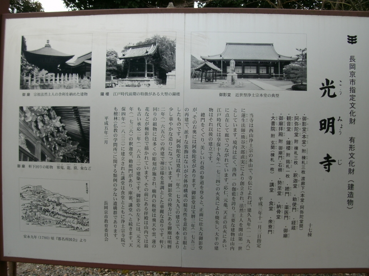 「西山浄土宗総本山光明寺」は、阪急長岡天神駅の西北約2?の西山の麓にあります。法「西山浄土宗総本山光明寺」は、然上人が念仏の教えを最初に説いた、“浄土門根元地”ともいわれ、紅葉の名所として有名です。境内は18000坪と広大で、多くの建物があります。総門をくぐって、通称“女人坂”と呼ばれている表参道を上っていくと、突き当たりに、通常の寺院様式では本堂と呼ばれる建物に相当する御影堂があります。御影堂は光明寺の伽藍の中心となる建物で、本尊である“法然上人御自作の張子の御影”をお祠りしてあります。中に入ってお参りすることが出来ます。紅葉シーズン以外は、参拝者も少なく、ゆっくり散策するのには良いと思います。紅葉期のみ入山有料です。