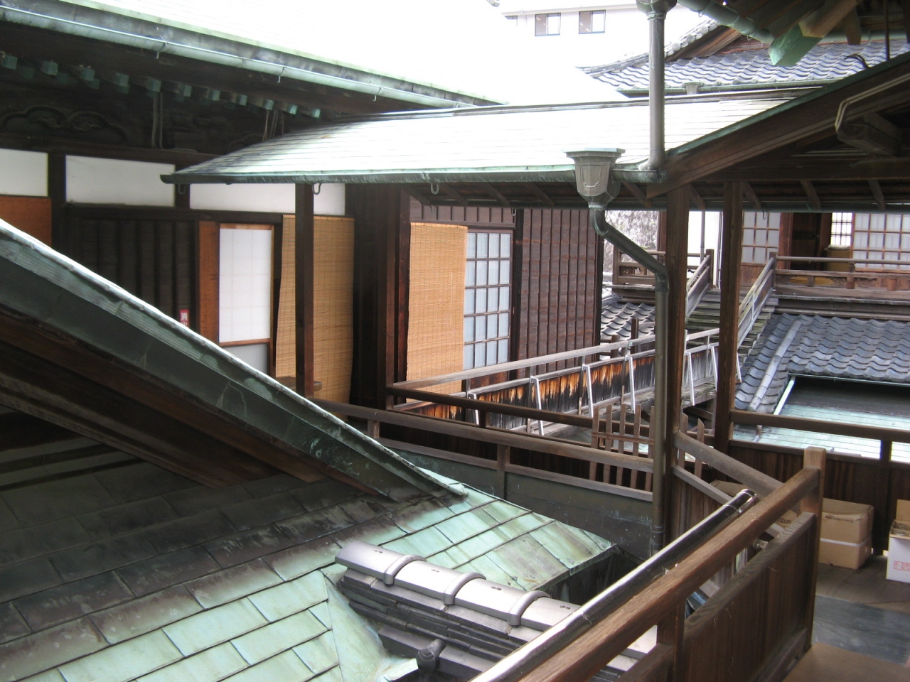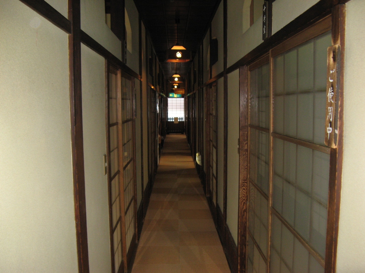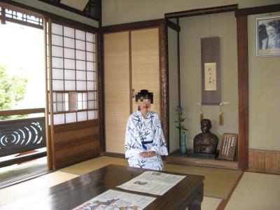 皇室の方が道後に来られたときに、温泉にお入りいただくために造られたもので明治32年に完成したものです。案内してくれるおじさんが詳しく説明してくれました。すみからすみまで優雅な造りで、“前室”、“御居間”、“玉座の間”、警護の人が控える“武者隠しの間”などがありました。浴槽は一階にあり、御影石の中でも最上とされる香川県産の庵治石でできているそうです。玉座の間の天井は、桐の三枚重ねで槍も通さないとか、御手洗所は畳敷きになっているとか面白い説明を聞くことが出来ました。写真撮影は禁じられています。