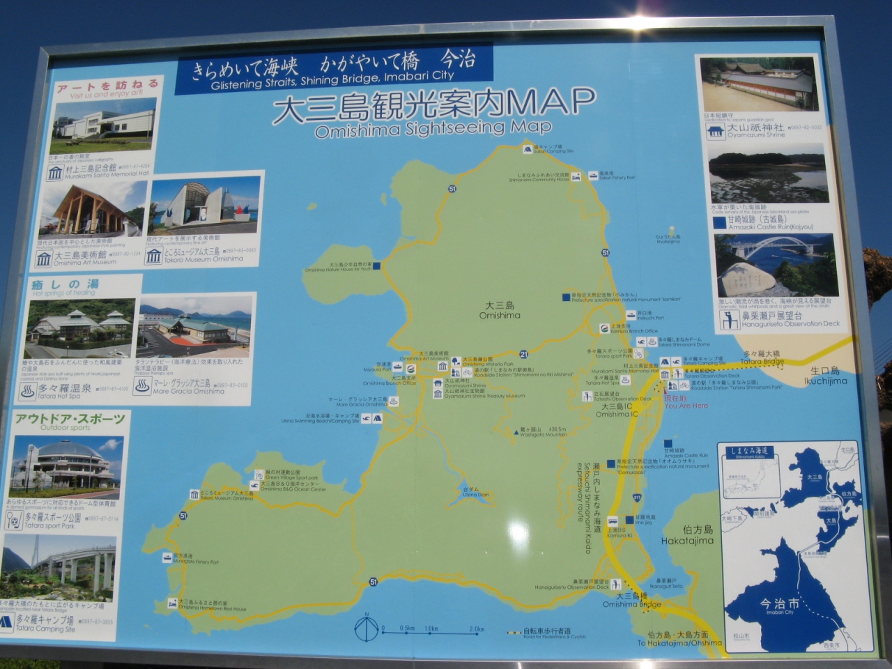瀬戸内しまなみ海道を走ったときに、「大三島」を訪れました。大三島は芸予諸島の中の1つの島で愛媛県の最北に位置し、県内にある島の中では最大の島です。島内には、守護神として尊崇を集めた国宝・重要文化財を多数所蔵している“大山祇神社”や多々羅美術館、多々羅温泉、“伯方の塩”のブランド名で知られる伯方塩業など、見所が沢山ありました。