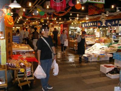 「ひろめ市場」は高知城の東、歩いて5分ぐらいの場所にあります。ひろめ市場の中は“お城下広場”や“龍馬通り”など7ブロックからなり、鮮魚店や精肉店、雑貨・洋服屋,飲食店、みやげ物店など様々なお店が集まっています。市場内の至る所にテーブルと椅子が並べられていており、自分の好きなものを好きなお店で買ってきて持ち寄って食べることが出来ます。鯖寿司、鰹のタタキ、刺身、バイ貝、テンプラなどを購入してホテルで美味しく頂きました。