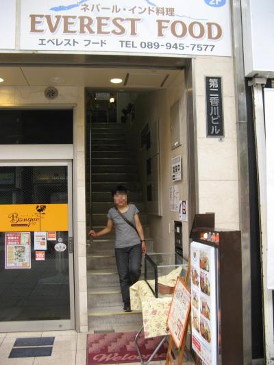 「エベレスト フード」さんは、松山市の繁華街、大街道の二番町と三番町の中間ぐらいにあります。お店はビルの二階で、店舗入口に写真つきのメニュー看板がおいてあるのでわかりやすいです。店内は細長いスペースで綺麗でした。13時前に入ったのですが、若い女性のお客さんが多かった。カレー、ナンorライス、サラダが付いた日替わりのランチセット590円を頂きましたが、ナンがビックリするほど大きくて、美味しかった。