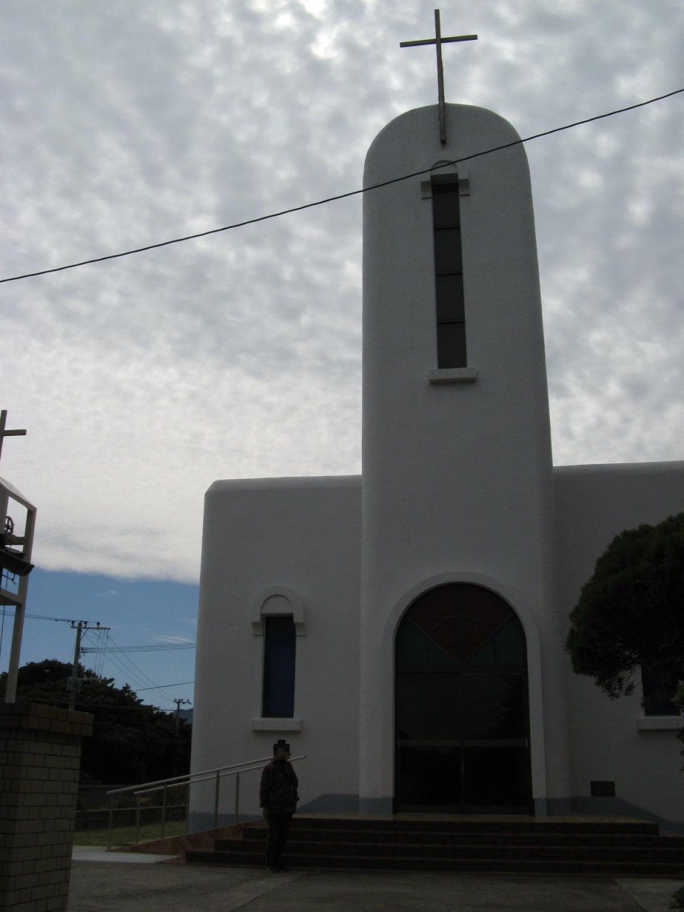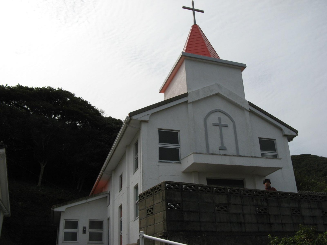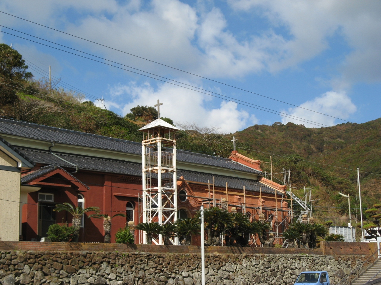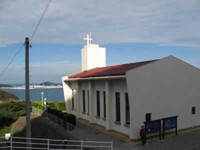 五島列島の教会巡りをした時に「桐教会」を訪れました。場所は、中通島の南の玄関口、奈良尾港から車で10分ほどの桐古里地区の小高い丘の上に立っていました。白壁と赤い屋根の高い尖塔を持つ教会は、90年余の歴史を刻み、若松瀬戸を往来する船舶の航海の安全を祈るかのように、丘の上から静かに見守っているようでした。境内には昭和46年に建立された、桐教会復活期の指導者、下村善七・ガスパル与作親子と清川沢次郎翁を顕彰する信仰先達者顕彰碑がありました。教会堂のある高台からは、美しい瀬戸を望むことができました。