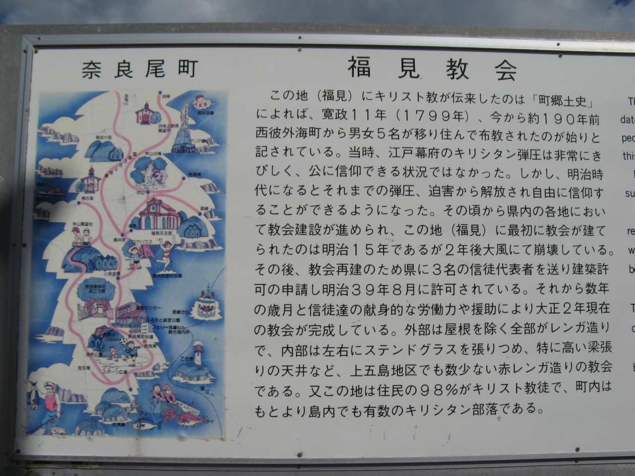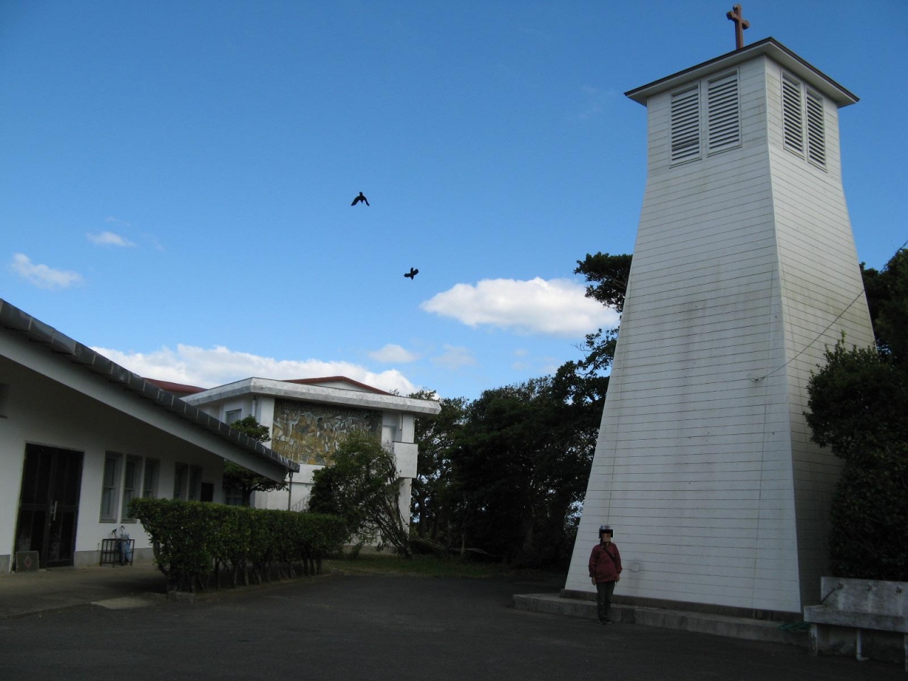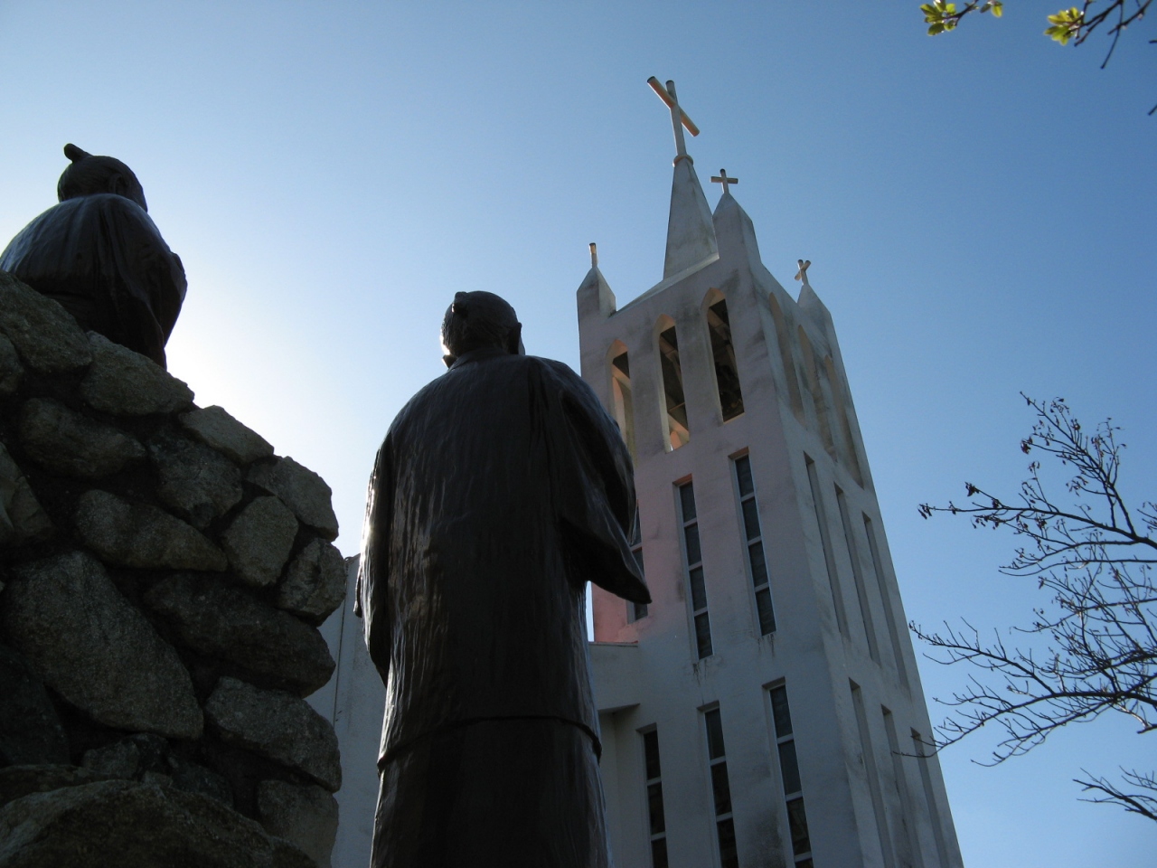 五島列島の教会巡りをした時に「桐教会」を訪れました。場所は、中通島の南の玄関口、奈良尾港から車で10分ほどの桐古里地区の小高い丘の上に立っていました。白壁と赤い屋根の高い尖塔を持つ教会は、90年余の歴史を刻み、若松瀬戸を往来する船舶の航海の安全を祈るかのように、丘の上から静かに見守っているようでした。境内には昭和46年に建立された、桐教会復活期の指導者、下村善七・ガスパル与作親子と清川沢次郎翁を顕彰する信仰先達者顕彰碑がありました。教会堂のある高台からは、美しい瀬戸を望むことができました。