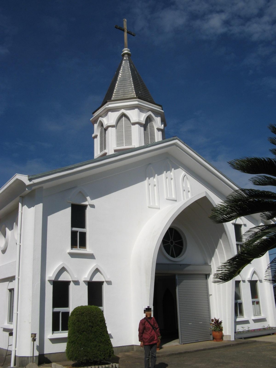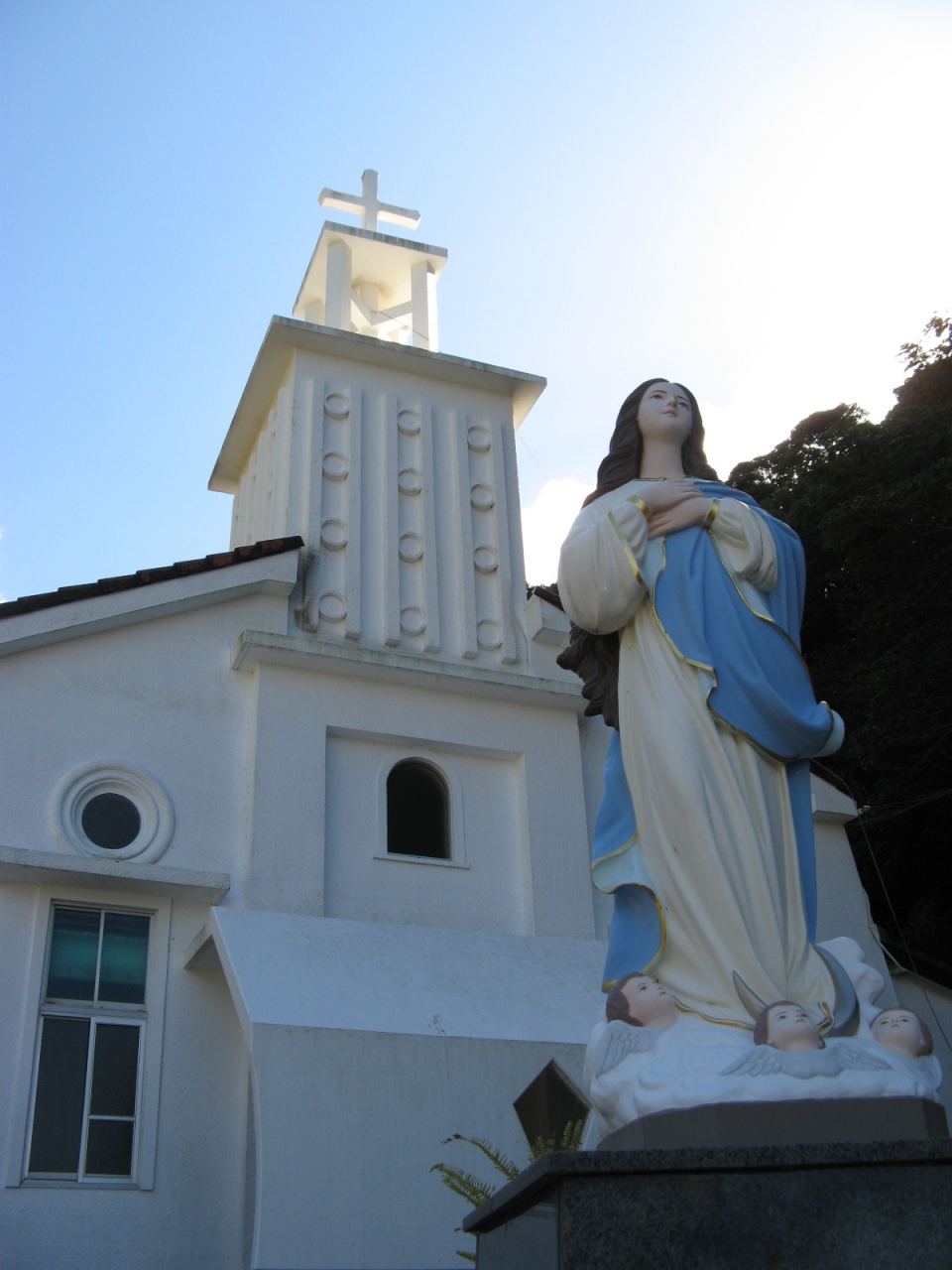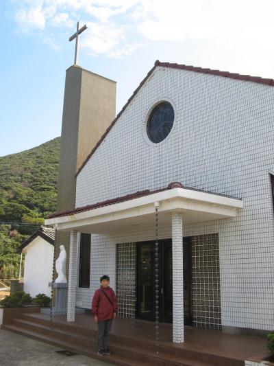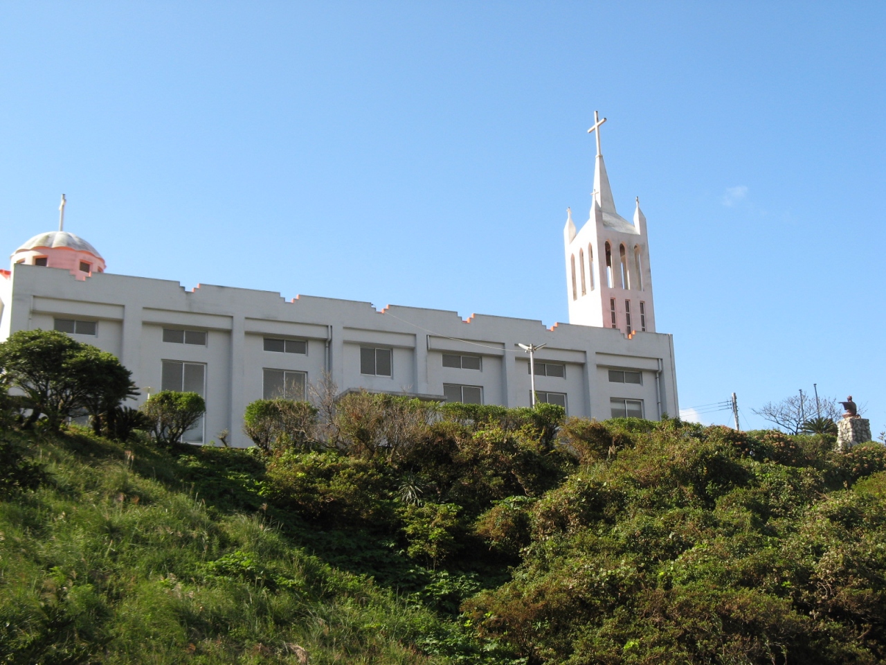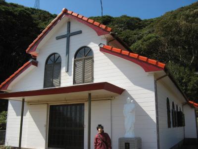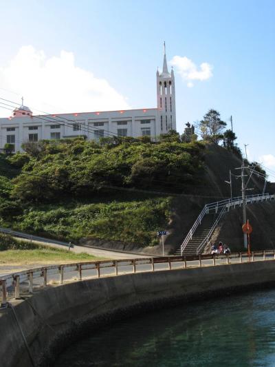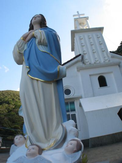 五島列島の教会巡りをした時に「大平教会」を訪れました。場所は、奈良尾港から国道384号線を走って、県道46号線から若松大橋を渡って県道169号線を右に折れ(北方向)、そこから10?ほど走った西神ノ浦郷にあります。1958年(昭和33年)に建立された教会は白亜の外観と、空にそびえる十字架鐘楼が重厚感を醸し出していました。教会の前には被昇天の聖母像(教会の守護の聖人)が建っており、コバルトブルーのきれいな海を望むことが出来ました。