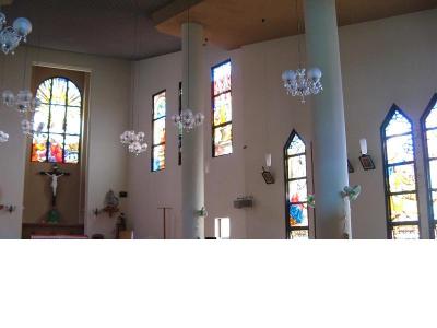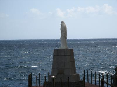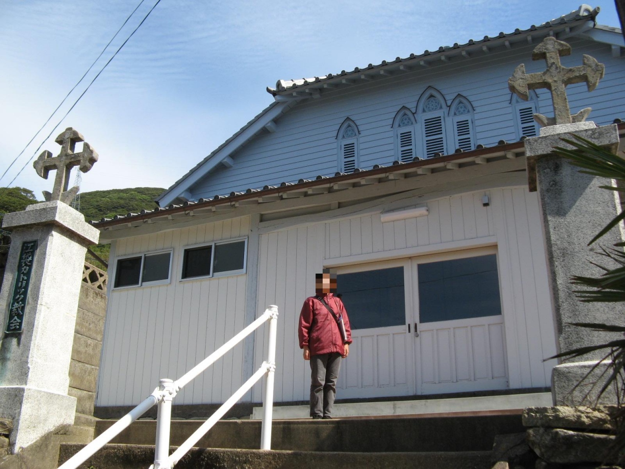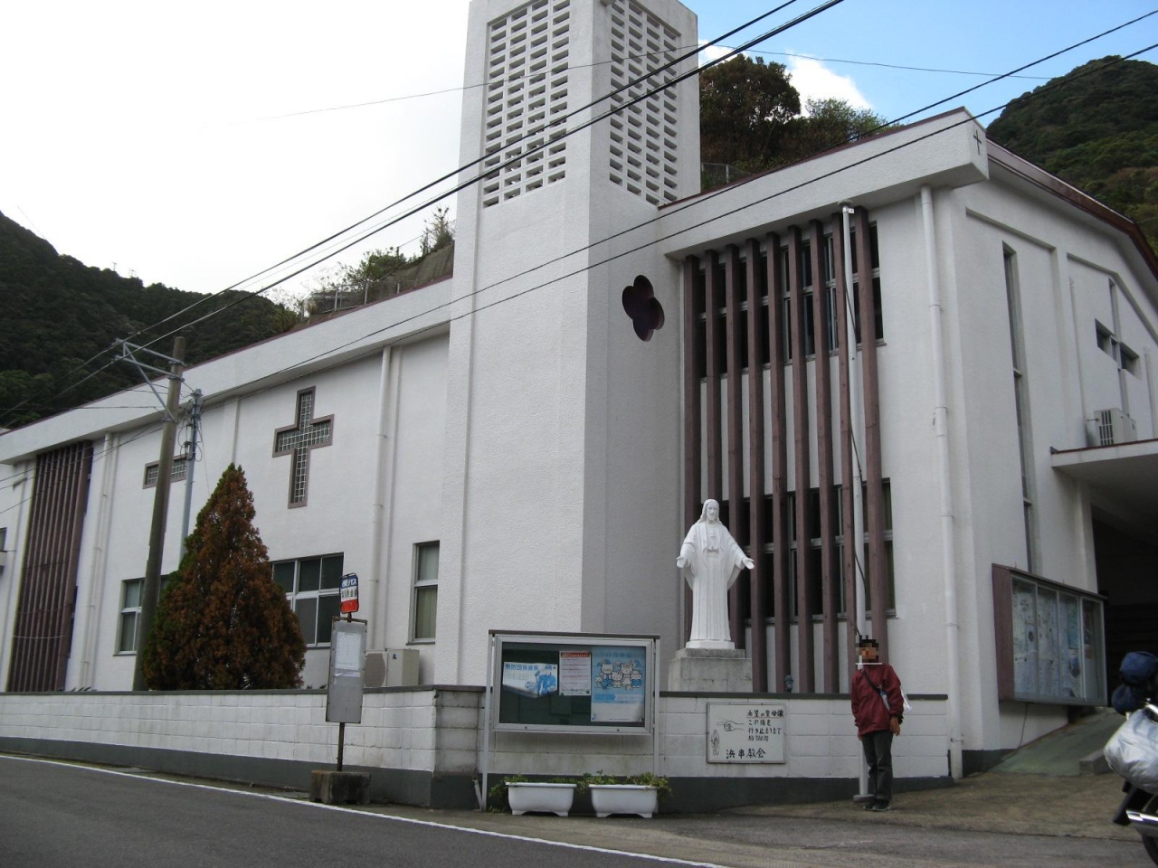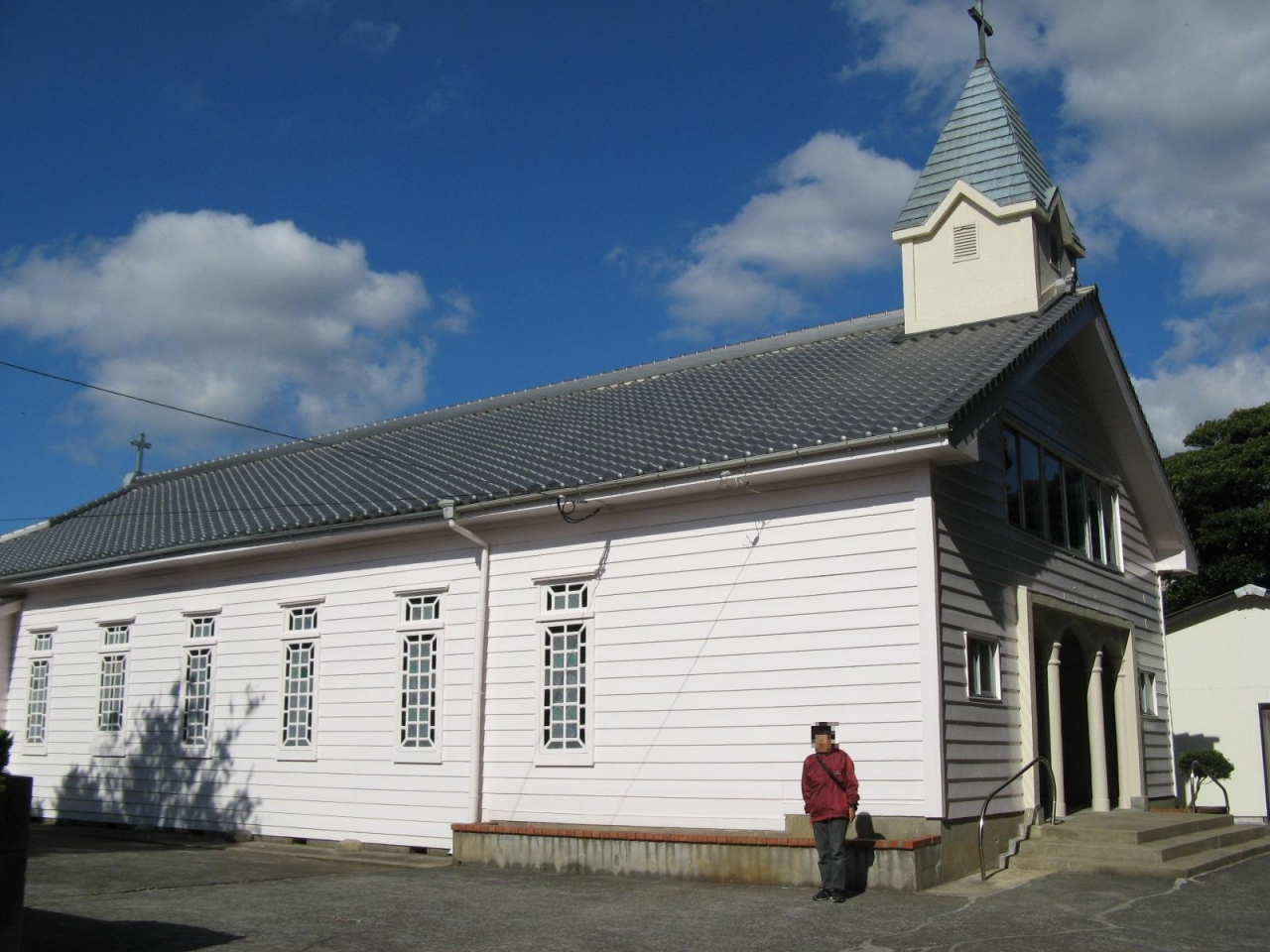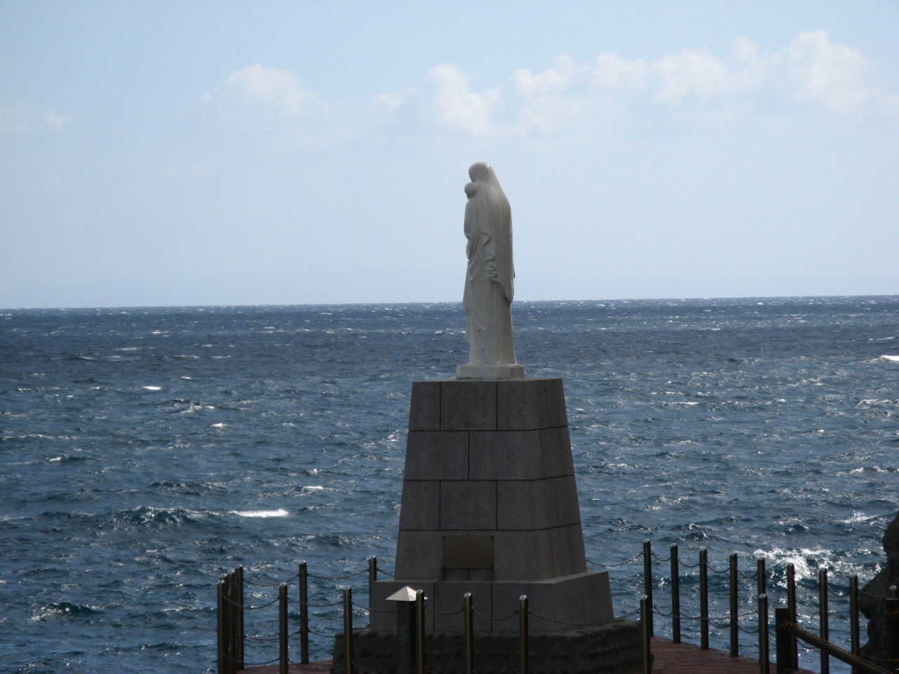 五島列島の教会巡りをした時に「大平教会」を訪れました。場所は、奈良尾港から国道384号線を走って、県道46号線から若松大橋を渡って県道169号線を右に折れ(北方向)、そこから10?ほど走った西神ノ浦郷にあります。1958年(昭和33年)に建立された教会は白亜の外観と、空にそびえる十字架鐘楼が重厚感を醸し出していました。教会の前には被昇天の聖母像(教会の守護の聖人)が建っており、コバルトブルーのきれいな海を望むことが出来ました。
