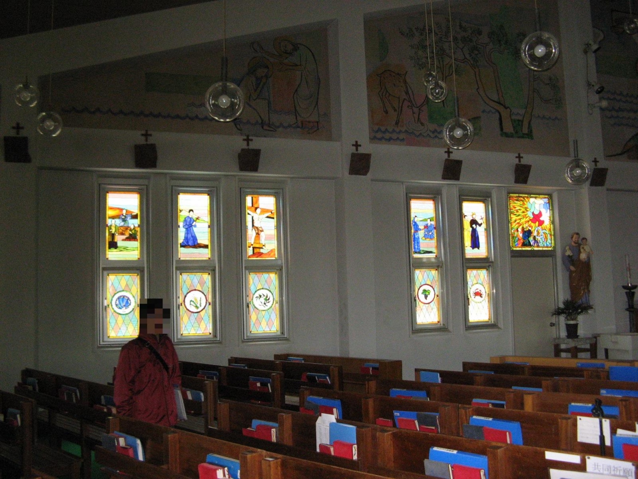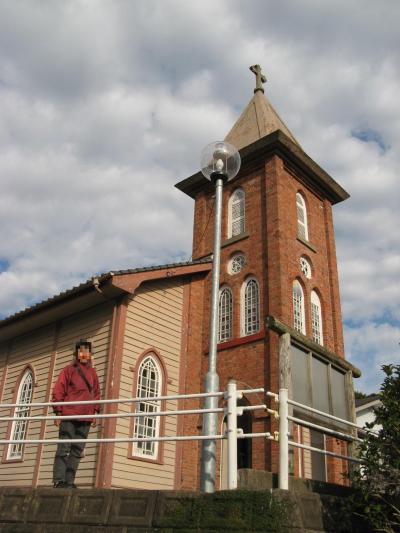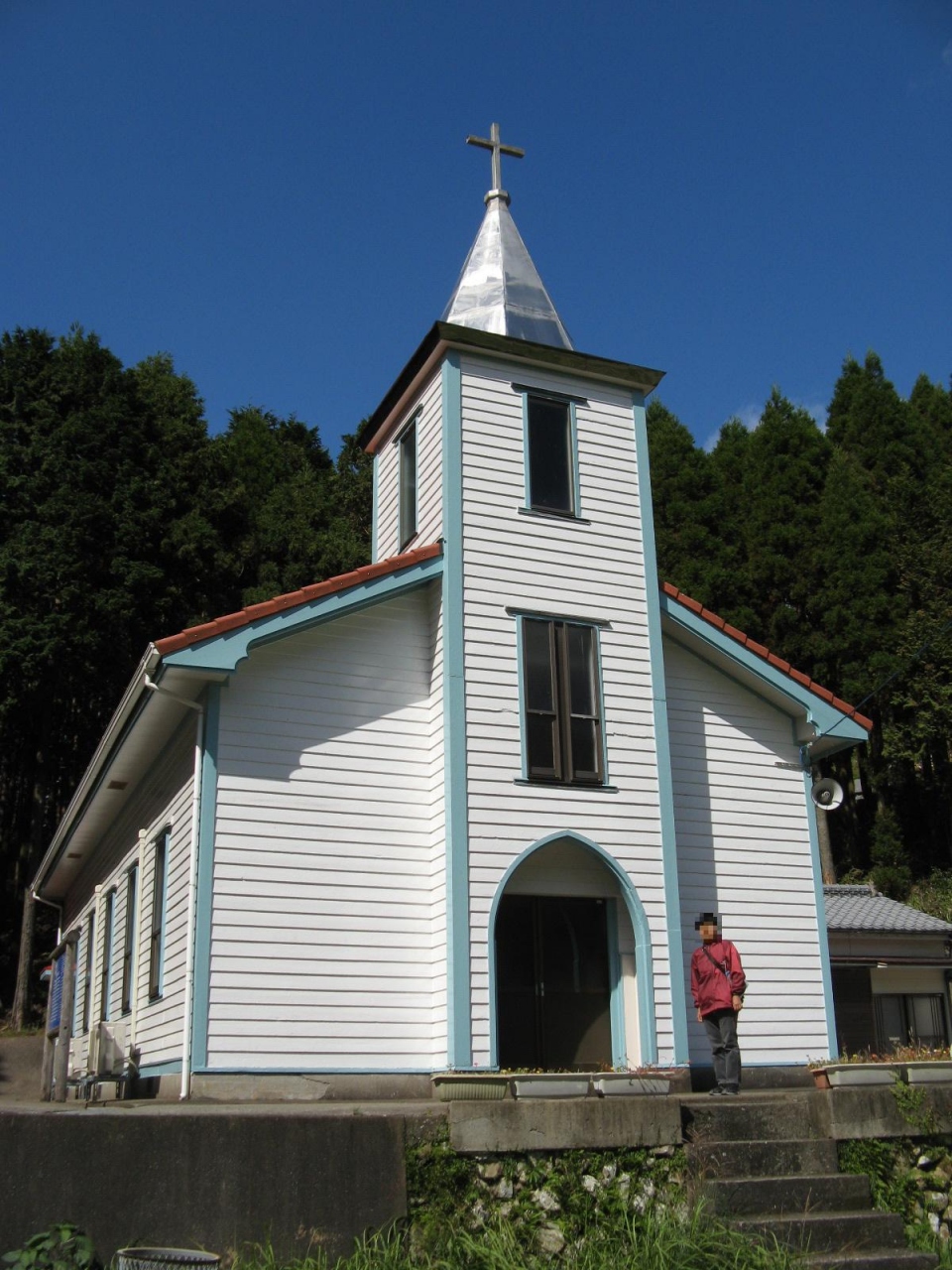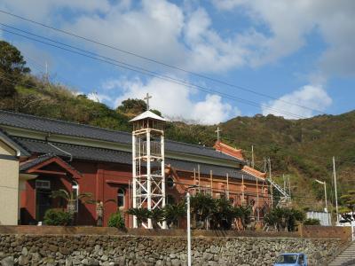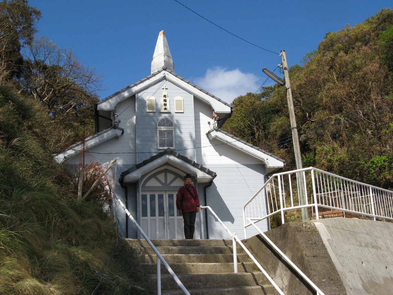 五島列島の教会巡りをした時に「江袋教会」を訪れました。場所は、中通島の中東部の玄関口、有川港から国道384号線西へ、県道32号線、県道218号線を北上して、車で有川港から40分ほどの曽根郷にあります。もともとは明治15年(1882年)に創建されたもので、実際に使用されている木造の教会では、国内で最も古いものであったが、平成19年2月12日の火事により全焼、その後、復元工事が進められたものです。東シナ海を見渡す急傾斜面の中腹に立つ教会堂は木造、寄棟造りの桟瓦葺きで、一見、民家の様な佇まいでした。