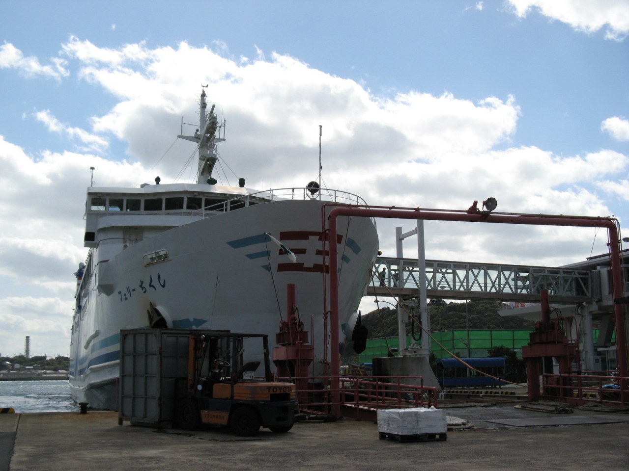 「フェリーちくし」は、博多ふ頭−壱岐−対馬を結ぶ九州郵船?の連絡船で、博多から壱岐まで約2時間10分、それから対馬まで約2時間15分の航海です。総トン数:1,926トン、航海速力:19ノット、旅客定員:753名、積載台数:約80台のフェリーは、案内所、自動販売機、スカイラウンジ、トイレ、公衆電話、給湯機、冷水機、ゲームコーナー、などを有しています。壱岐島に旅行に行った際、芦辺港から博多港まで乗船しました。クルージングは快適で、壱岐水道や玄界灘の綺麗な景色を楽しむことが出来ました。