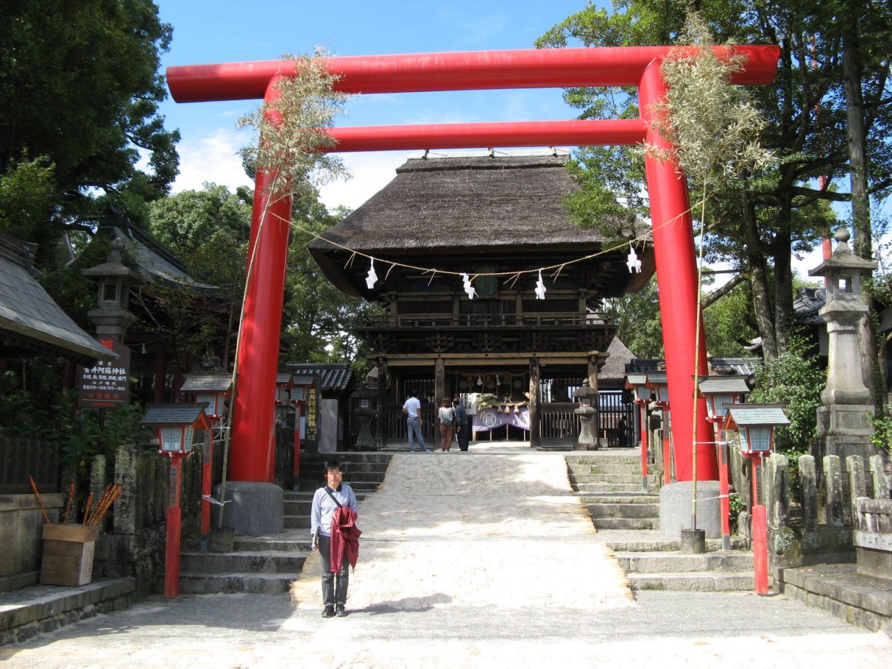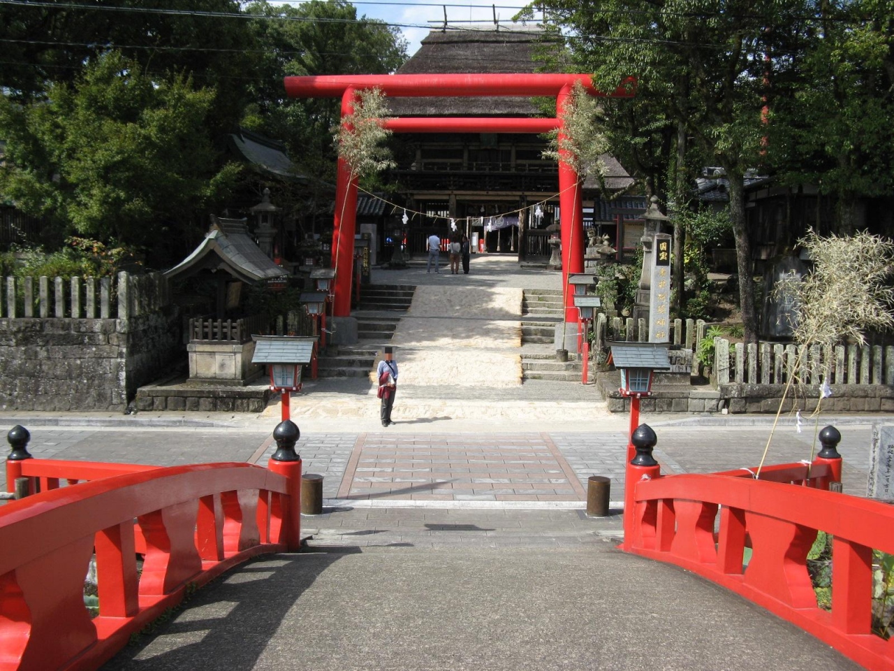 目の前に流れる小川と赤い太鼓橋もきれいで、入り口の赤い鳥居と立派な茅葺きの桃山様式の楼門は圧倒的な存在感を示していました。境内は広く整然としていて、立派な本殿や拝殿があり厳かな雰囲気をかもし出していました。