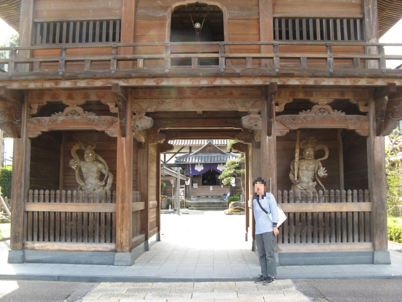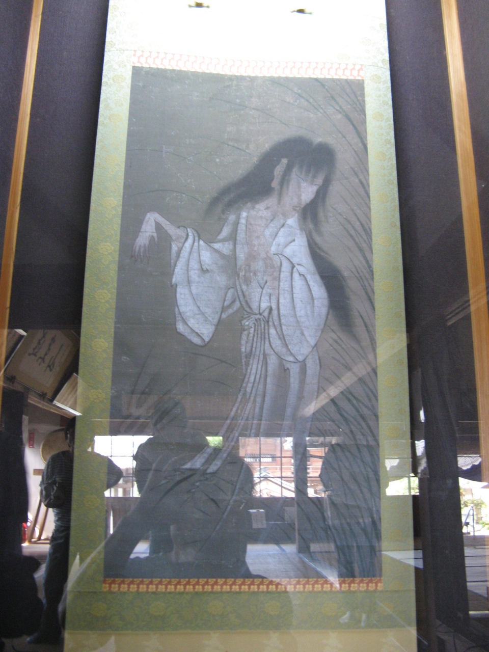 仁王門の両脇には身の丈2mもある木彫の仁王像がにらみをきかしています。本堂に上がると、和尚が描いて幽霊を成仏させたと言う幽霊の掛け軸がかかっていました。幽霊が出たという池は今も本堂裏にあり、すいれんが池の表面を覆っていました。