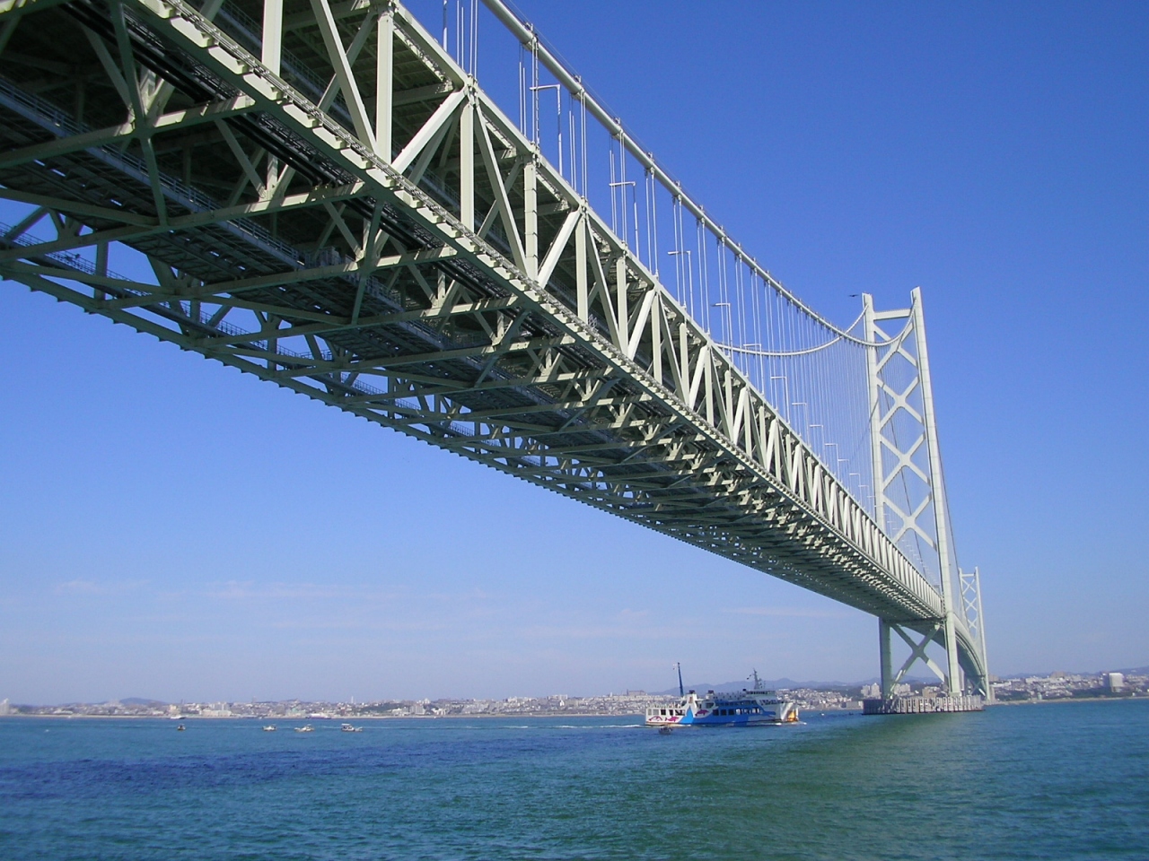 「明石海峡大橋」は、神戸市垂水区舞子と淡路島の淡路市松帆の間に位置する全長3,911mの吊橋です。吊橋の規模を示す中央支間長(塔と塔の距離)は、世界一の1,991mを誇り、さらに主塔の高さは海面上約300mとなり、東京タワー(333m)とほぼ同じ高さです。橋の下から見ると、青い空にそびえる白い主塔とトラス構造の橋桁のフォルムはとても綺麗で感動しました。夜にはライトアップされるので、また違った趣が楽しめると思います。