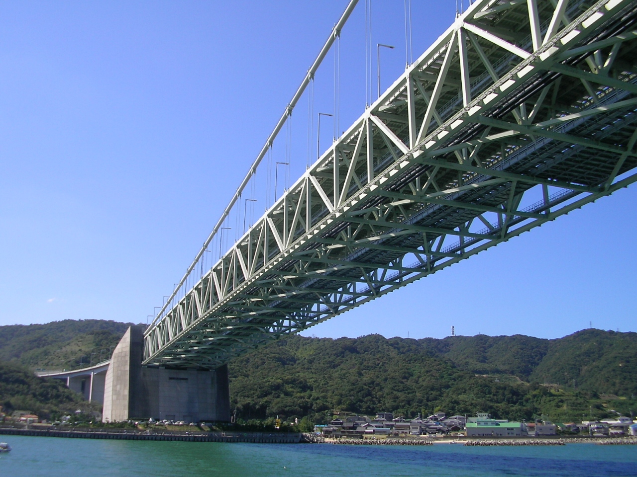 「大鳴門橋」は、渦潮で有名な鳴門海峡を渡る中央支間長876mの吊橋です。完成時は上部に6車線の自動車専用道路、下部に新幹線規格の鉄道を備えた2階建て構造となりますが、現在は道路4車線が供用されており、将来は道路2車線と鉄道2車線を追加できる構造となっています。