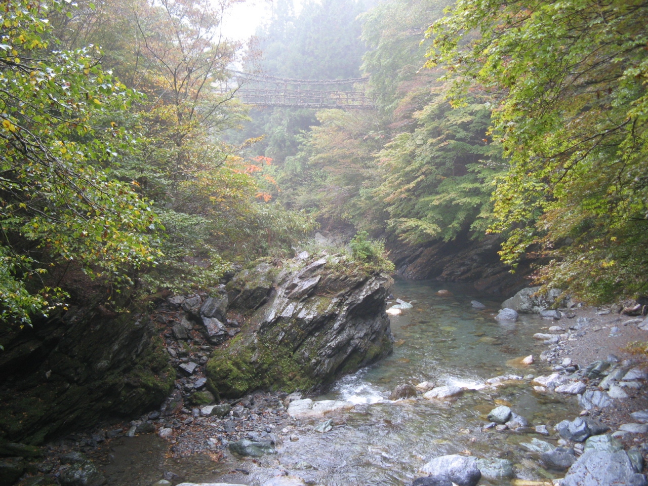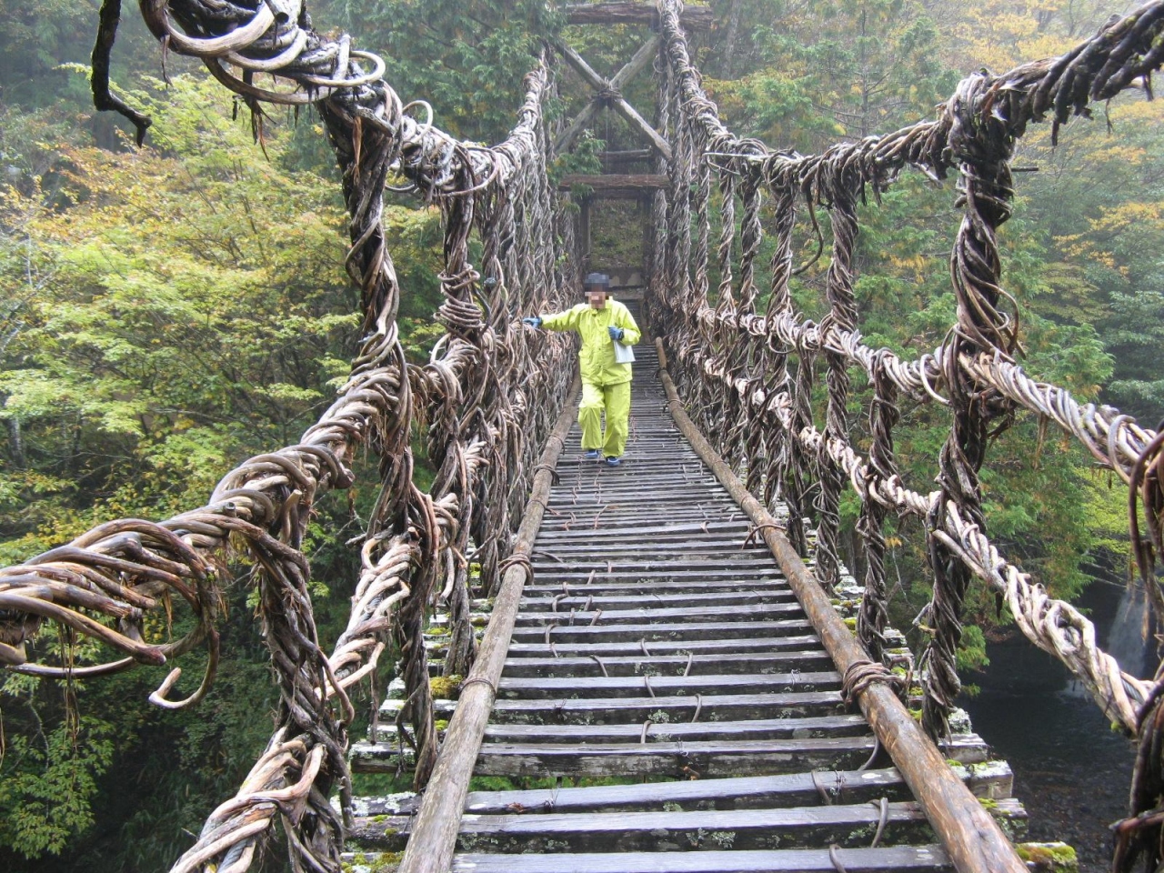 四国一周旅行のときに、前日に宿泊した琴平から国道438号線を経て、国道439号線を剣山側から入りました。見ノ越PAから国道439号線に入り、深い谷沿いに続く長い坂道を30分ほど走ると「奥祖谷 二重かずら橋」の駐車場とチケット売り場があります。500円のチケットを買って、5分ほど歩くと「奥祖谷 二重かずら橋」がありました。近くには“野猿”もあり、家内も乗りましたが女性の力でも簡単に動かすことが可能で、面白い体験が出来ました。この橋より20?ほど西にある“本家のかずら橋”より観光客も少なく、秘境感もあるし、“野猿”を体験することも出来るので絶対にお奨めします。