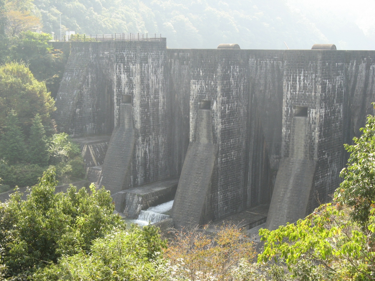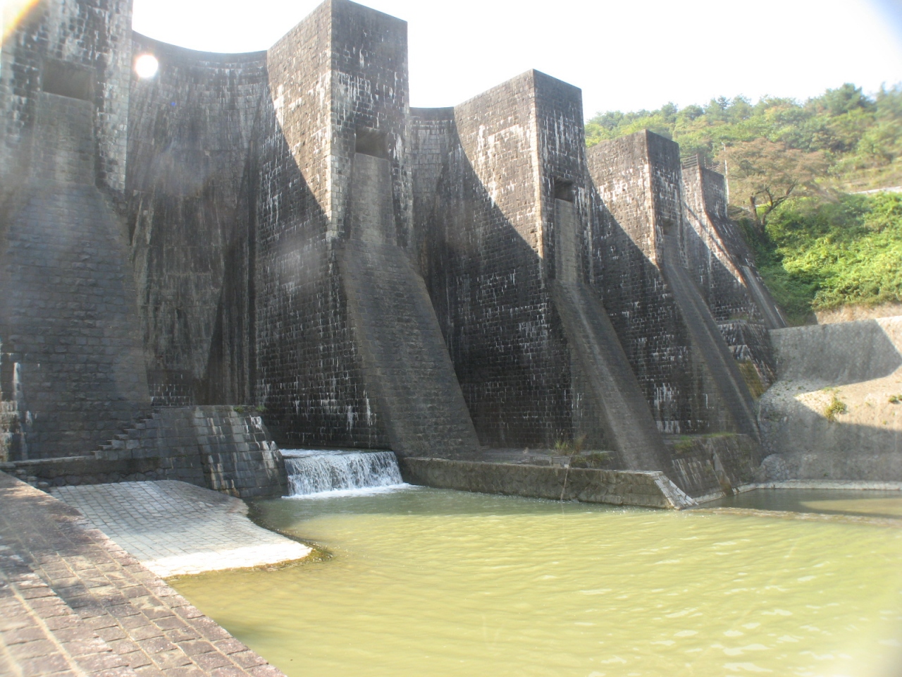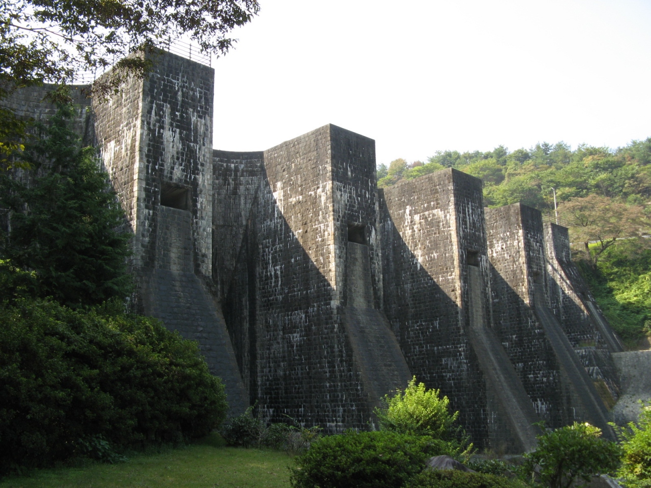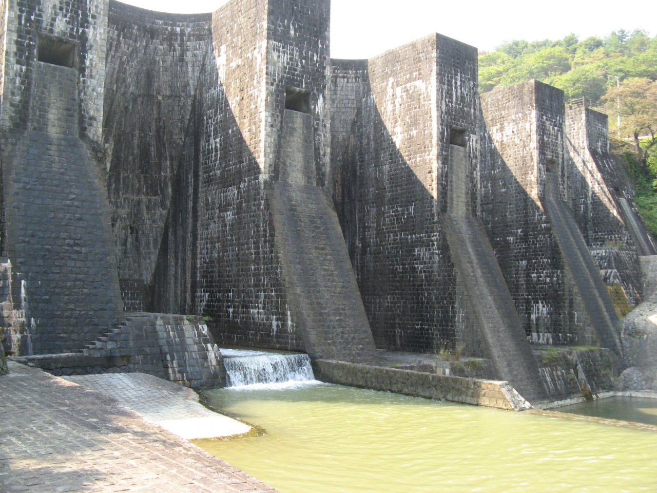 ダムは大正15年(1926年)に着工し、4年の歳月をかけて完成。堤長145m、堤高30m、中央部に5個のアーチと6個の扶壁をもった珍しい構造の日本最古の石積式アーチダムで、国の重要文化財に指定されており、現在でも観音寺市一帯に水を供給しています。