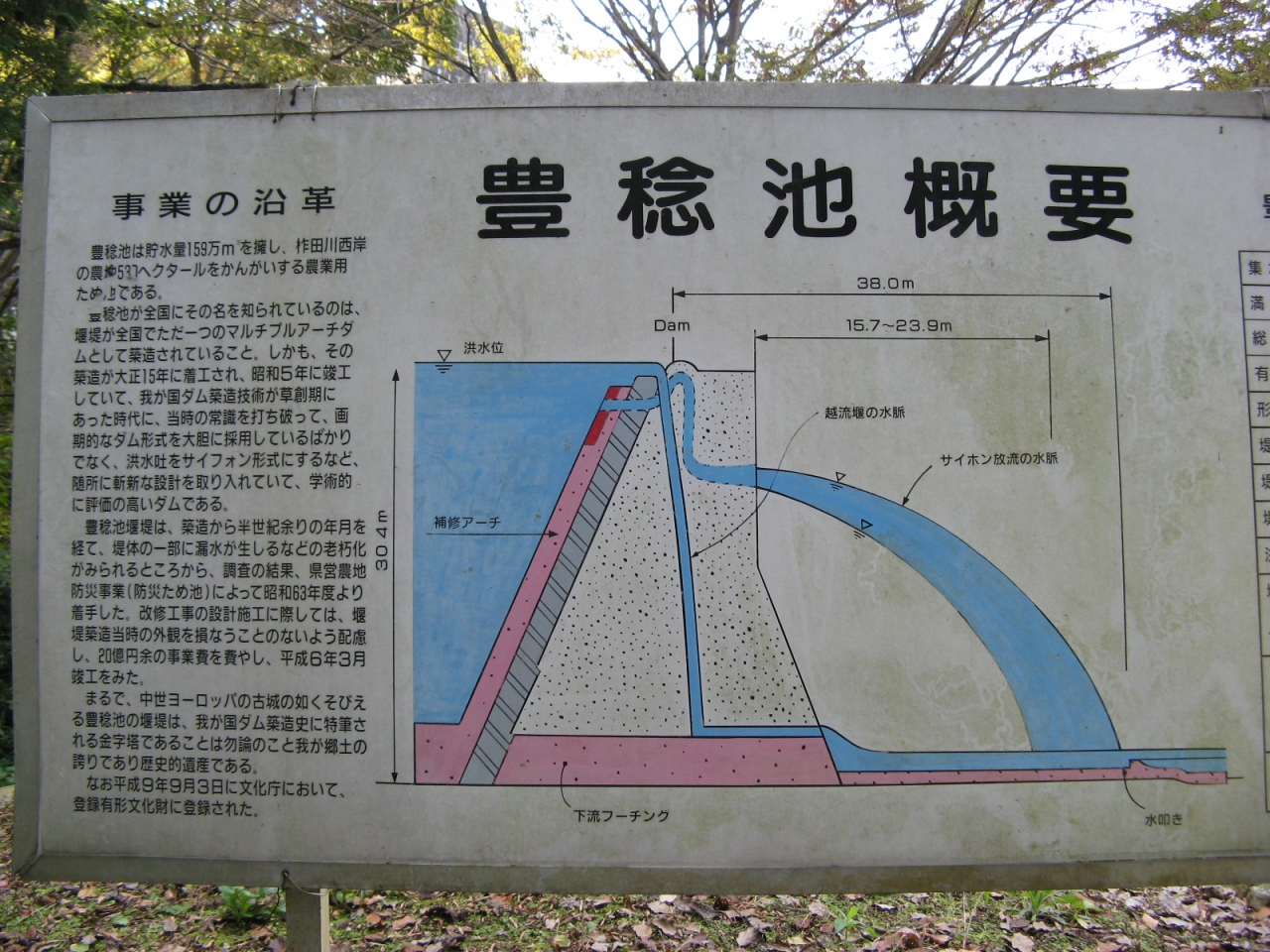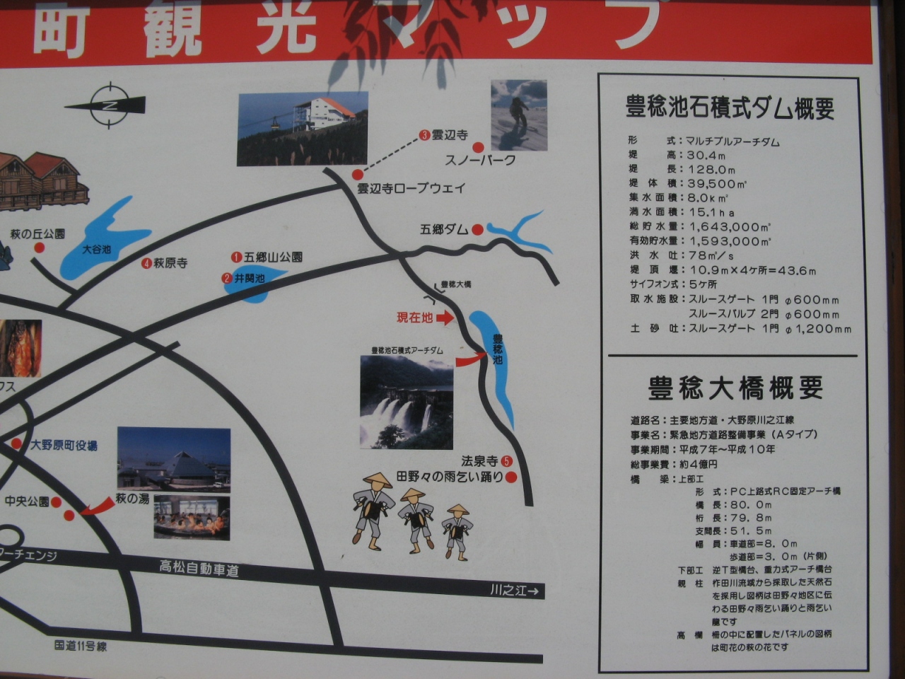 四国一周旅行のときに訪れました。観音寺市を通る県道8号線を南下すると県道9号線と交わるところに出ます。県道9号線を柞田川沿いに2~3分走ると県道から坂道を下りた所に豊稔池遊水公園があり「豊稔池石積式アーチダム」の堰堤を下から見上げることができます。