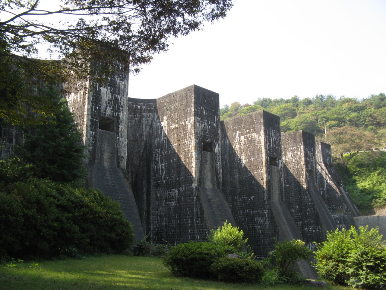 長い年月の風雪にさらされたダムは、ヨーロッパの古城を思わせる貫禄があり、なんともいいがたい雰囲気を持っていました。なお、ダムの下には散策コースを備えた遊水公園があり、県道からは堰堤上部を見ることが出来ます。