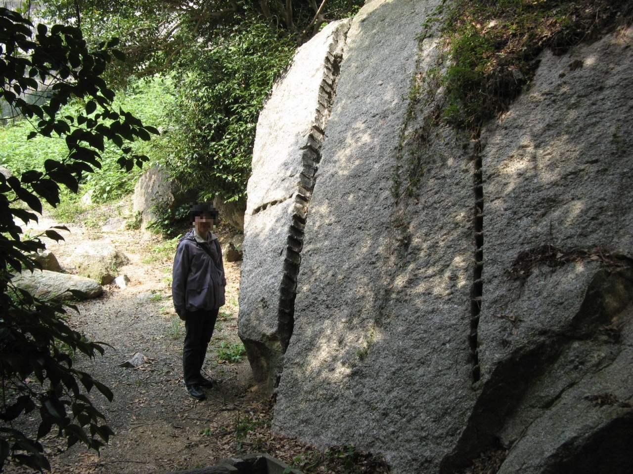 姫路からのフェリーが着く小豆島の東玄関、福田港から国道436号線を走ること約10分、小豆島町の岩谷地区に到着します。ここには江戸時代初期、大坂城の石垣用の石を切り出した丁場(ちょうば)と呼ばれる作業場がそのまま残っており「大坂城石垣石切丁場跡」として国の史跡になっています。