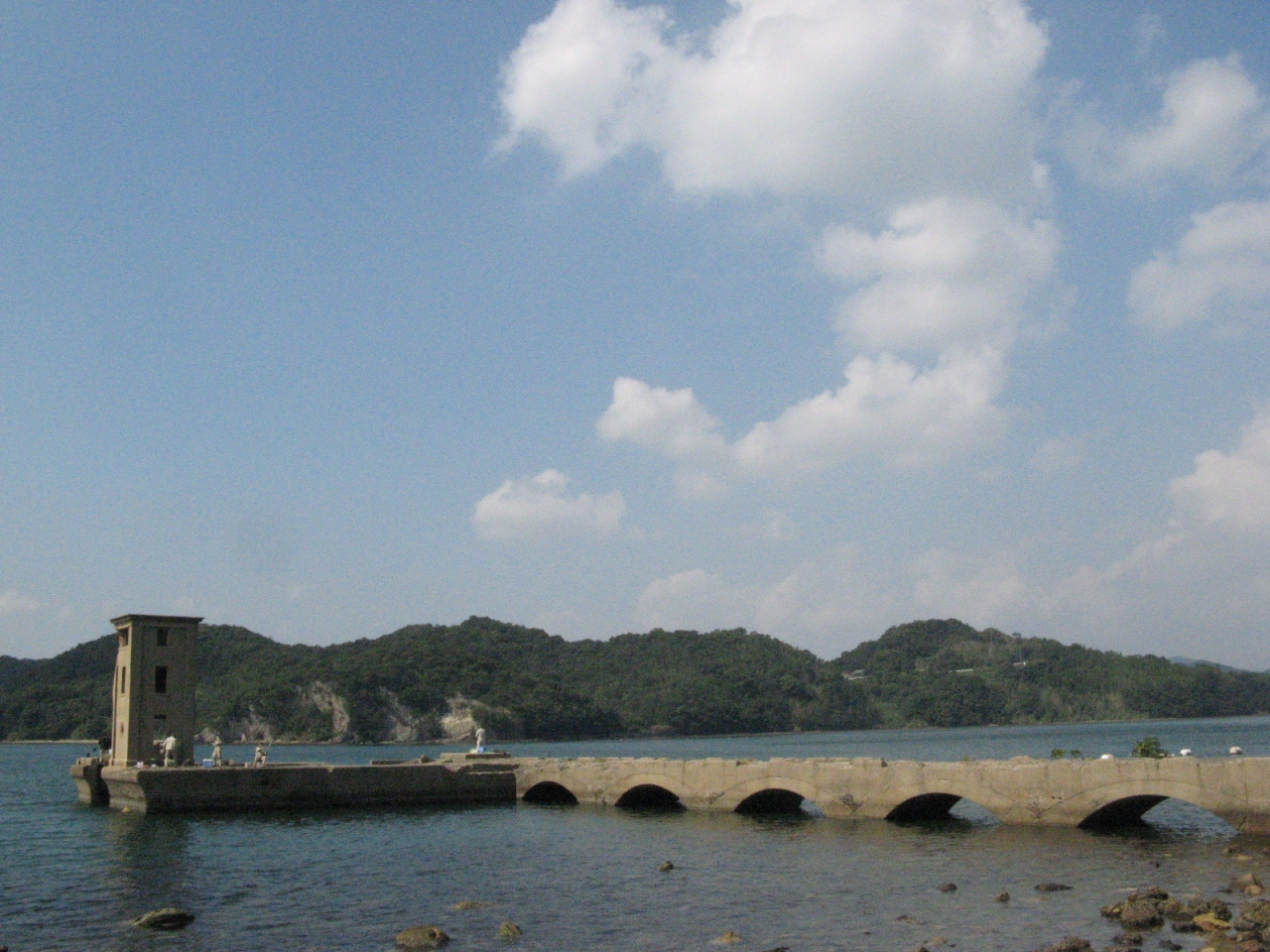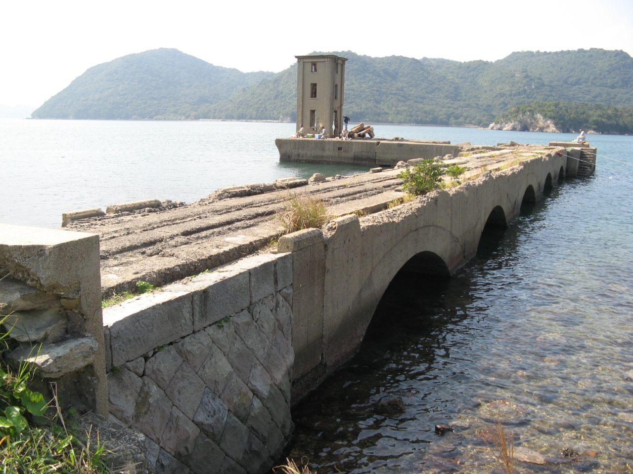 川棚町内を東西に横切る国道205号から「片島」の先端へ続く路地に入り、集落が途切れるところまで進むと5連アーチが特徴的な桟橋が見えてきます。このあたりは絶好の釣りポイントらしく、訪れたときも数人釣りをしていましたので釣り人の邪魔にならない様、静かに見て回りました。- 旅行時期