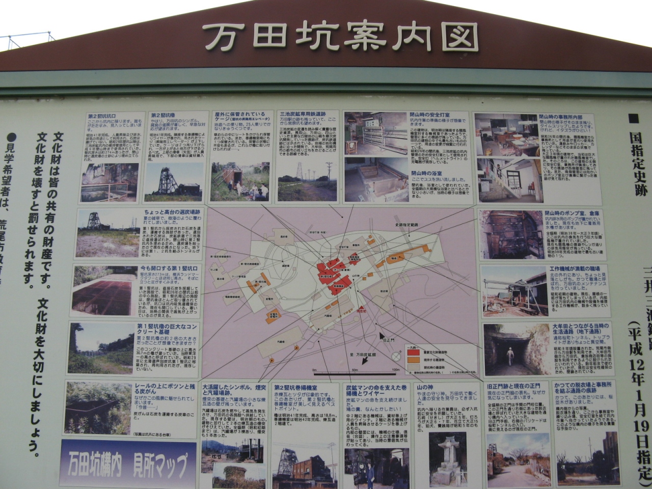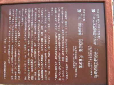 宮原坑跡は囚人労働に支えられていた明治を代表する炭坑跡で平成10(1998)年に国指定重要有形文化財に指定されています。現存遺構として第二竪坑関連施設である鋼鉄製の竪坑櫓や捲揚機室、デビーポンプ室外壁、職員社宅などを見ることが出来ます。見学については外観の見学は自由ですが、敷地内の立ち入りにあたっては大牟田市生涯学習課への問合せが必要です。訪れたときはボランティアの方に丁寧に案内して頂き、『坑内で働かされていた馬は真っ暗闇での労働が続いて目が見えなくなり、死ぬまで外界に出られなかった。』など当時の過酷な採炭状況の説明を受けました。