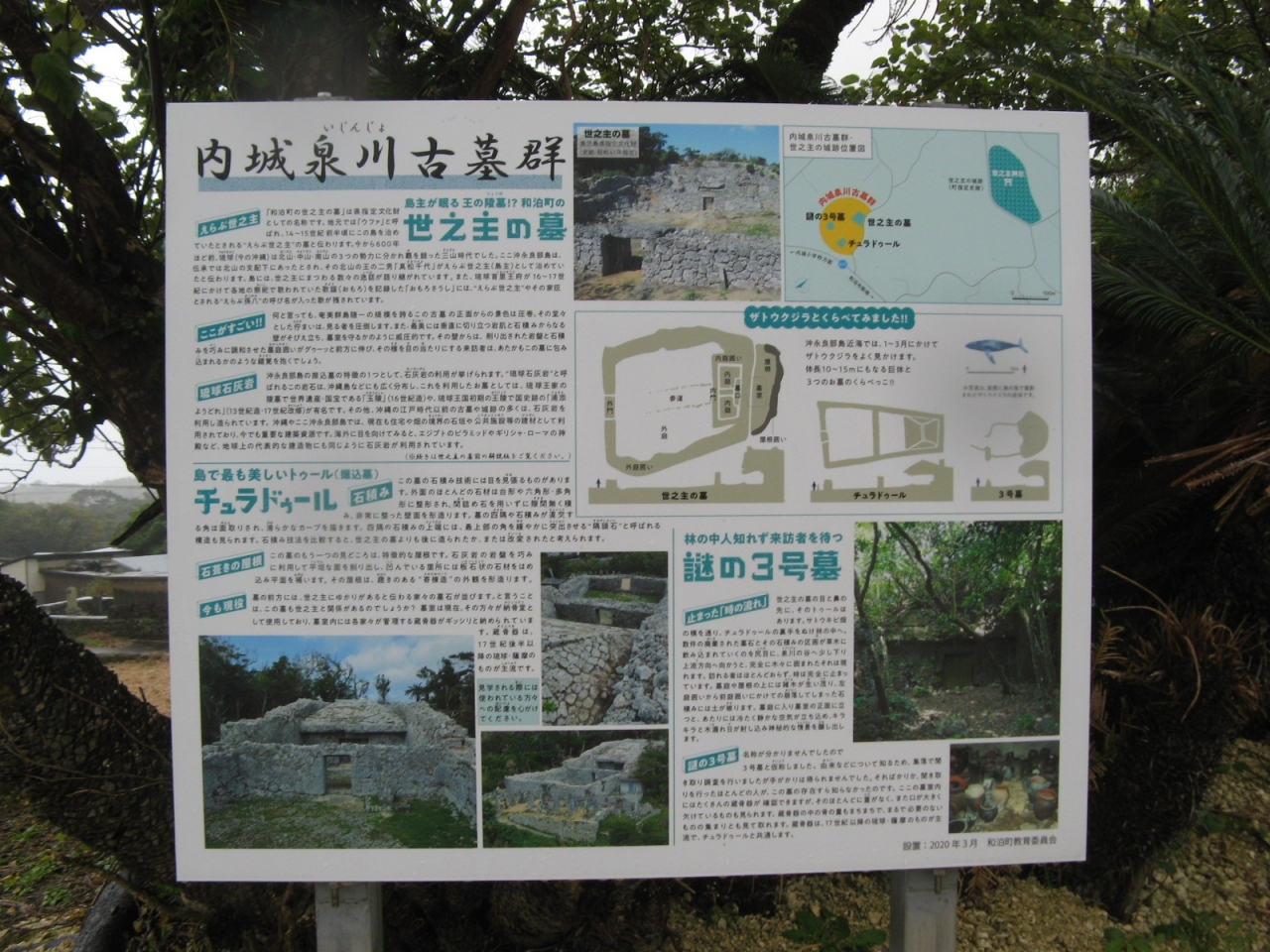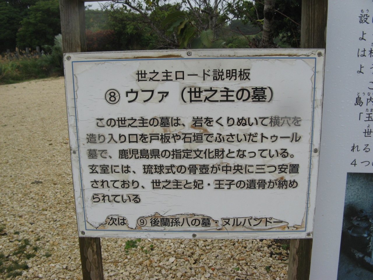 空港でもらった観光パンフレットに載っていたので訪れました。現地にある説明板(詳細は添付写真参照)によると『14~15世紀にこの島を治めていた、「えらぶ世之主」の琉球式墓。岩壁を掘り込んだトゥール墓で墓室内には中央に3つ、四隅に4つの沖縄産蔵骨器が収められ、中央が世之主、奥方、子、四隅が家臣の四天王のものとされる。』とありました。