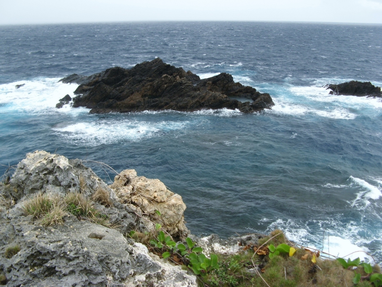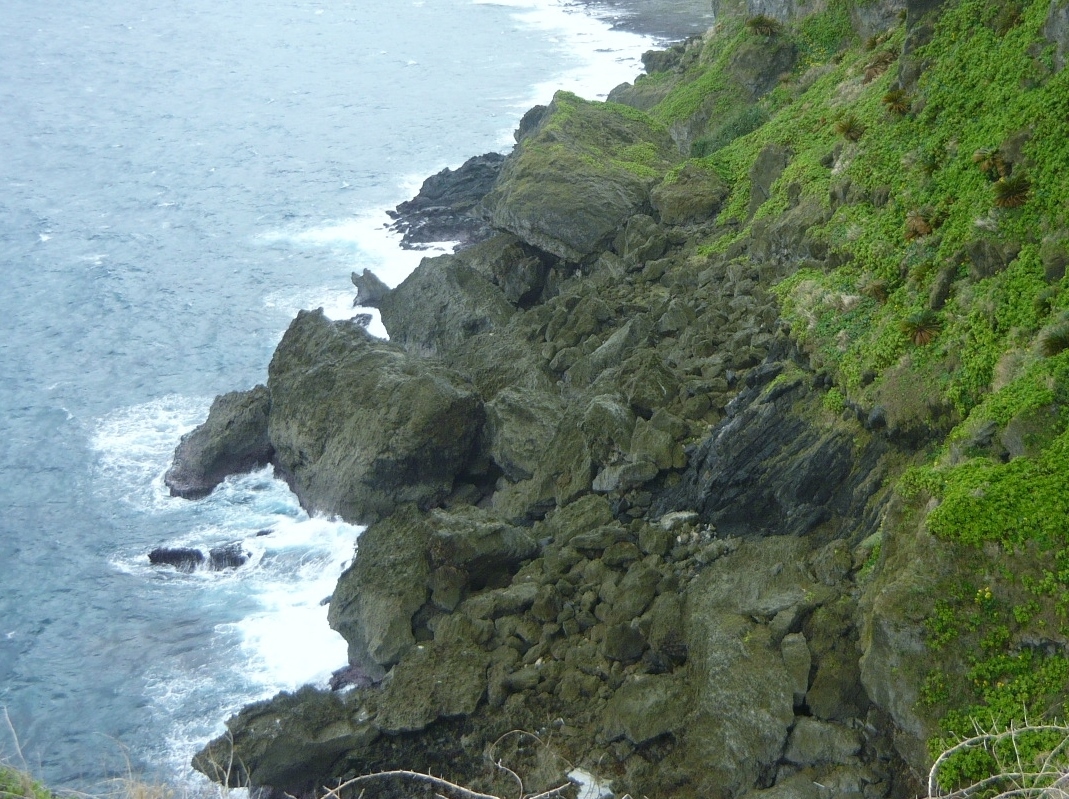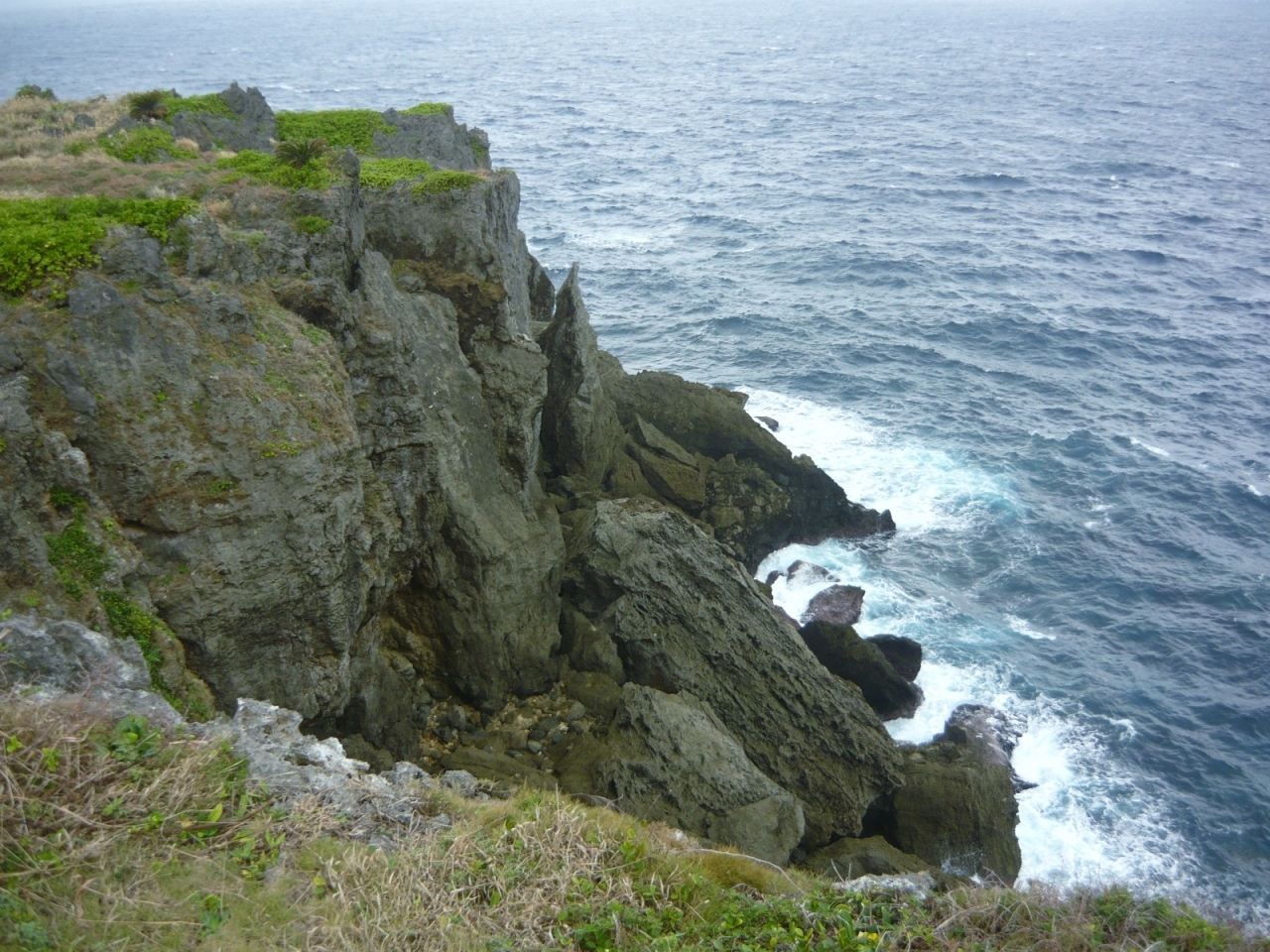 田皆岬では二つの特徴ある岩の風景を観ることができました。断崖の方へ整備されている草原の中の遊歩道を歩くと所どころに石灰岩が雨水や地下水などで浸食されたことによってできる特有の地形(カルスト地形)を見ることができます。 断崖絶壁から海側を望むと硬そうな黒っぽい岩の上に層になった隆起サンゴ礁層が確認することが出来ます。田皆岬では、断崖絶壁と綺麗な海に目が行きますが、断崖に至る遊歩道や灯台周りも歩いてゆっくり散策されると良いと思います。