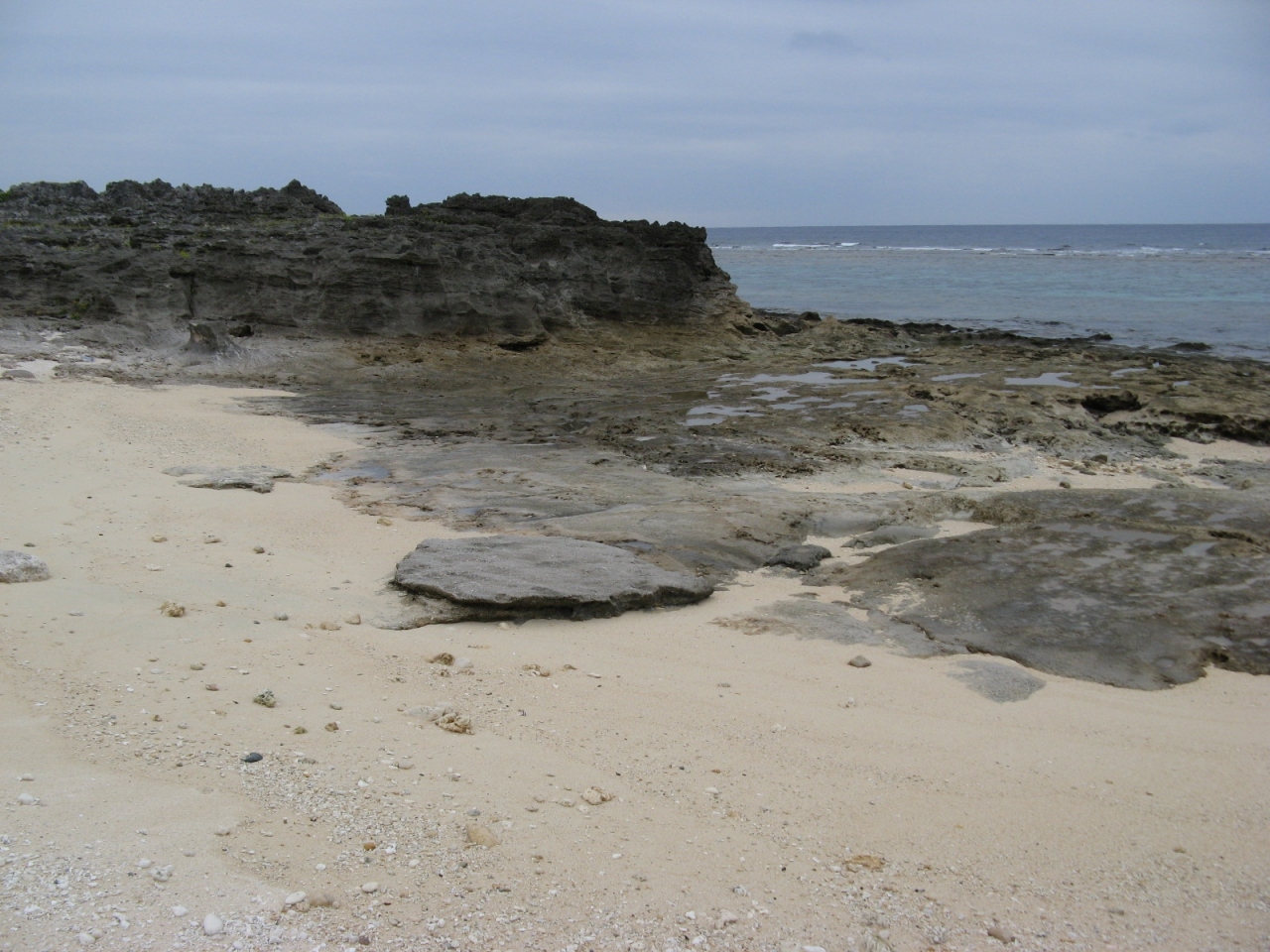 観光パンフレットには、「ビーチロック」は、炭酸カルシウムのセメント作用により海浜堆積物が固まってできた板状の石灰質の砂礫岩で、鹿児島県指定天然記念物とあります。