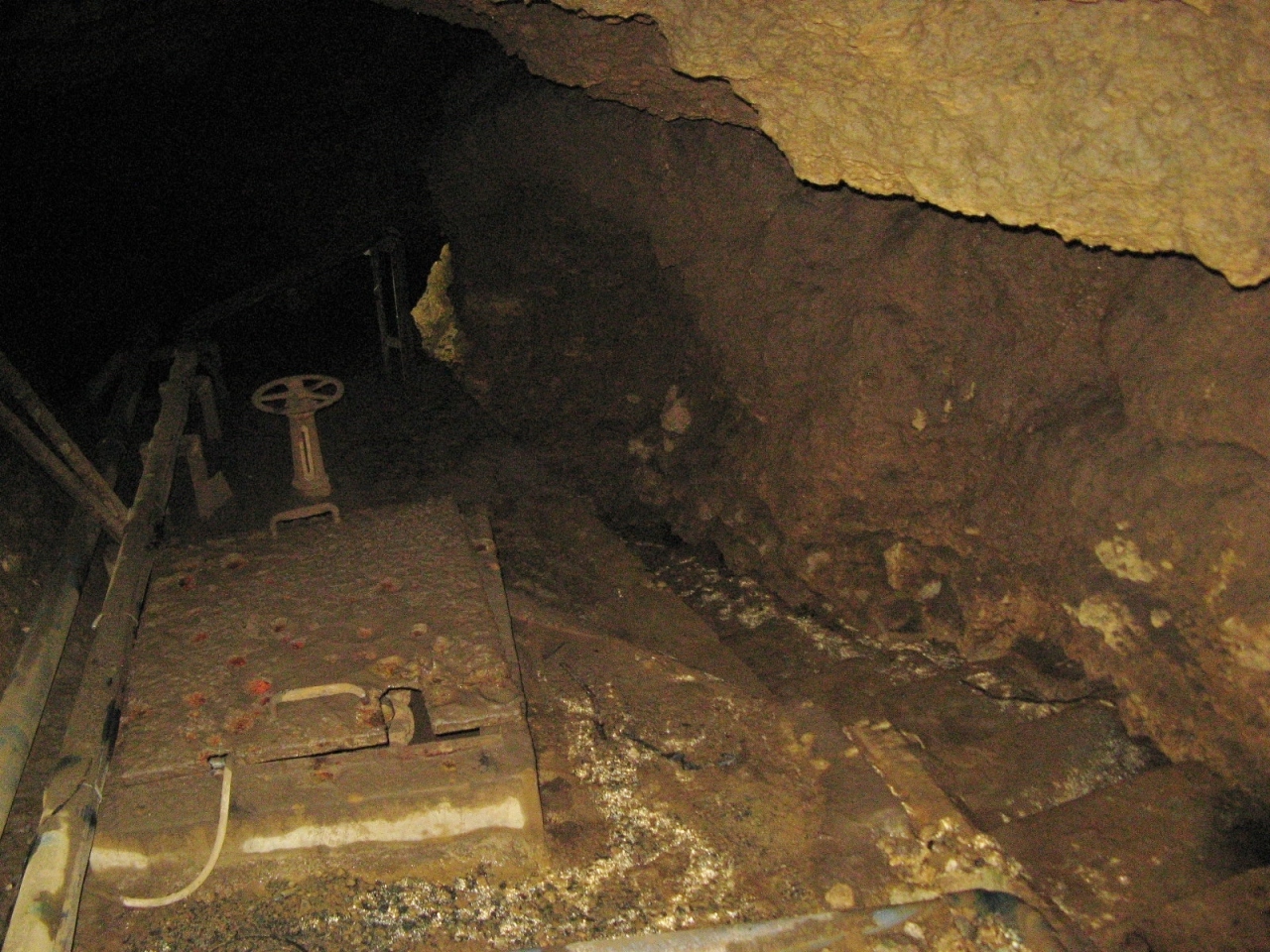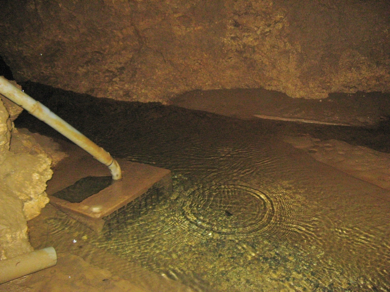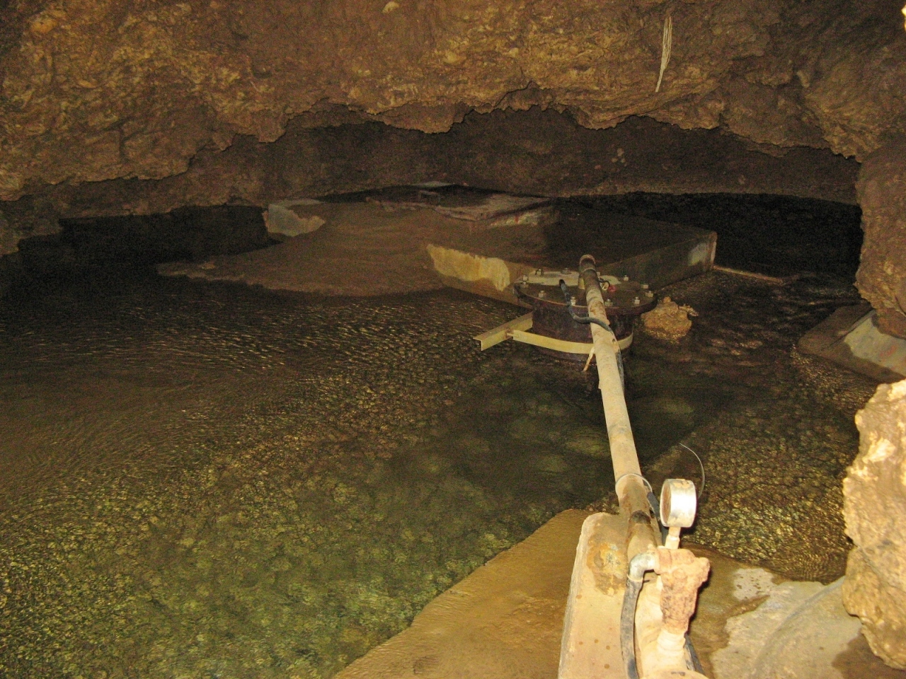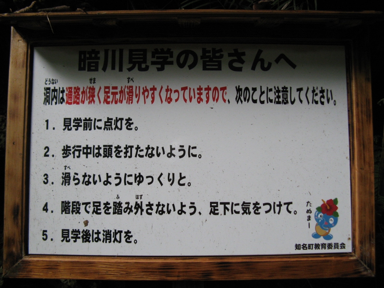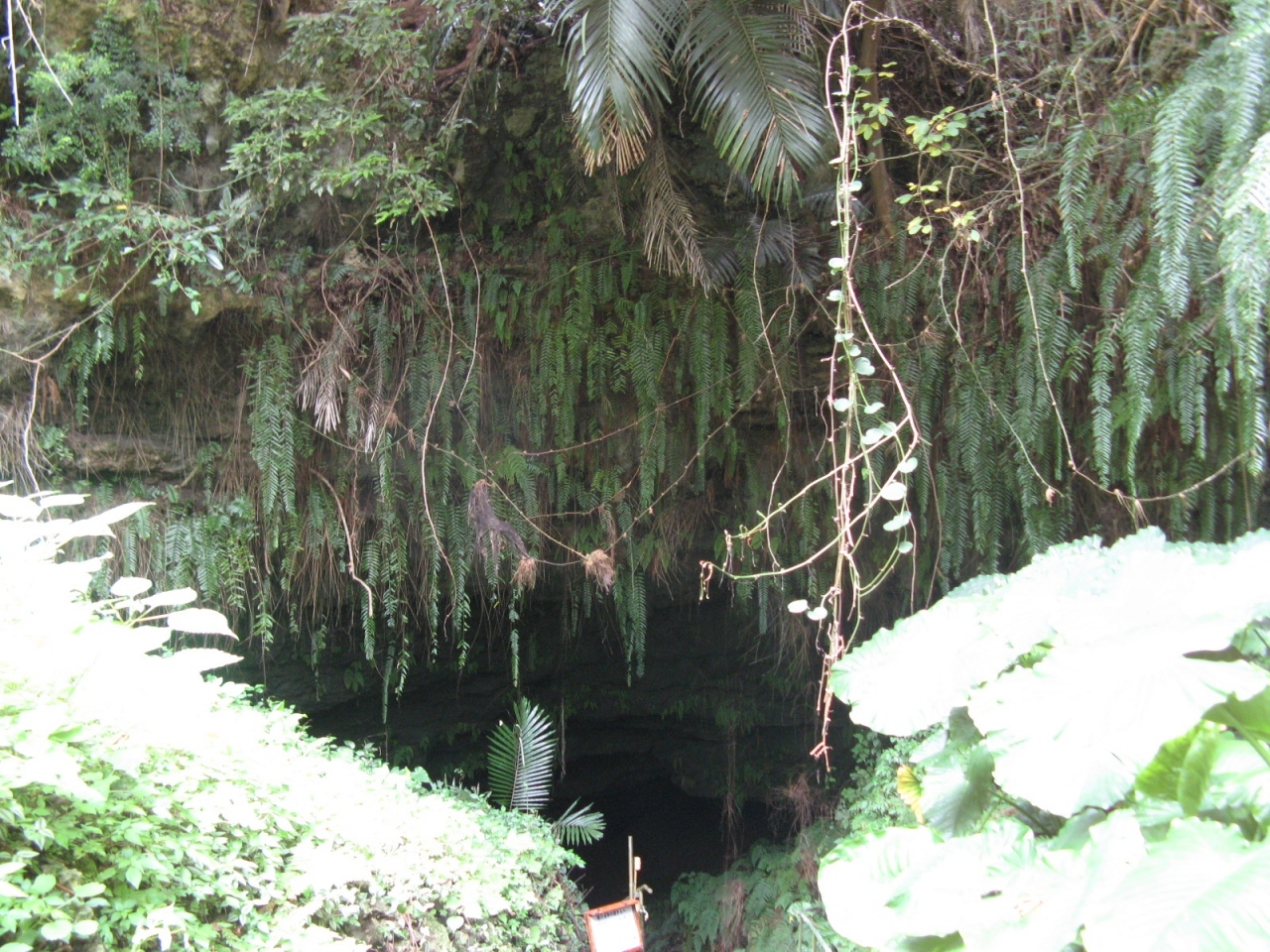 南国の草木が生い茂る鍾乳洞入り口に電気のスイッチがあり、点灯して薄暗い長い階段を下りて行くと、洞窟内に川が流れています。水は結構豊富で透明です。現地にある説明板には、昭和31年に頭の上に大きな水桶を載せて水を運んでいる女性の写真が載っていて、簡易水道ができるまで大変な苦労があったということが判りました。