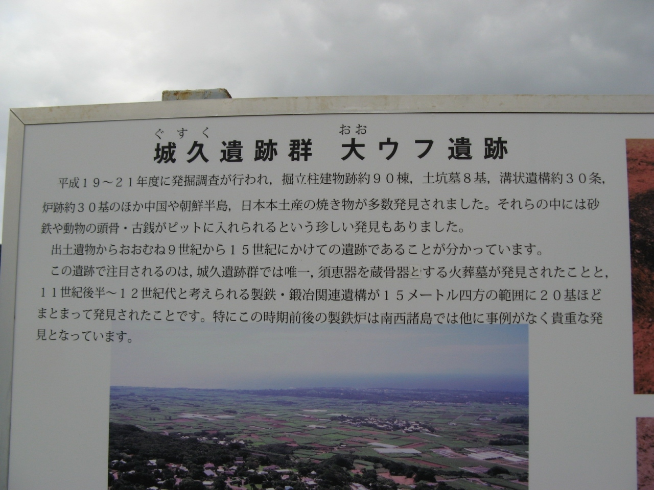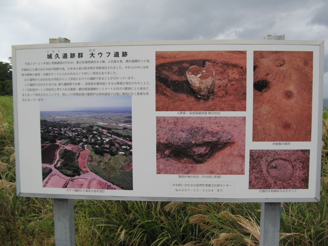 現地にある説明板によると、9世紀~15世紀(本土の平安から室町時代ごろにあたる)の喜界島を代表する遺跡で、建物跡や製鉄遺構、白磁、ガラス玉、徳之島で焼かれていたカムィヤキなどが見つかっているとか。
