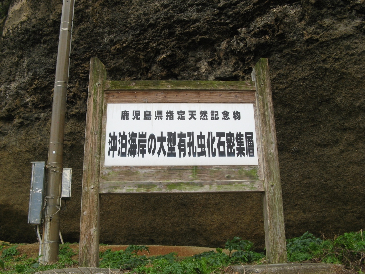 田皆崎から東の方向へ海岸に沿う道路を進んで行くと沖泊港が見えてきます。沖泊港へ至る下り坂を下がり切ったところ、右手に「沖泊海岸の大型有孔虫化石密集層」と書かれた看板があります。看板の背後には大きな崖があり、崖の上の方は琉球石灰岩が見られますが、中央より下側に大型有孔虫の化石層が見られ、足元にも崖から削れ落ちた化石がたくさん積み重なっています。