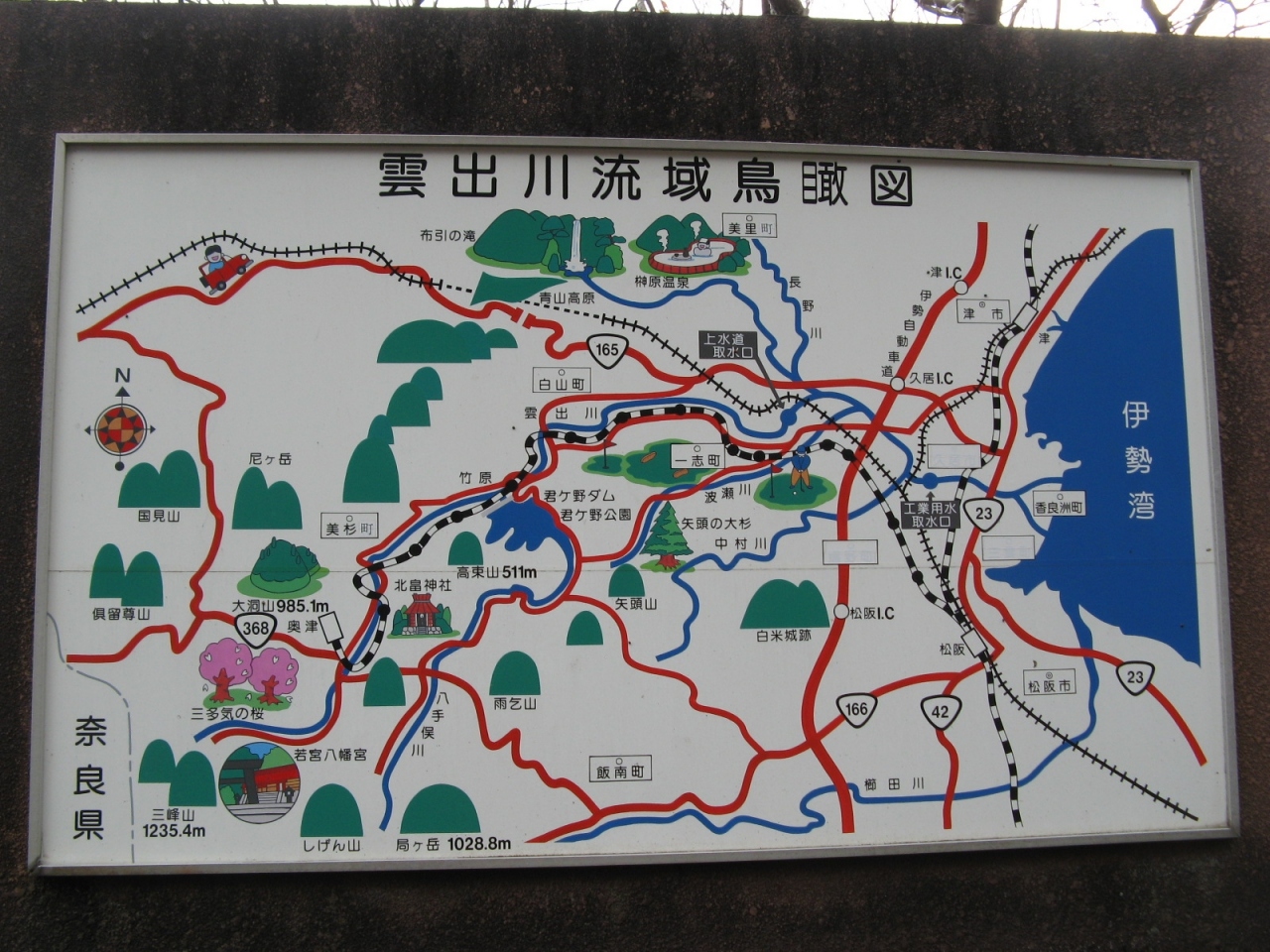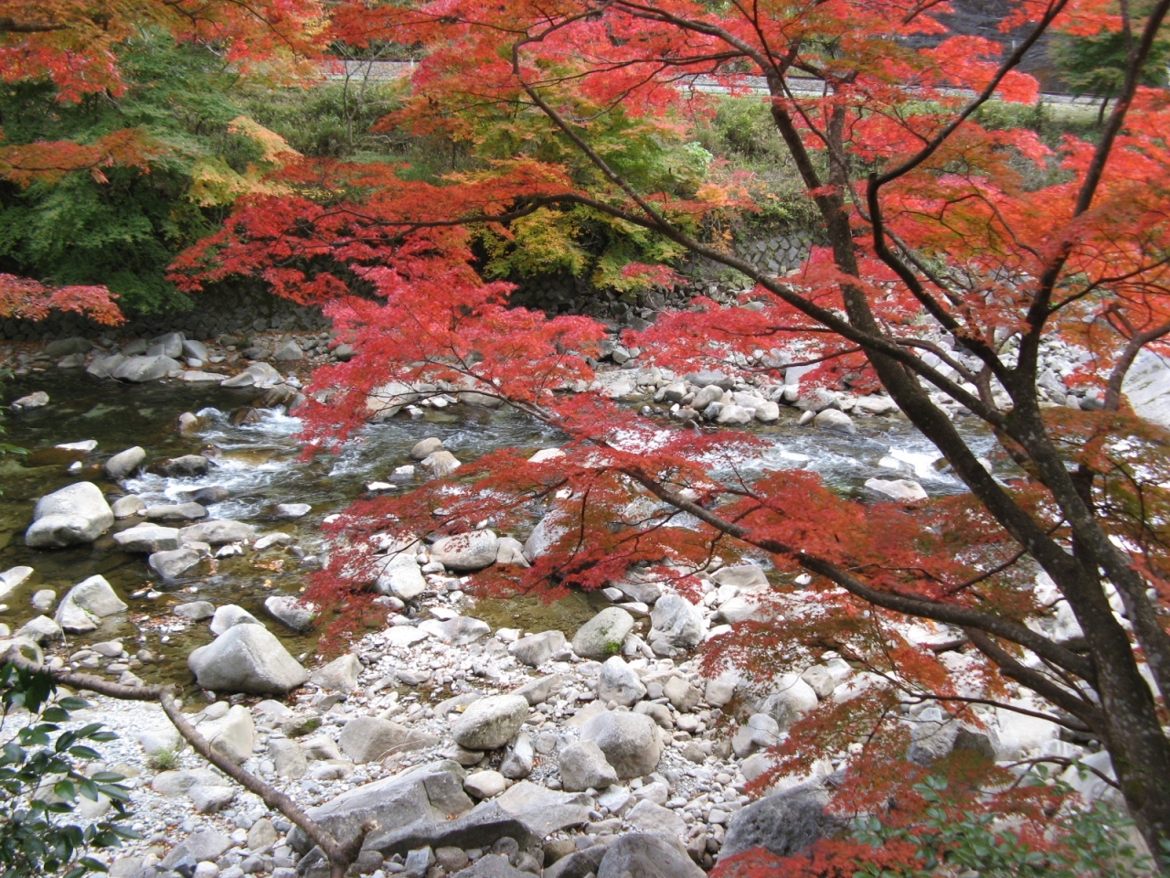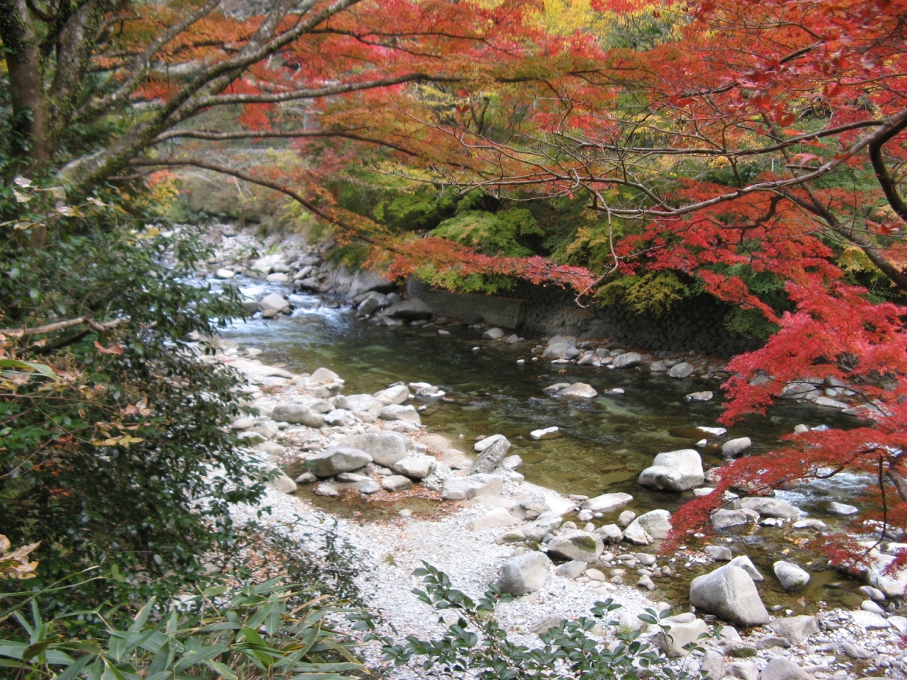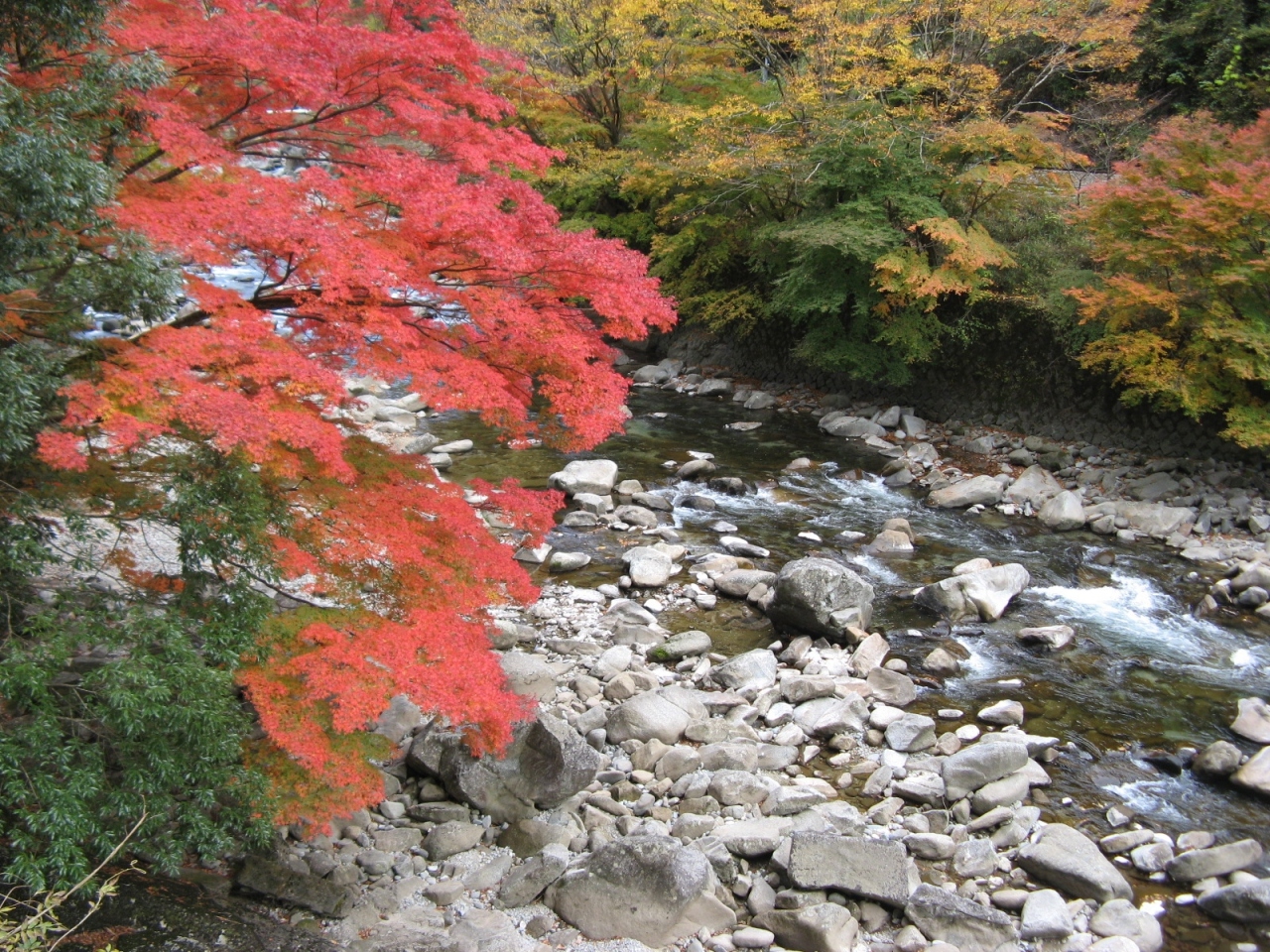 「奥一志峡」は、雲出川上流部の渓谷で君ヶ野ダムから伊勢奥津 (おきつ) 付近までをさします。君ケ野ダムから松坂方面に向かう途中、県道15号線を走ると、所どころで素晴らしい渓谷美を望むことができました。訪れたのが11月中旬で紅葉の真っ盛りで、あまりにも綺麗な紅葉を観て車を停めておもわず写真を撮りました。県道から河原に下りて行く場所が見つからず、河原には降りませんでしたが渓谷の紅葉を十分楽しむことができました。雲出川に沿ってJR名松線が通っているので車窓からでも渓谷美を楽しめるのではと思いました。