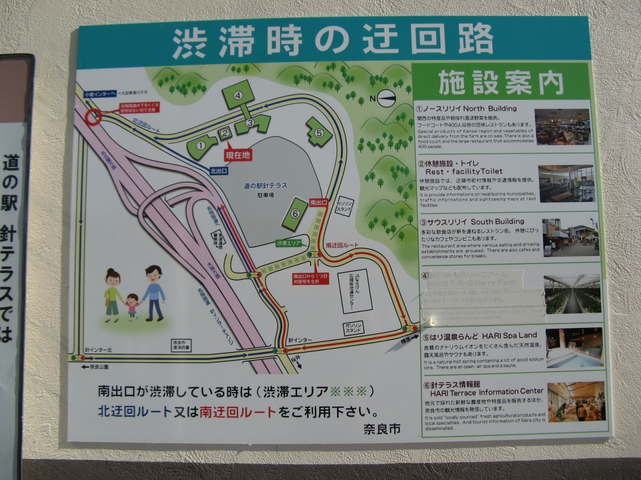 名阪国道の針インターに直結している道の駅です。とても大きな道の駅で、産直品販売所や土産物屋、レストラン、温泉施設など多くの建物があります。“針テラス情報館”には、地元で採れた野菜や果物、物産品の販売や奈良の観光情報を発信するコーナーなどがあり、テーブルやベンチがあって休憩しながらドライブルートの確認をし易かった。わざわざ渋滞時のう回路を示した表示装置(添付写真参照)があるほどなので、行楽日の休日などは混雑するのでしょう。