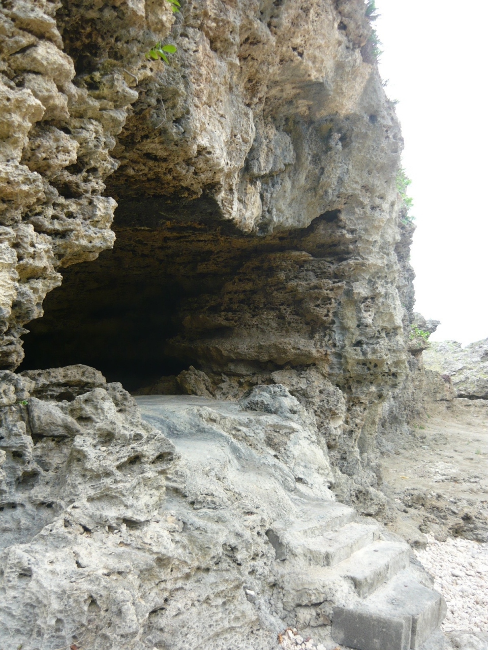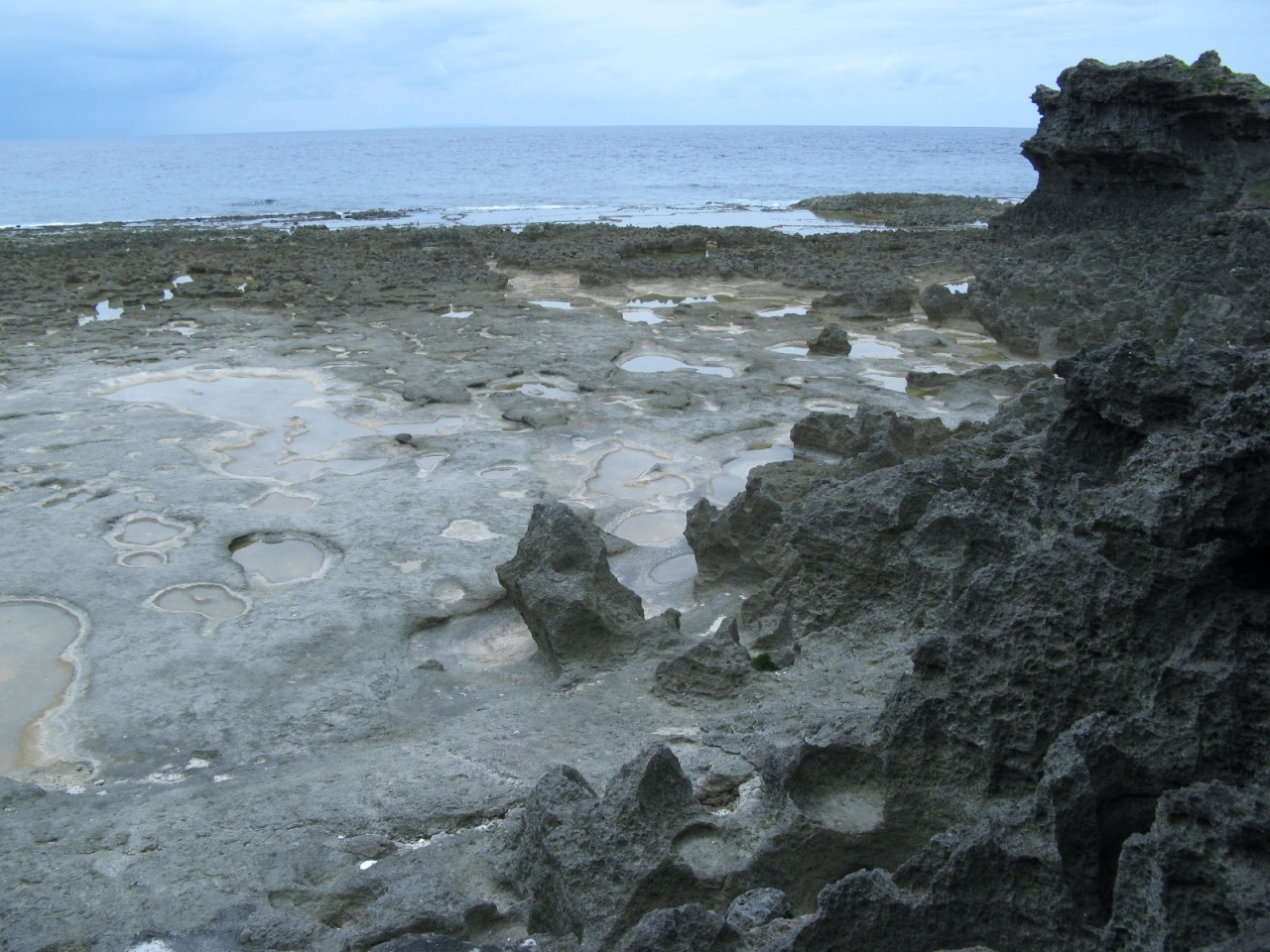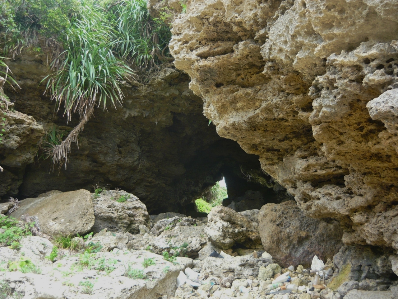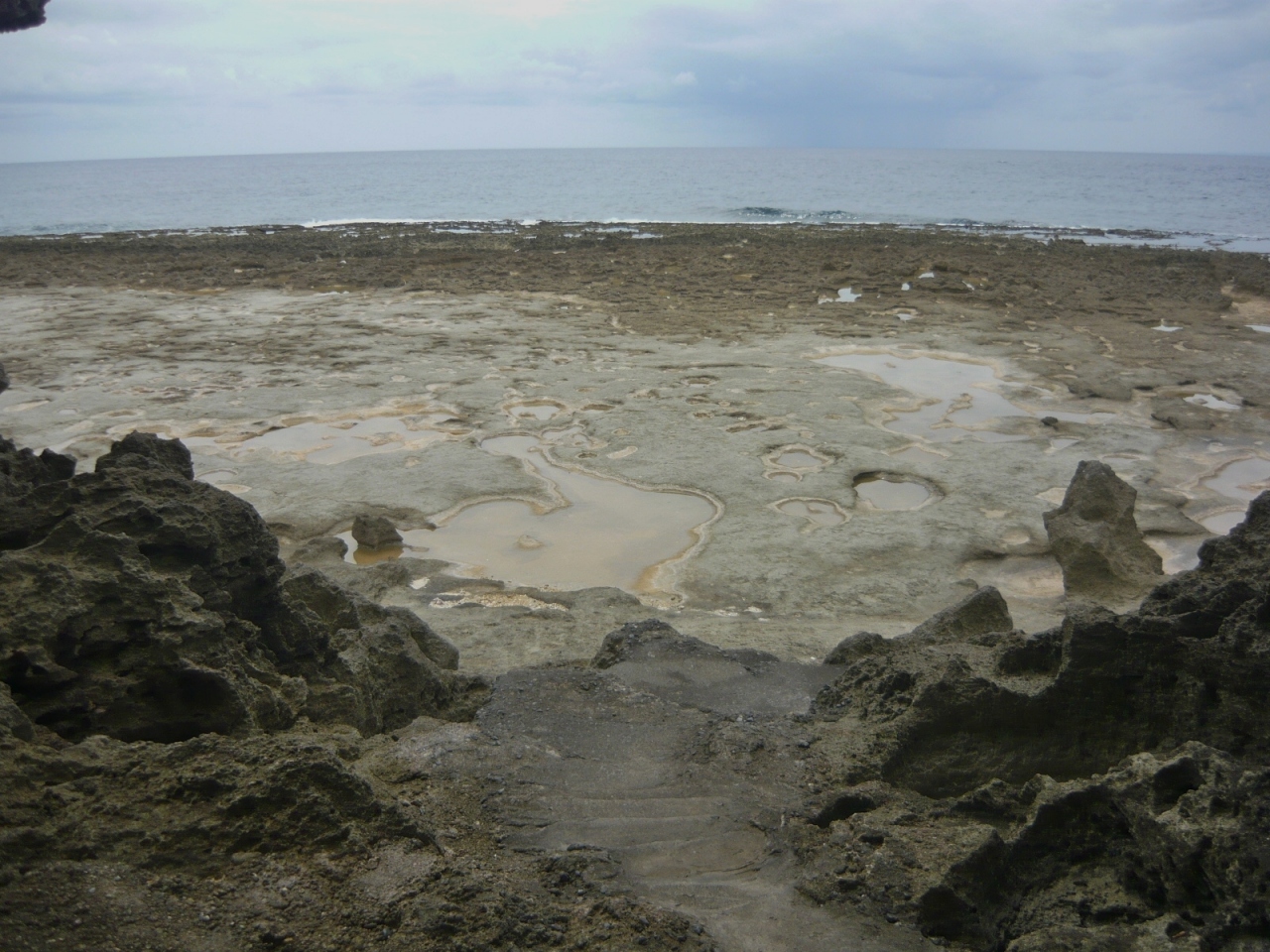 海岸はごつごつとした岩の原っぱの様になっていて、その先に大きな岩に洞穴があり、それを抜けると、ボコボコとした無数のくぼみがあり海水が溜まっています。そこは、もともと海水から塩を作るために、隆起性珊瑚の潮溜まりを人工的に削りならして濃度の高い塩水を溜めるための塩溜まりとして利用していたところです。