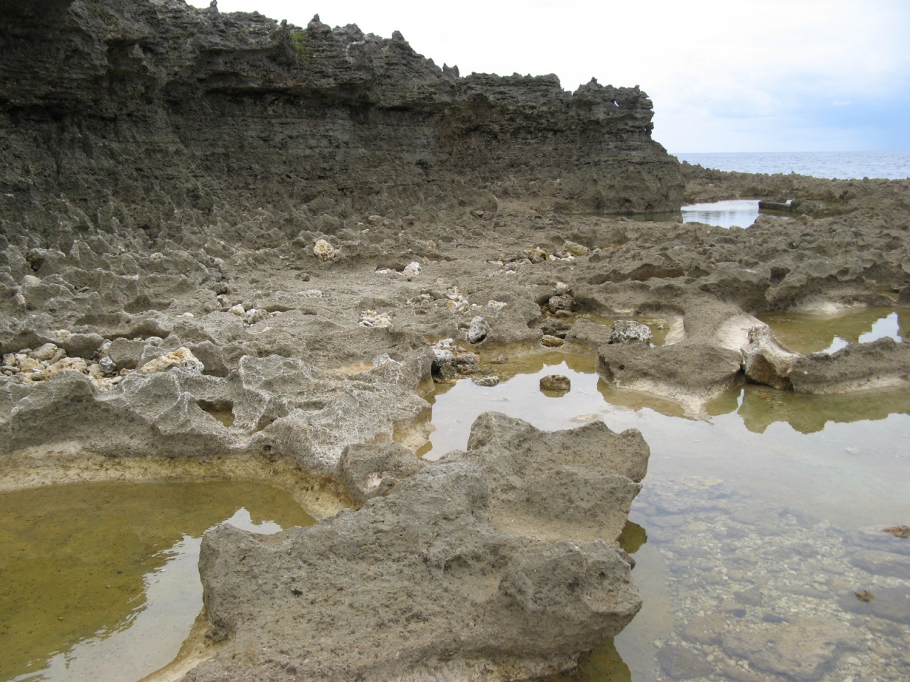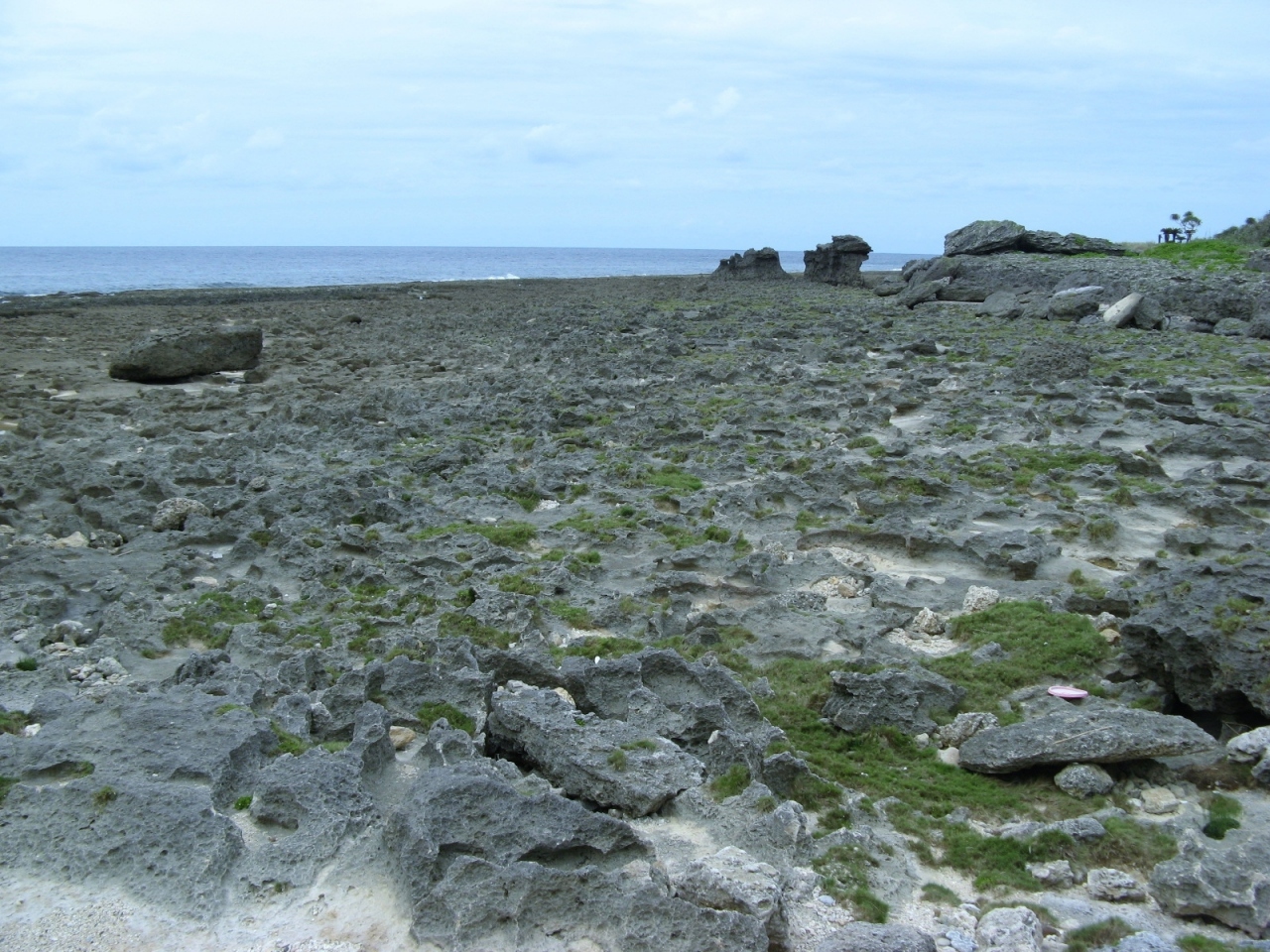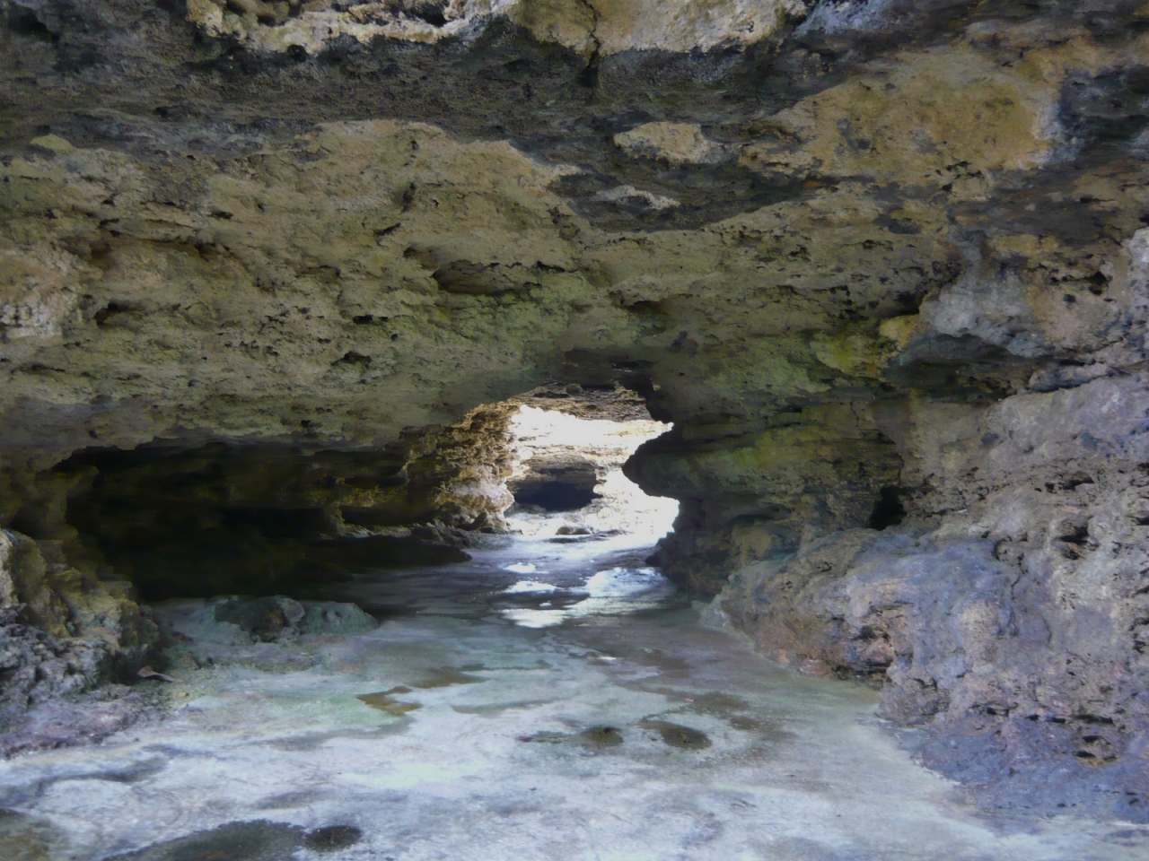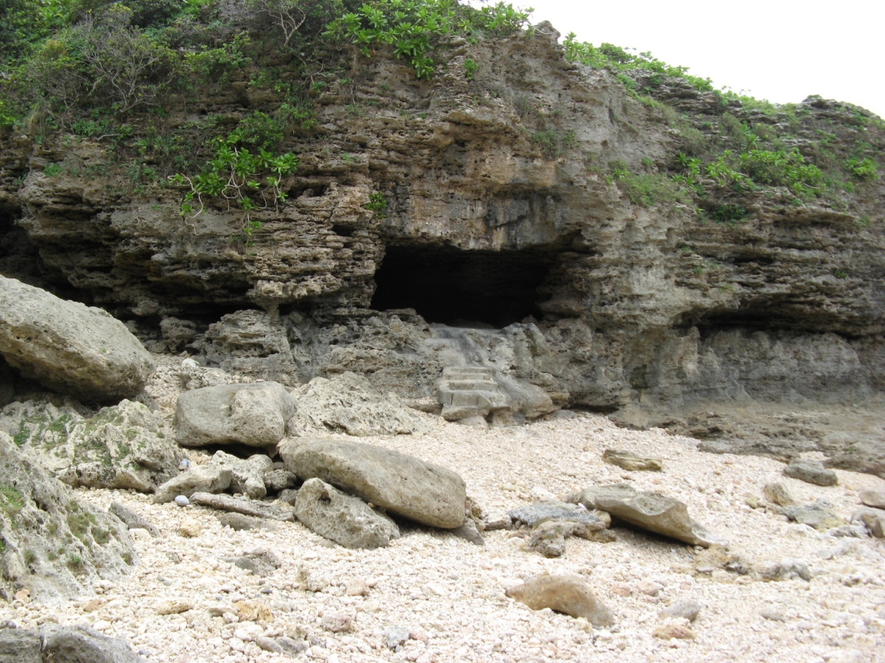 海岸はごつごつとした岩の原っぱの様になっていて、その先に大きな岩に洞穴があり、それを抜けると、ボコボコとした無数のくぼみがあり海水が溜まっています。そこは、もともと海水から塩を作るために、隆起性珊瑚の潮溜まりを人工的に削りならして濃度の高い塩水を溜めるための塩溜まりとして利用していたところです。