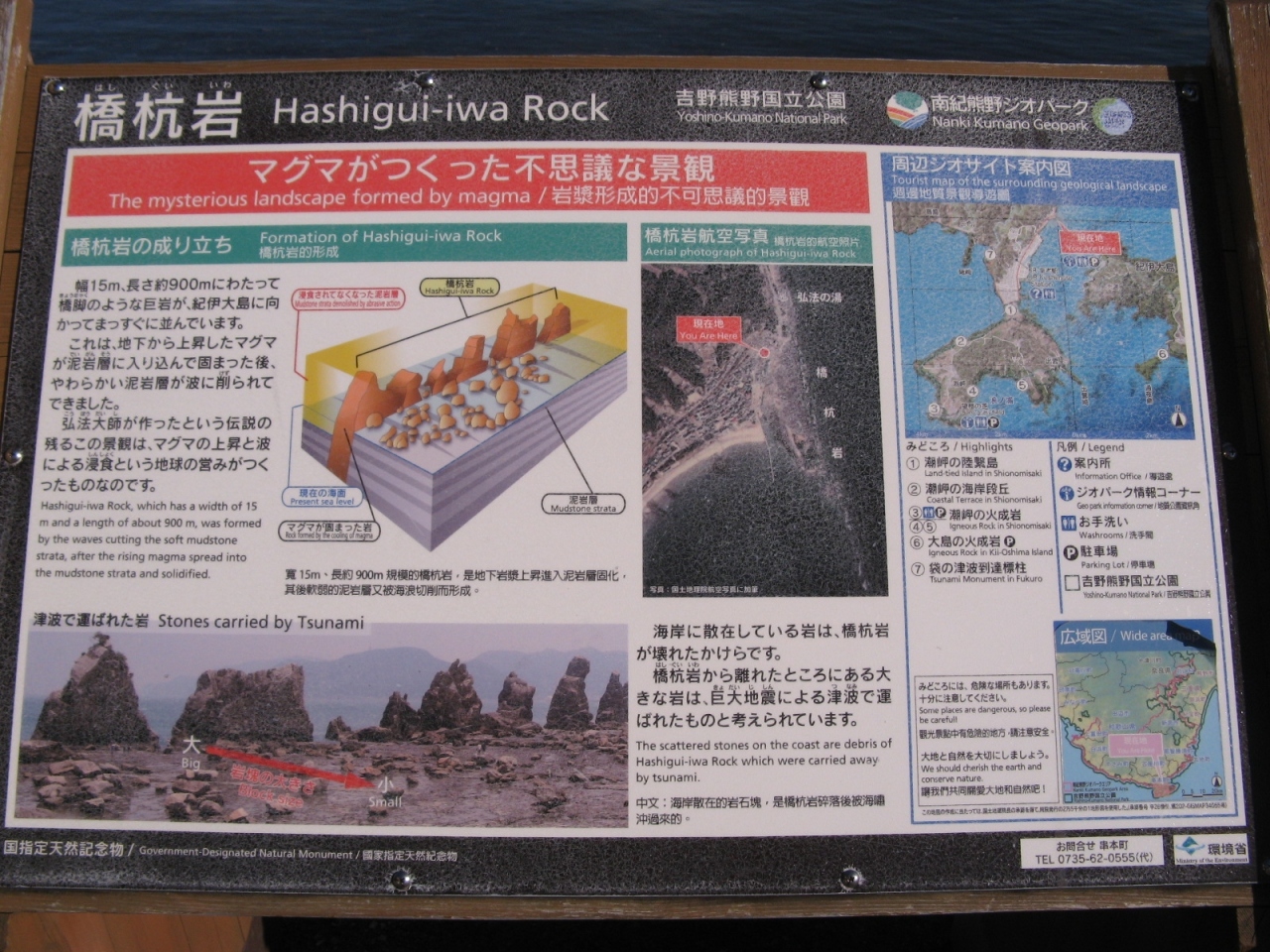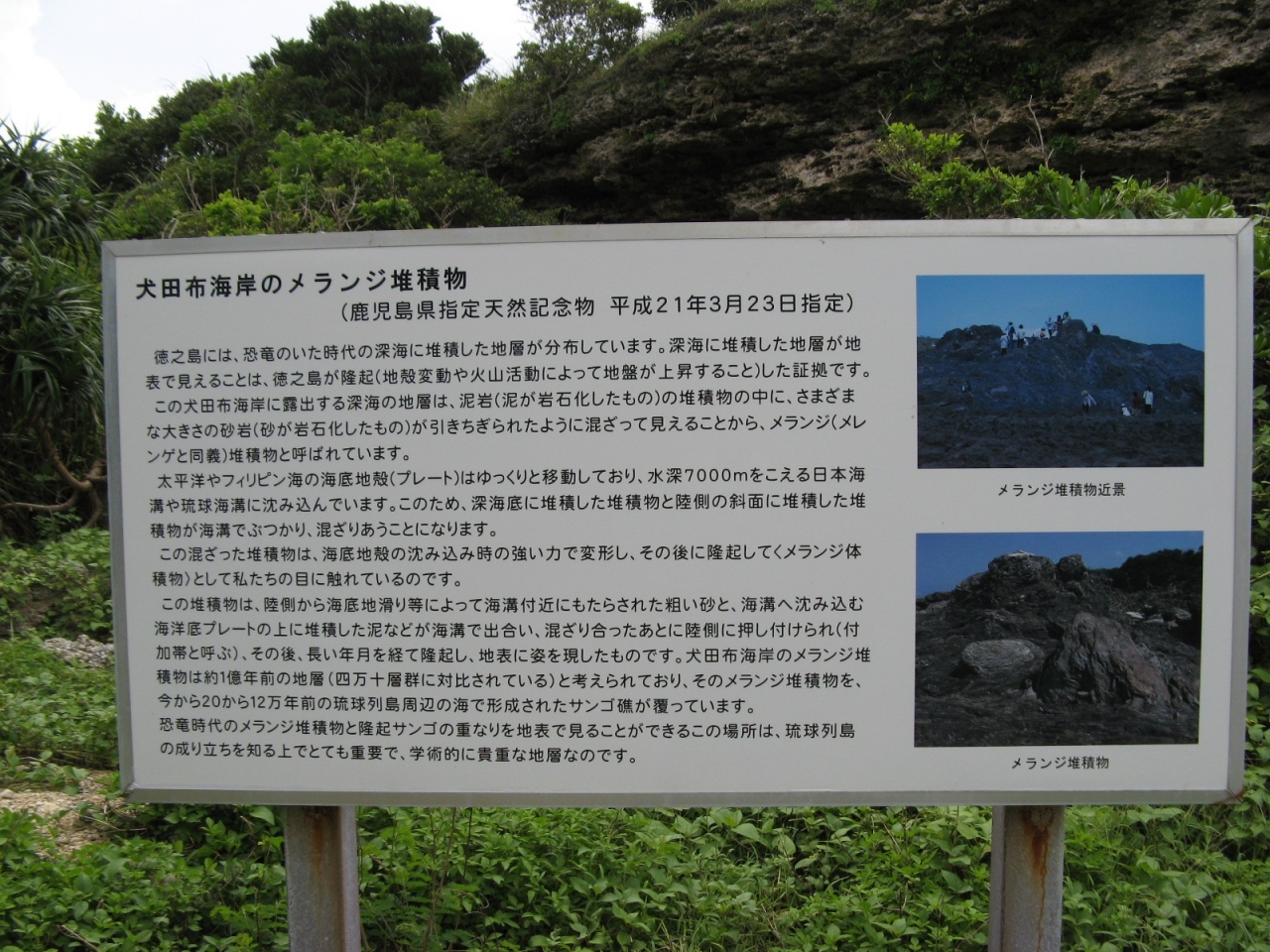 現地にある説明板によると、恐竜のいた時代に深海に堆積していた地層「メランジ堆積物」が隆起によって地表に現れたところで、平成21年に鹿児島県天然記念物に指定されています。