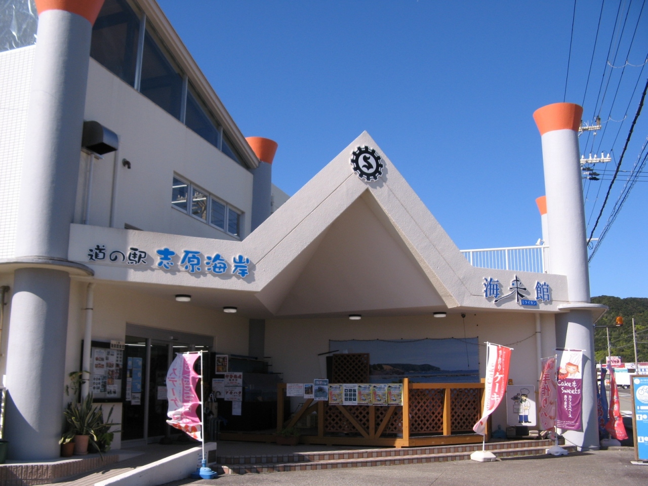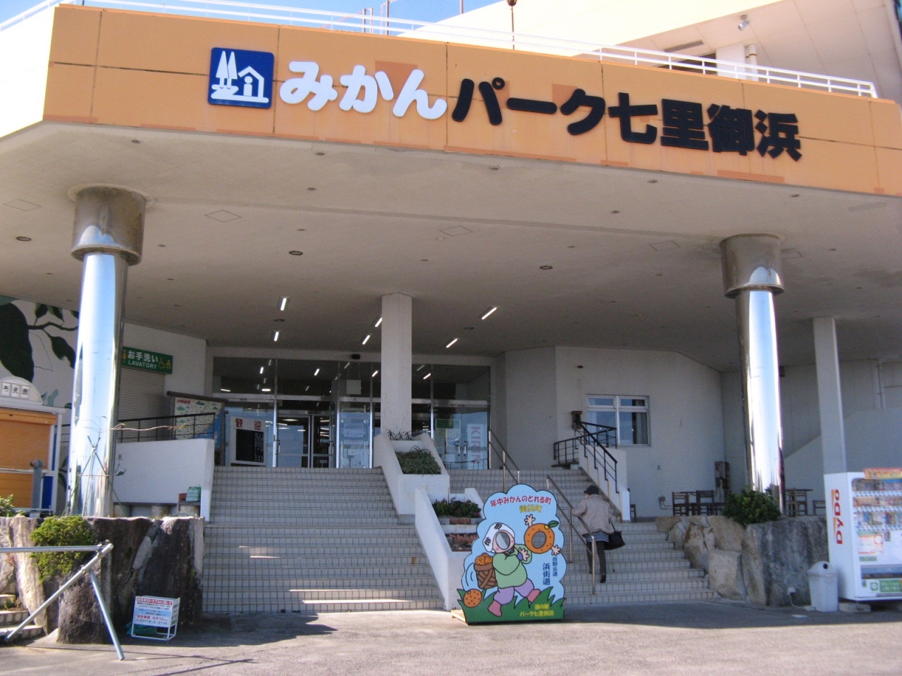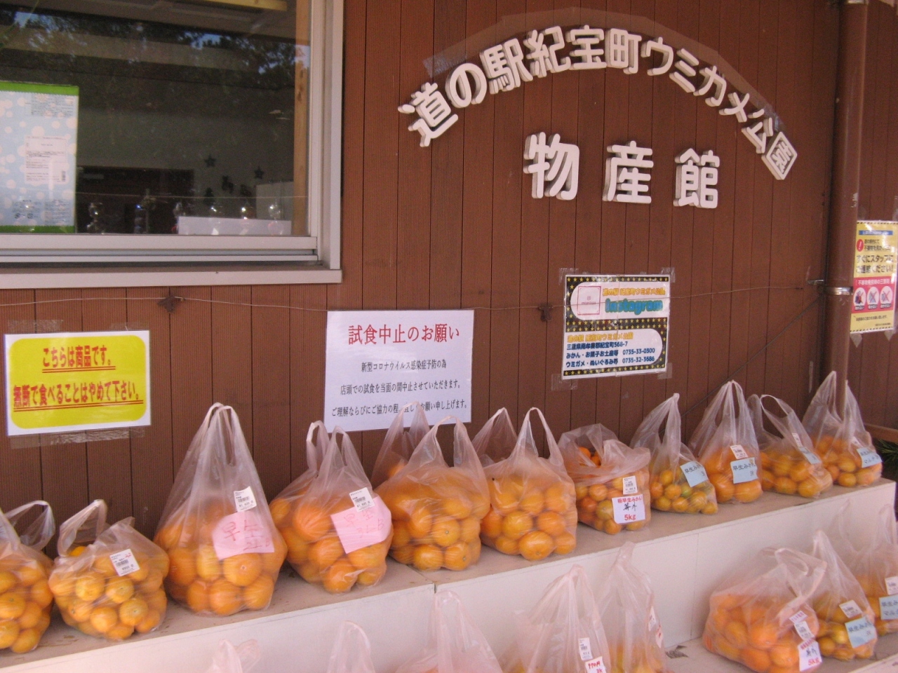 JR紀勢本線・阿田和駅の前にあります。道の駅としては規模が大きく、1階には地域の特産品やお土産を買い物できる、地場産直売場『浜街道』があります。看板に“みかんパーク七里御浜”とあるだけあって、みかんのお菓子などをはじめ、紀州のお土産が多数揃います。入口入ってすぐのところには地元の農園がミカンやジュースなどを販売されていました。コロナ禍のため残念ながら試食はできませんでした。国道を挟んで目の前が渚100選に選ばれている七里御浜に面しているので、浜辺に下りて散策するのに良いところです。