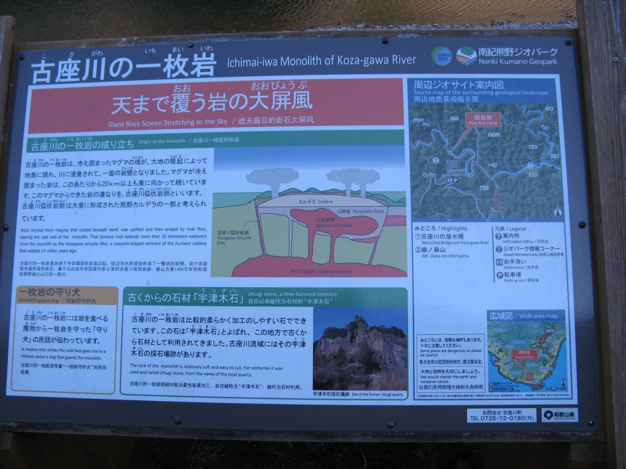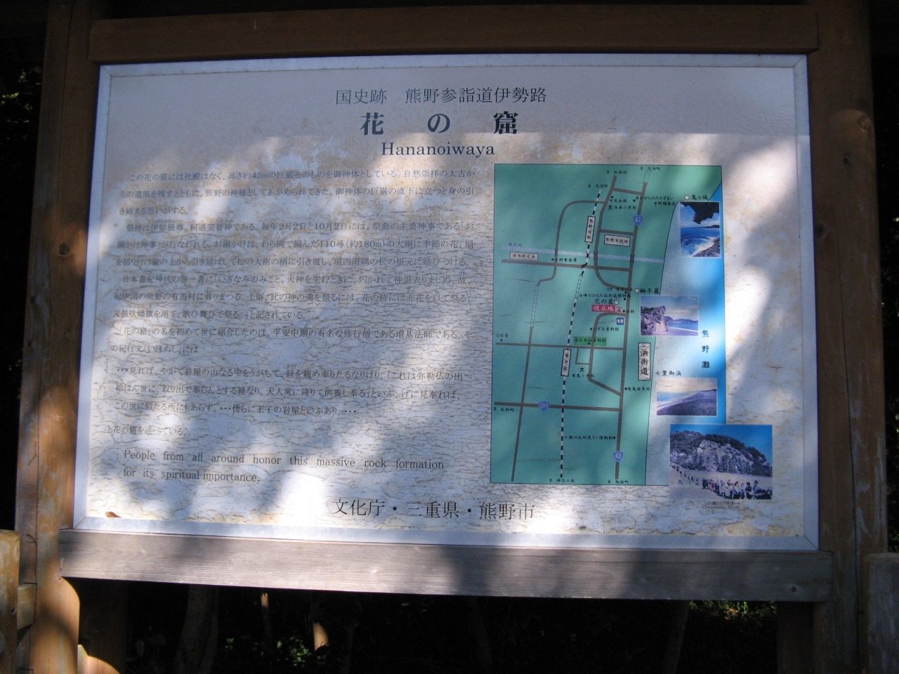 説明板(添付写真参照)には、『ここ、花の窟の前は本宮道と浜街道の分岐点で、人々はともすれば風光明媚な浜街道を選んでしまうため、安全な道は有馬村本街道に廻るよう警告したもの』という説明があります。旅人は景色の良い海岸線に向かいがちというのは昔も今も変わらないという意味で興味深く観ることができました。熊野市指定文化財になっています。- 旅行時期