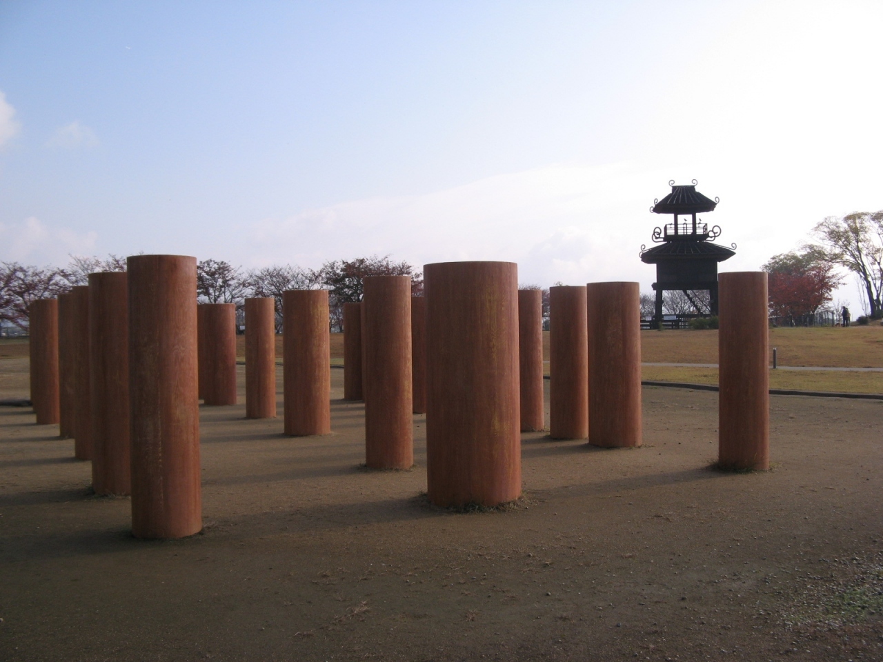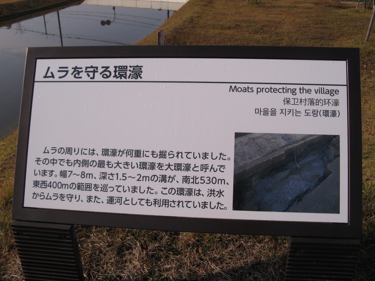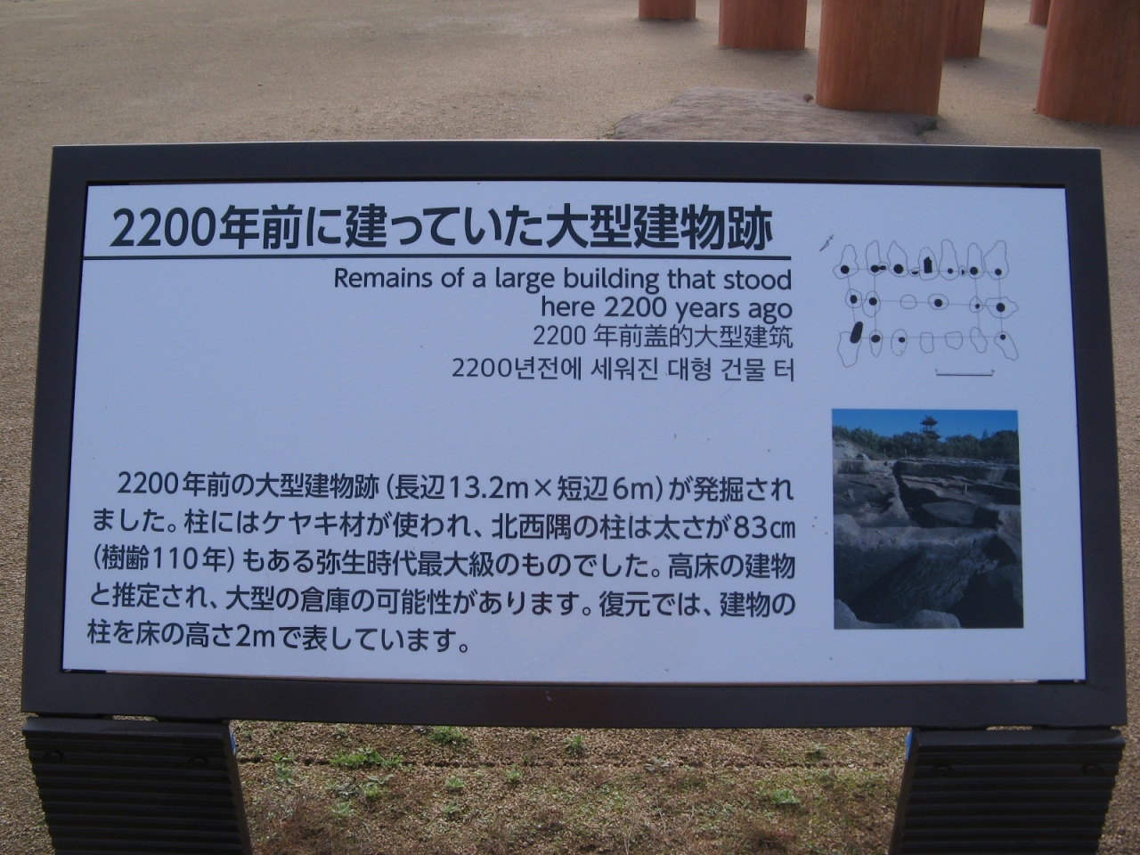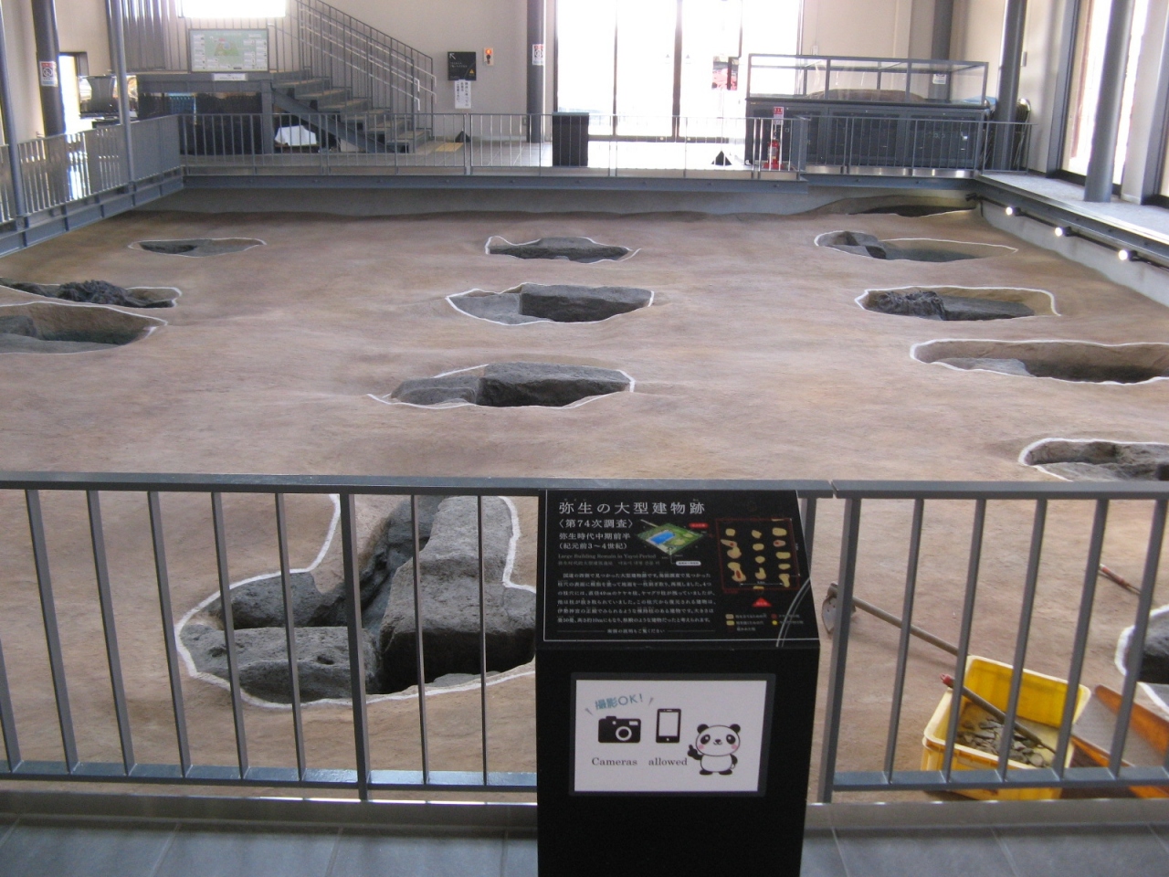 今から約2,000年前の弥生時代に栄えた集落の遺跡です。日本最大級のムラが営まれていたそうで、掘に囲まれた広い場所に大きな建物があったことを示す柱の再現や復元された楼閣などがあります。遺構復元展示館では大型建物の柱跡などが確認できます。