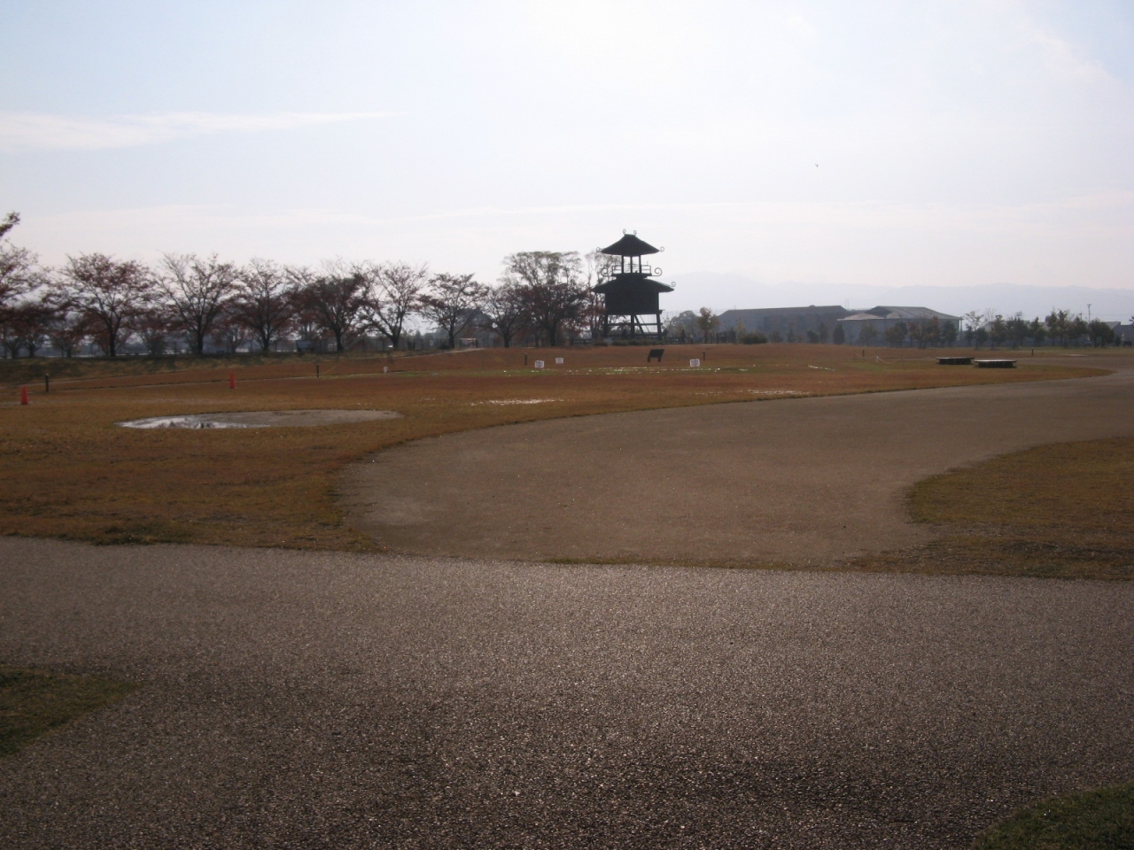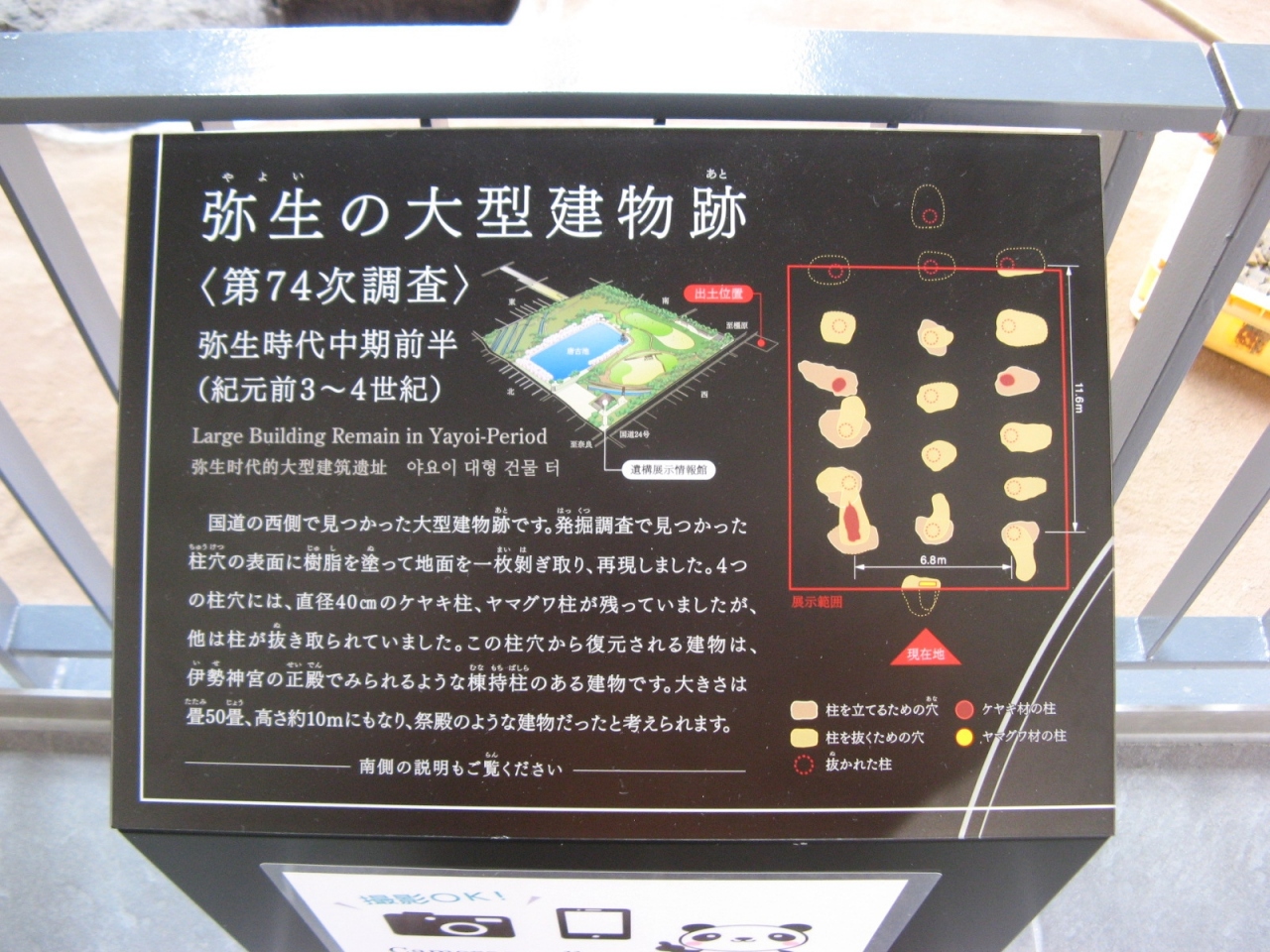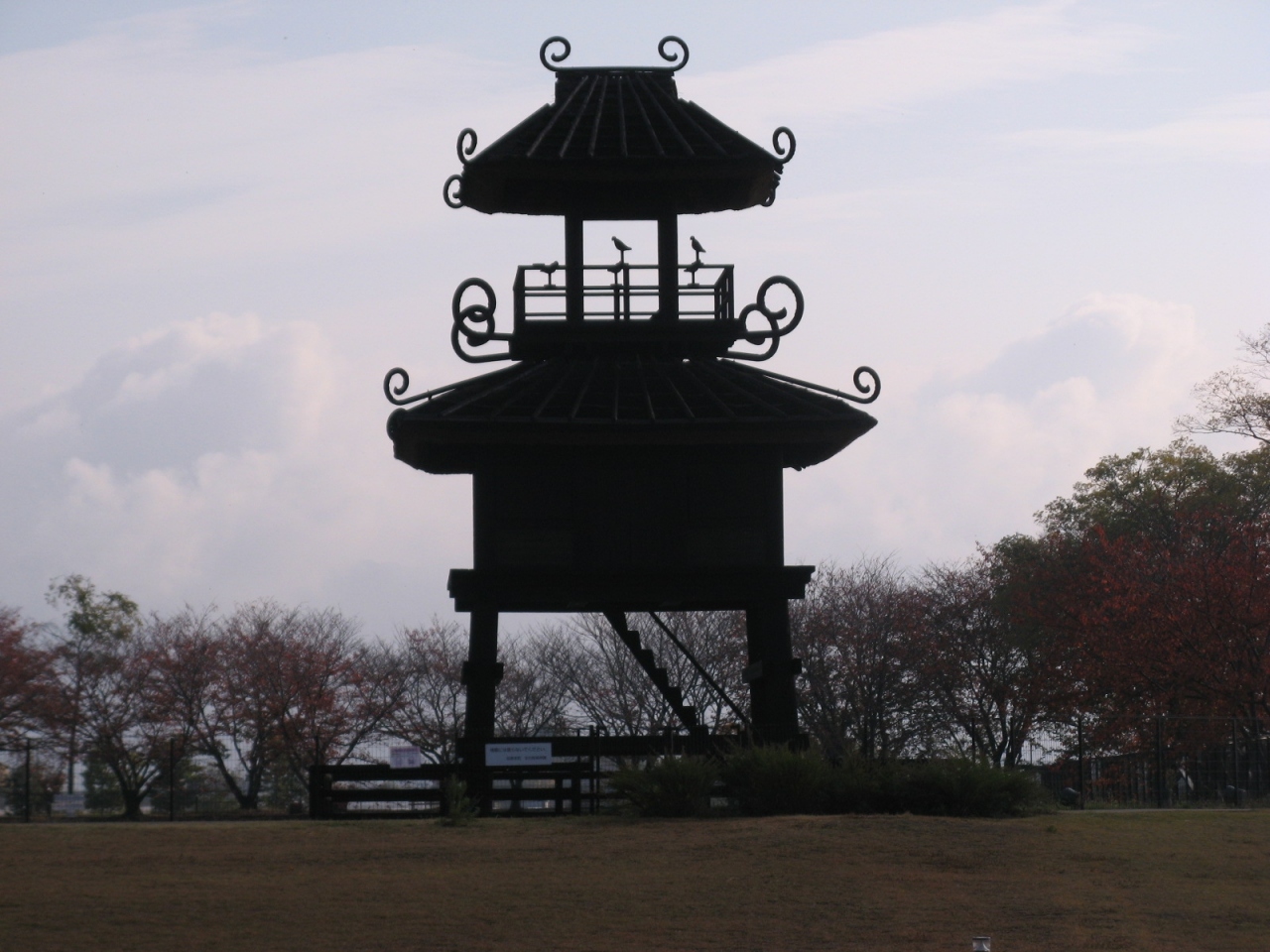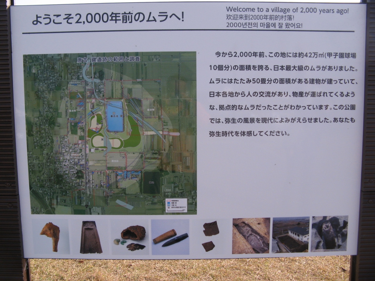 今から約2,000年前の弥生時代に栄えた集落の遺跡です。日本最大級のムラが営まれていたそうで、掘に囲まれた広い場所に大きな建物があったことを示す柱の再現や復元された楼閣などがあります。遺構復元展示館では大型建物の柱跡などが確認できます。