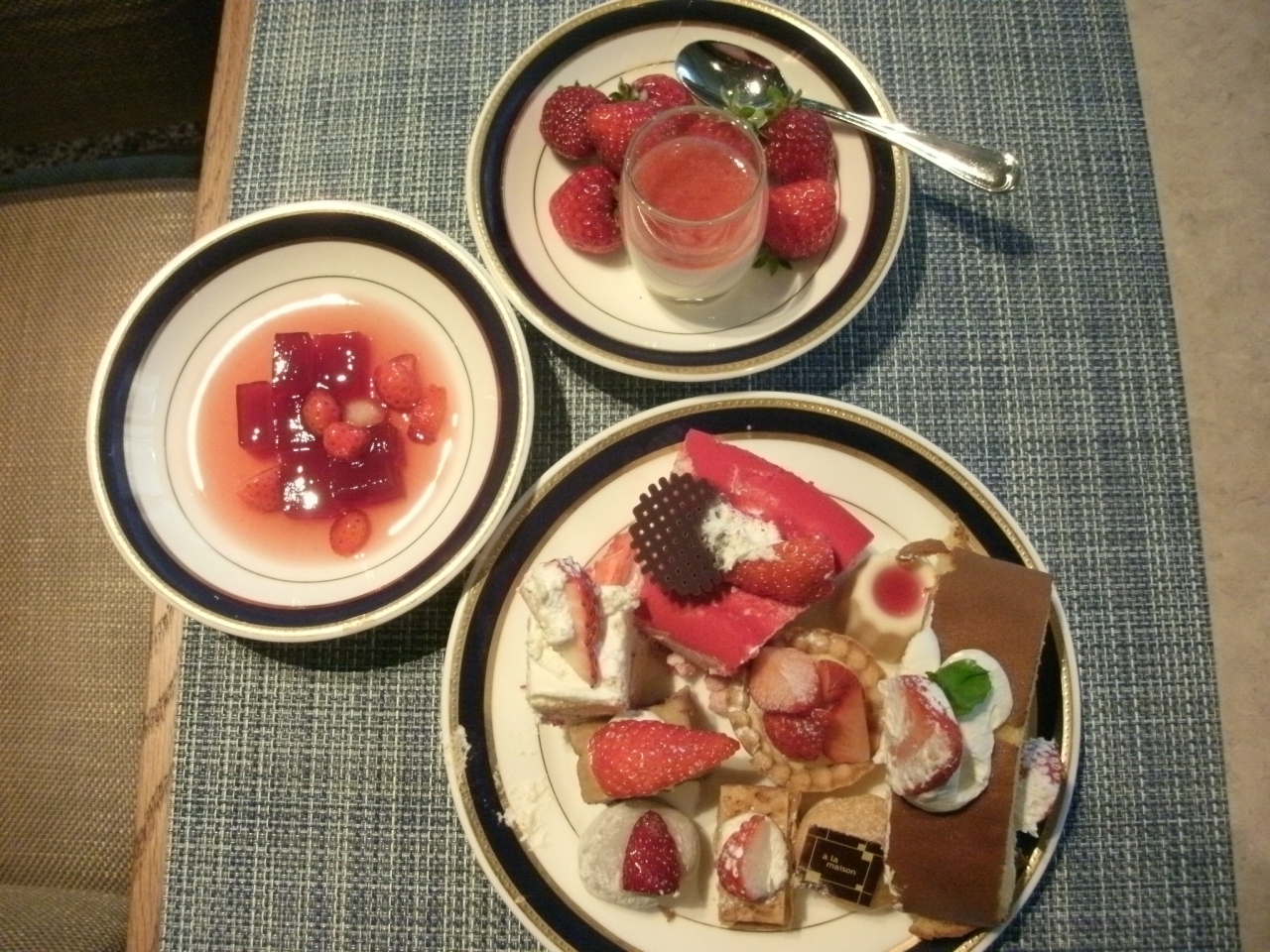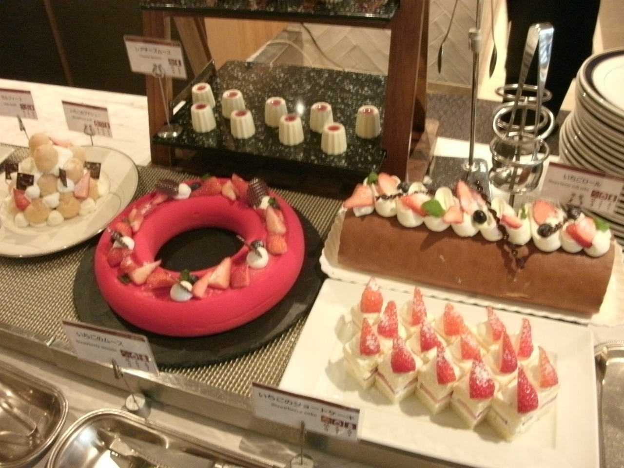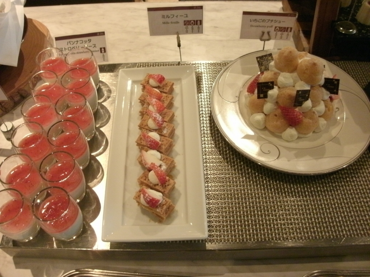 期間限定で開催されている“いちごのスイーツブッフェ(90分制、3500円)”を頂きました。内容は、いちごのスノーボール、パウンドケーキ、マドレーヌ、ヨーグルトのムースなどいちごのケーキ類が21種類とアイスクリーム6種、ソフトクリーム、ストロベリーチョコレートファウンテン。ライトミールとして6種のサンドイッチ、白身魚とエビのボンベイ風、ミートローフ、パスタ、カレーなど。