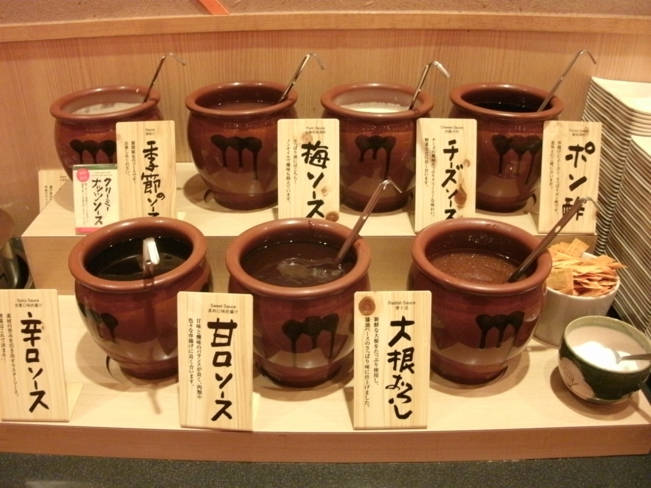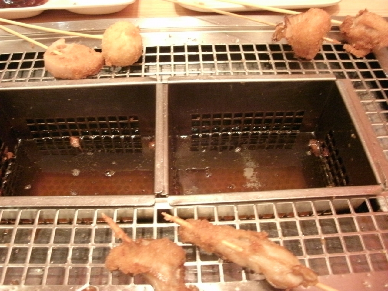 JR京都駅の南側、イオンモールKYOTOの四階・レストラン街にあるビュッフェスタイルの串かつ屋さんです。平日のランチ90分(1,499円+税、ドリンクバー200円+税)に伺いました。海老、牛肉、豚肉、鶏肉、イカ、蓮根、薩摩芋、椎茸、エリンギ、カボチャ、たこ焼き、つくね等、30種類ほどの串ネタを選び、自分のテーブルで衣をつけて揚げるスタイルです。揚げた串は、甘口、辛口、チーズなどのソースやポン酢など食材に合わせて色んな味付けを楽しむことができました。料理の味自体に特筆すべきものはありませんが、自分で好きなものを揚げて、揚げ立てアツアツを頂くというのは、それだけで楽しかったです。ソースの中では、チーズソースと季節のソース(クリーミーナッツソース)が少し変わっていてなかなか美味しかったです。